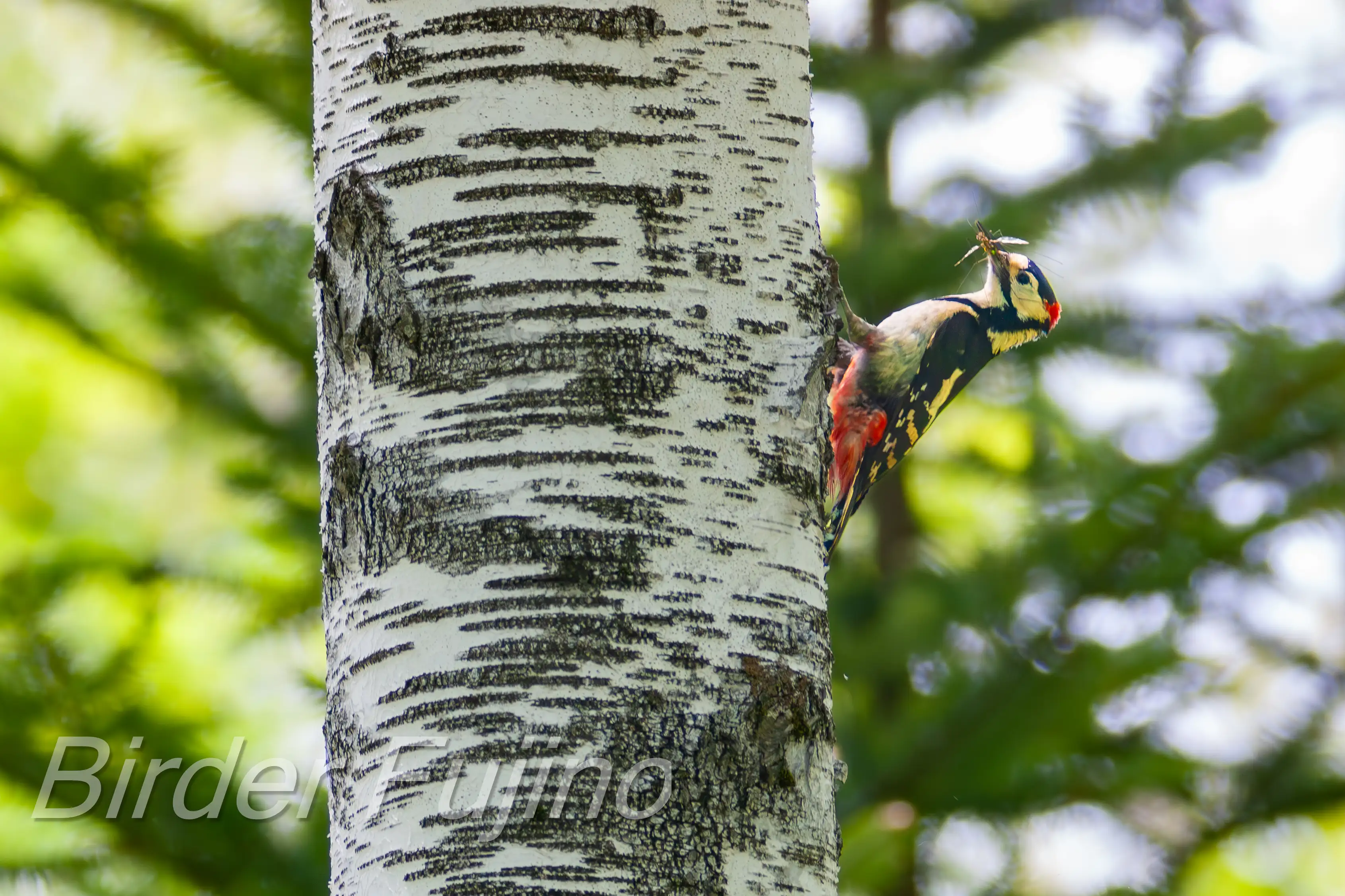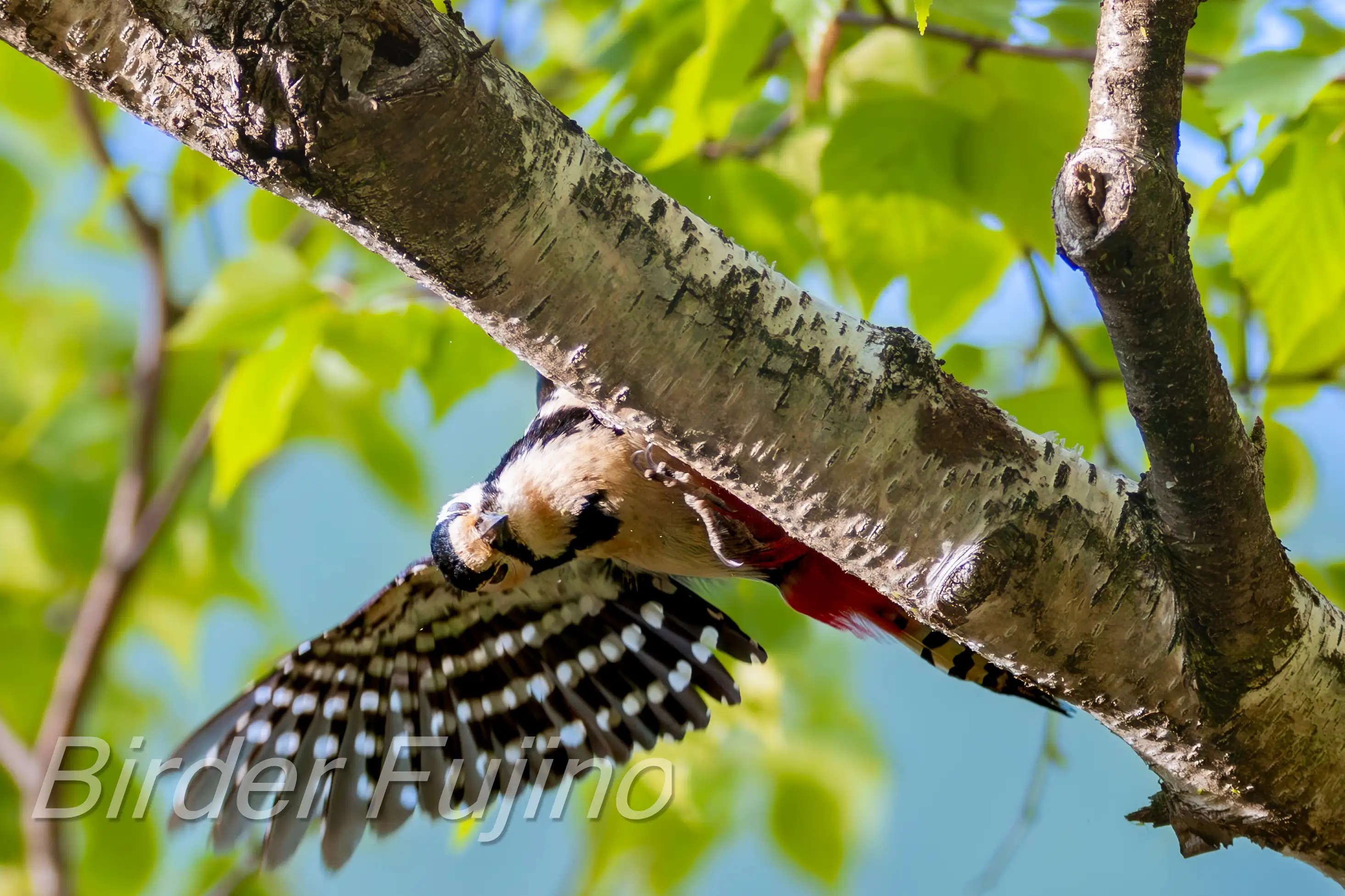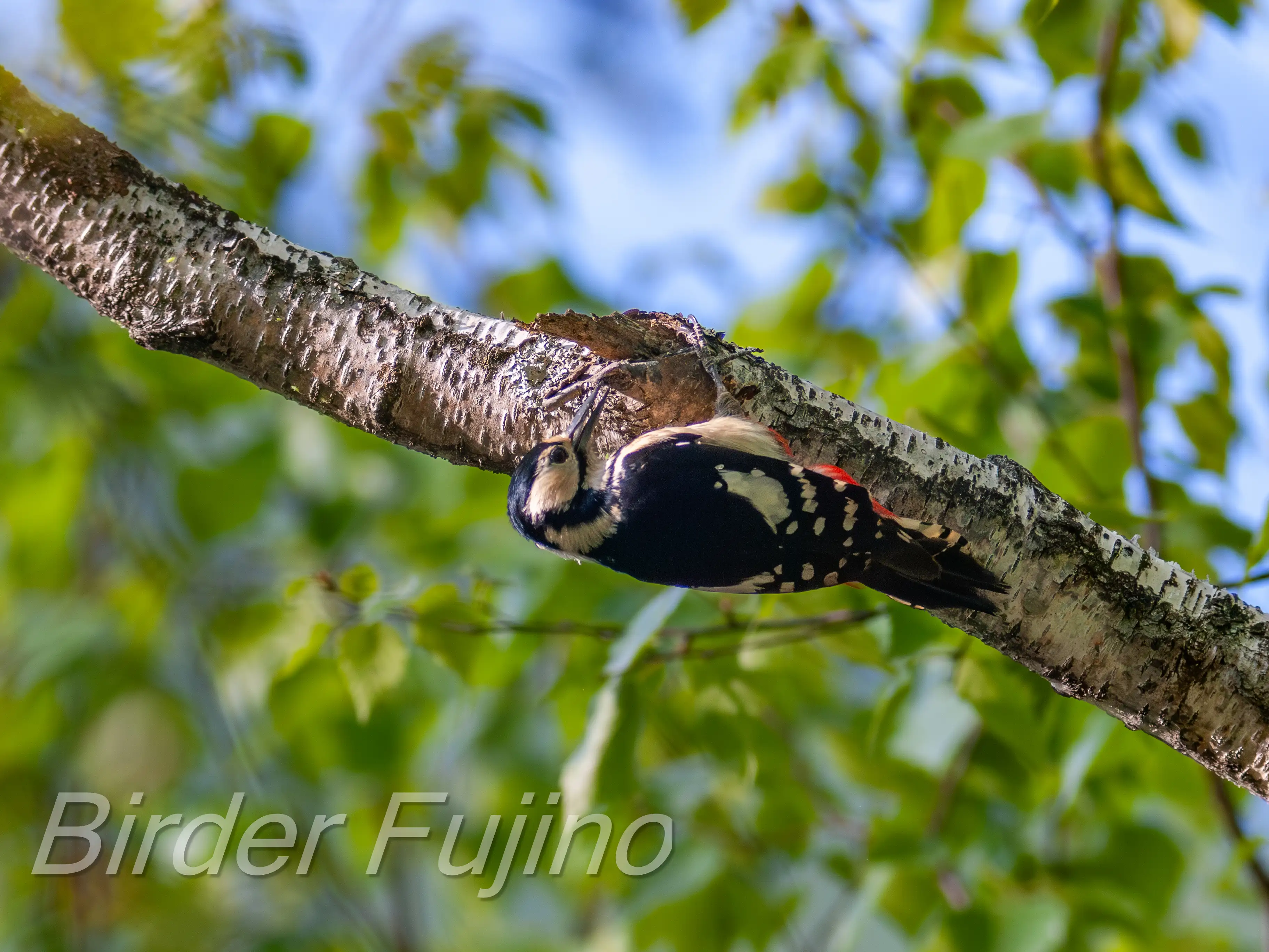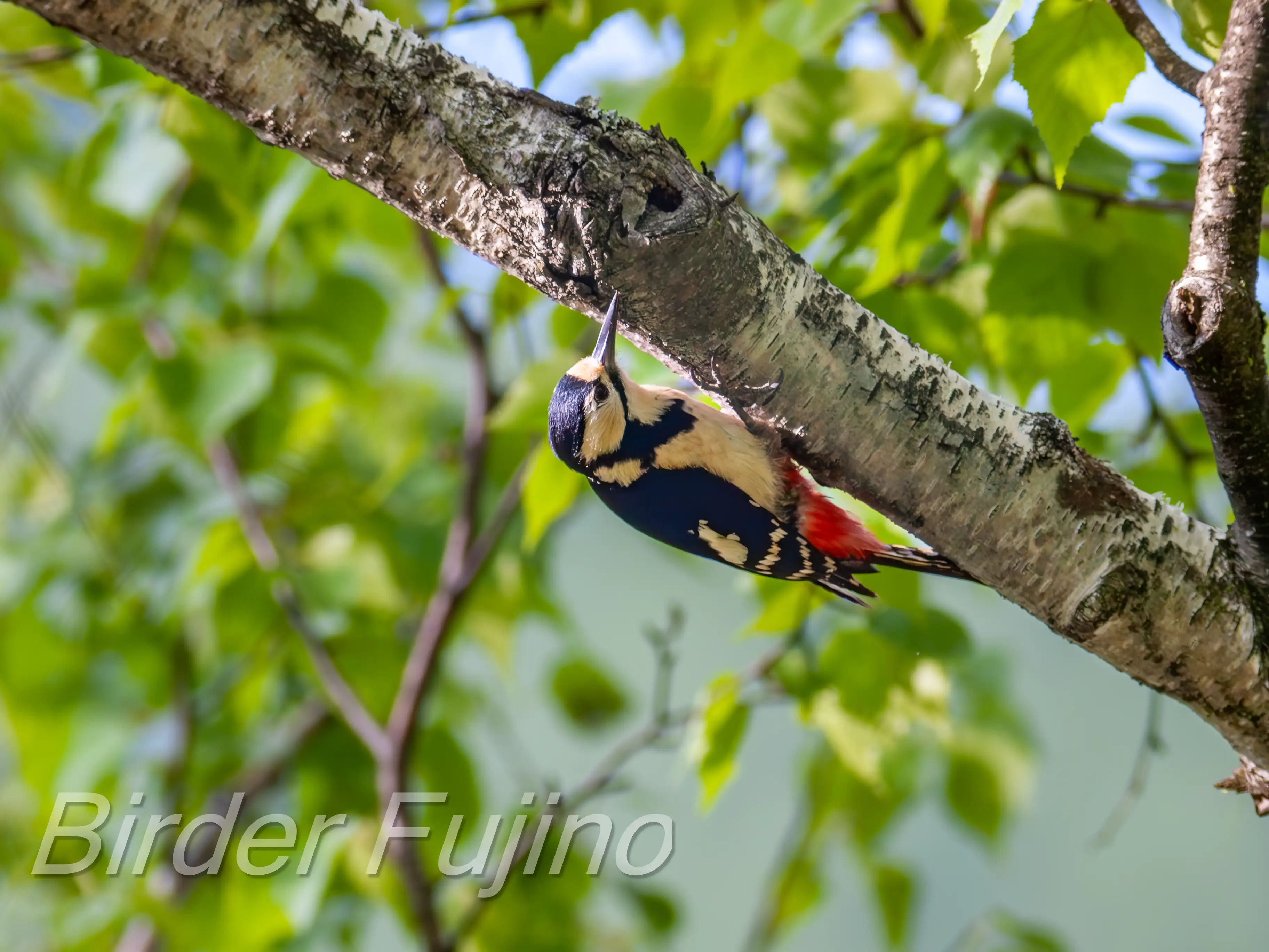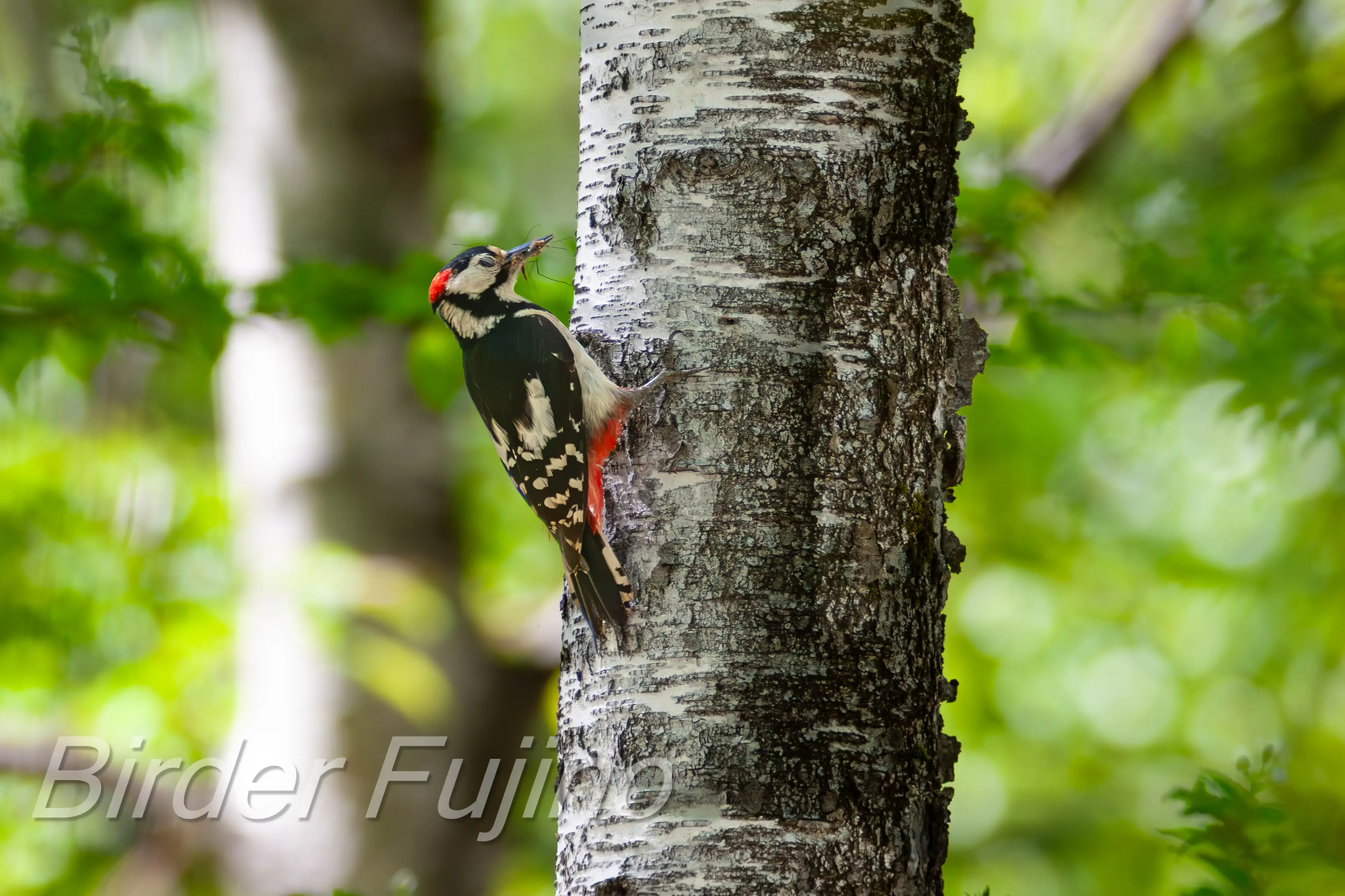 白樺の木をドラミングするアカゲラ、野鳥を撮影する人なら誰もが撮りたいシーンではないでしょうか。