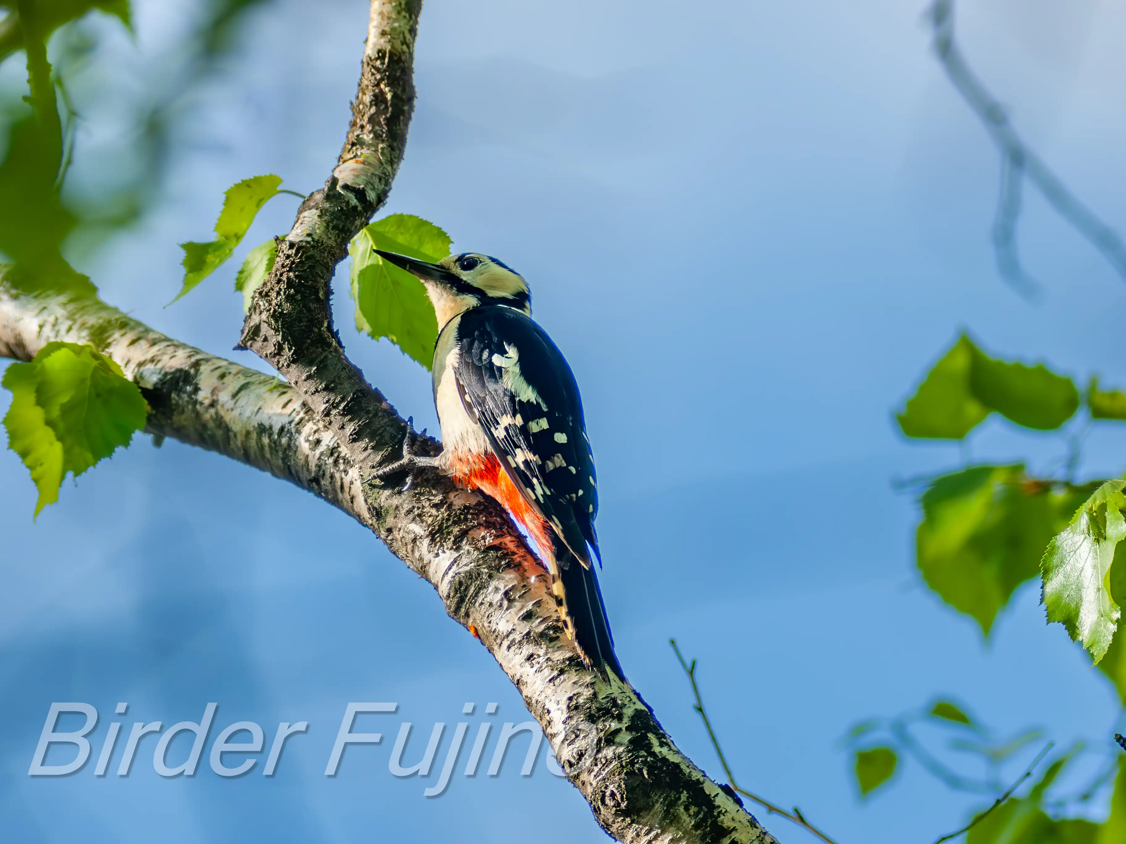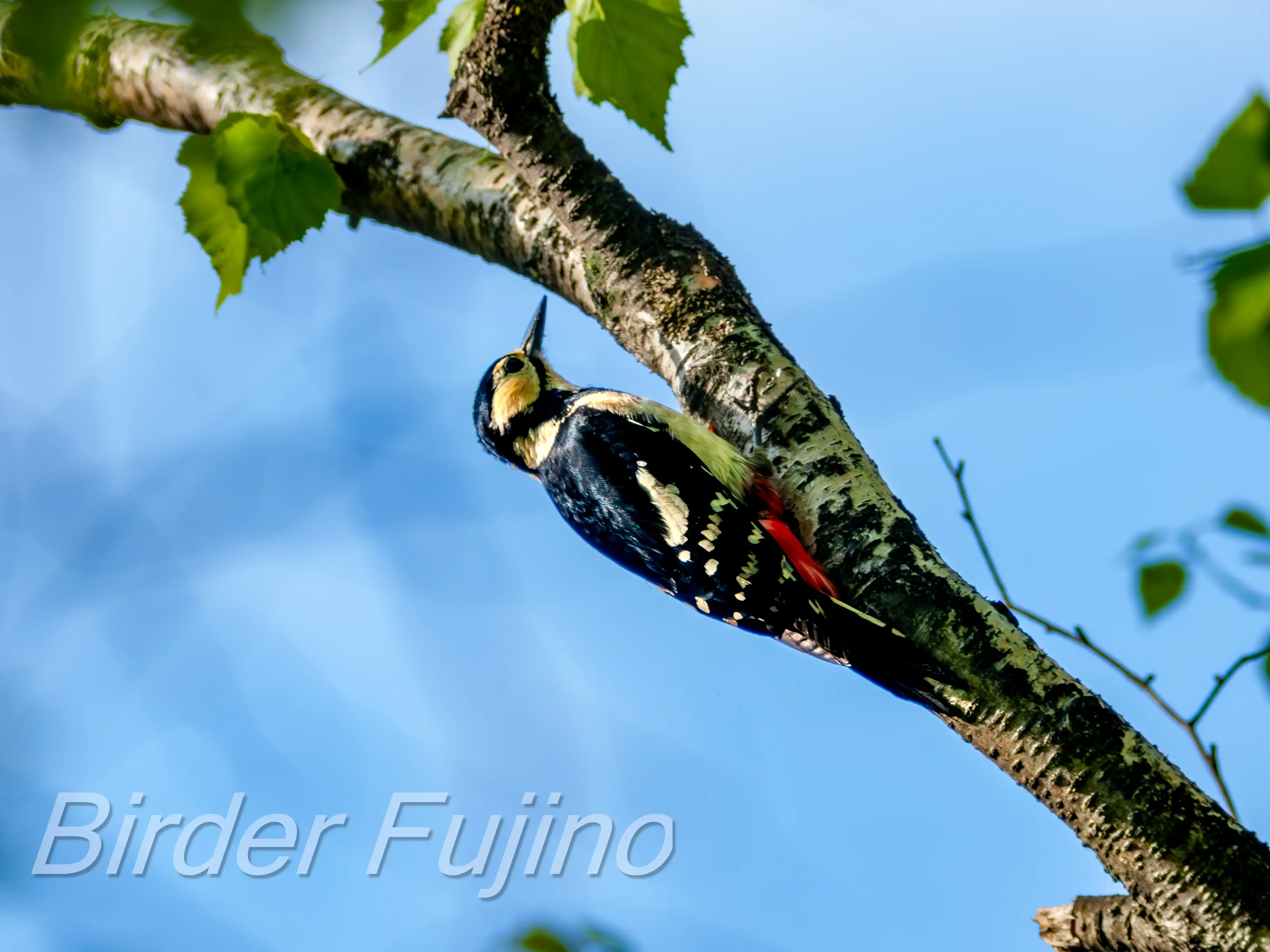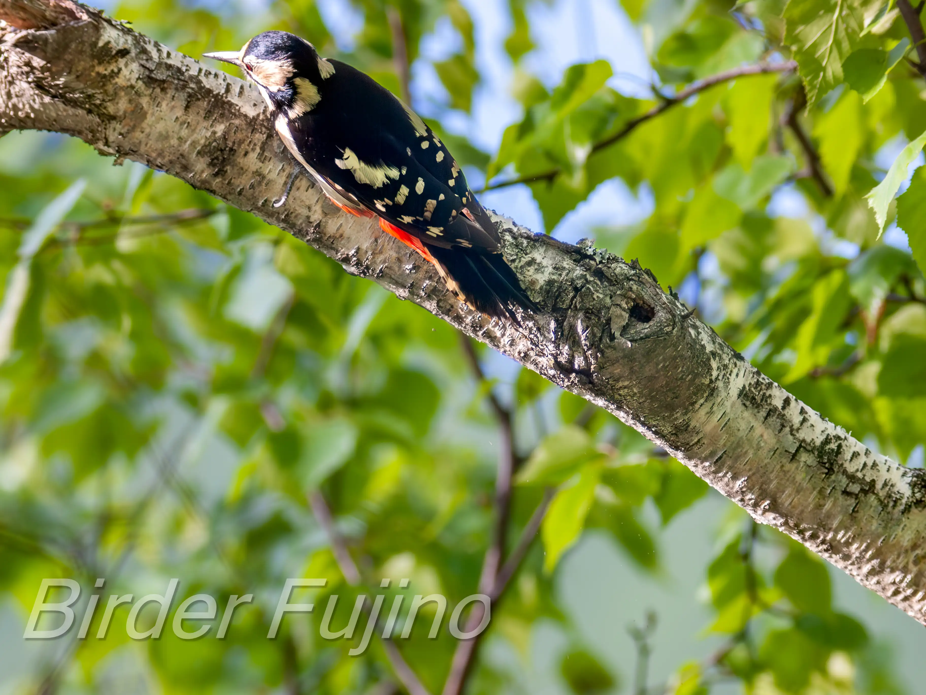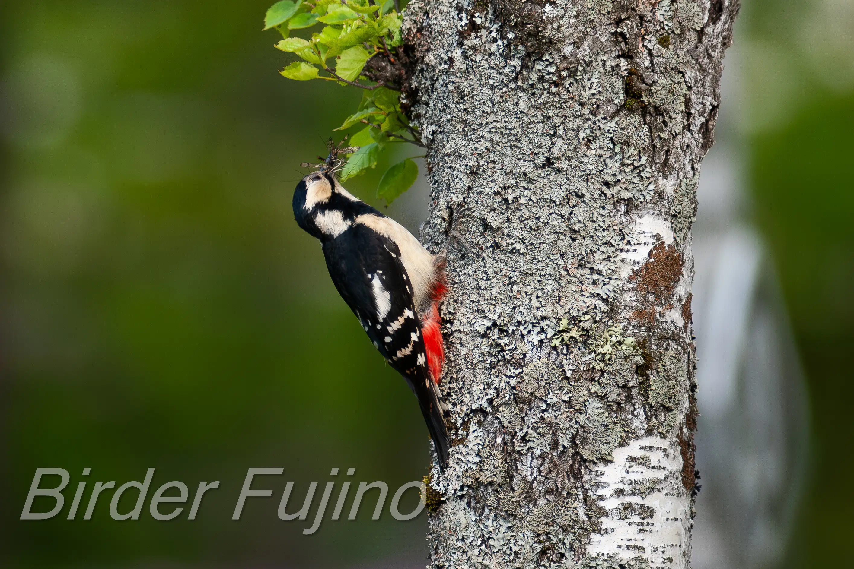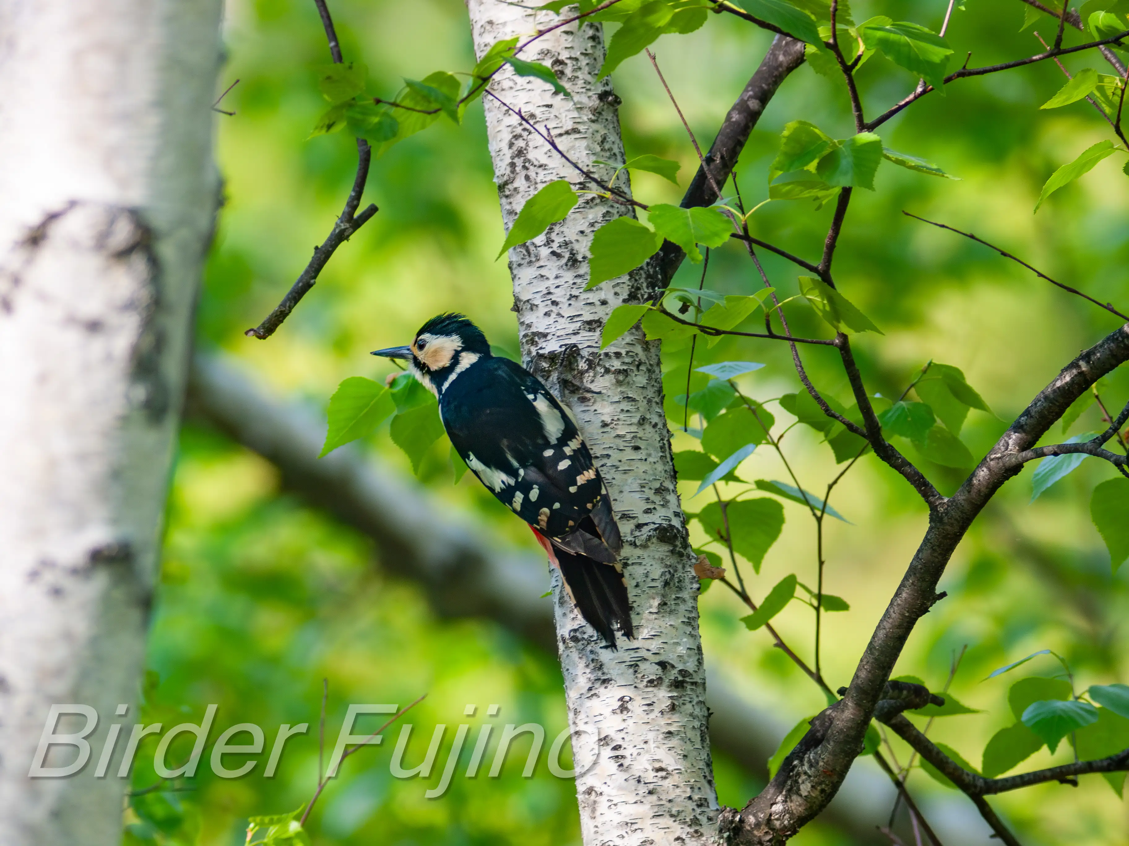 白樺の木をドラミングするアカゲラ、野鳥を撮影する人なら誰もが撮りたいシーンではないでしょうか。