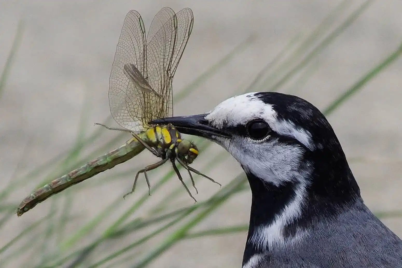 食べ物は地上を歩きながら虫などを捕まえる。飛び上がって蛾を捕まえたり、写真はトンボをくわえたところです。