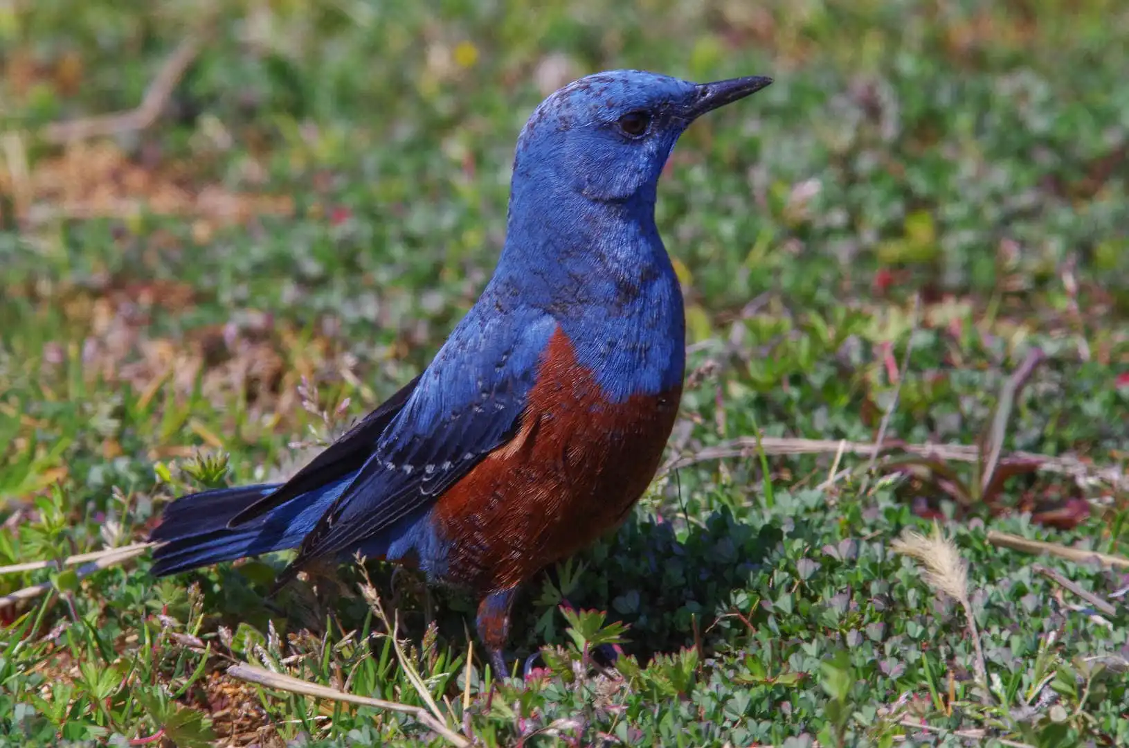 イソヒヨドリは家の近くでも、良く見かける野鳥で、余り綺麗な色だとは思わなかったのですが、ある時山の近くの野原で、背中のブルーが濃く鮮やかで腹の赤茶色のコントラストがきれいなイソヒヨドリの雄が、のんびりと地面の餌を啄んでいる所に出会って撮影出来た。おそらく繁殖時期で色が鮮やかになっていたのだろう。