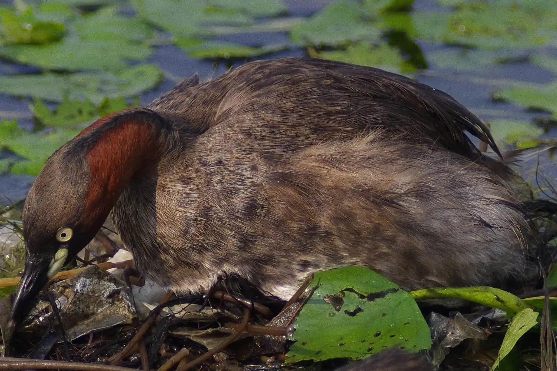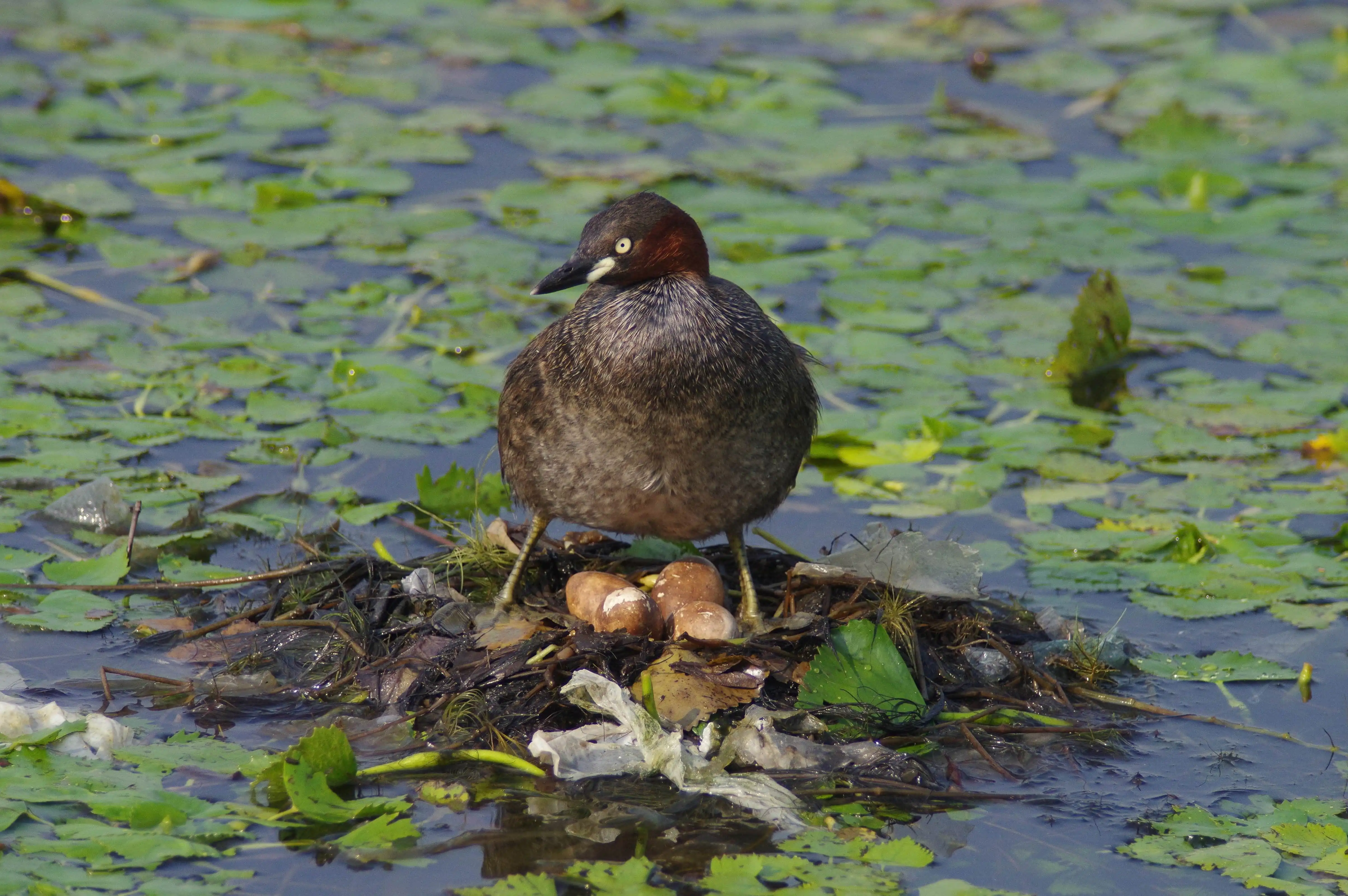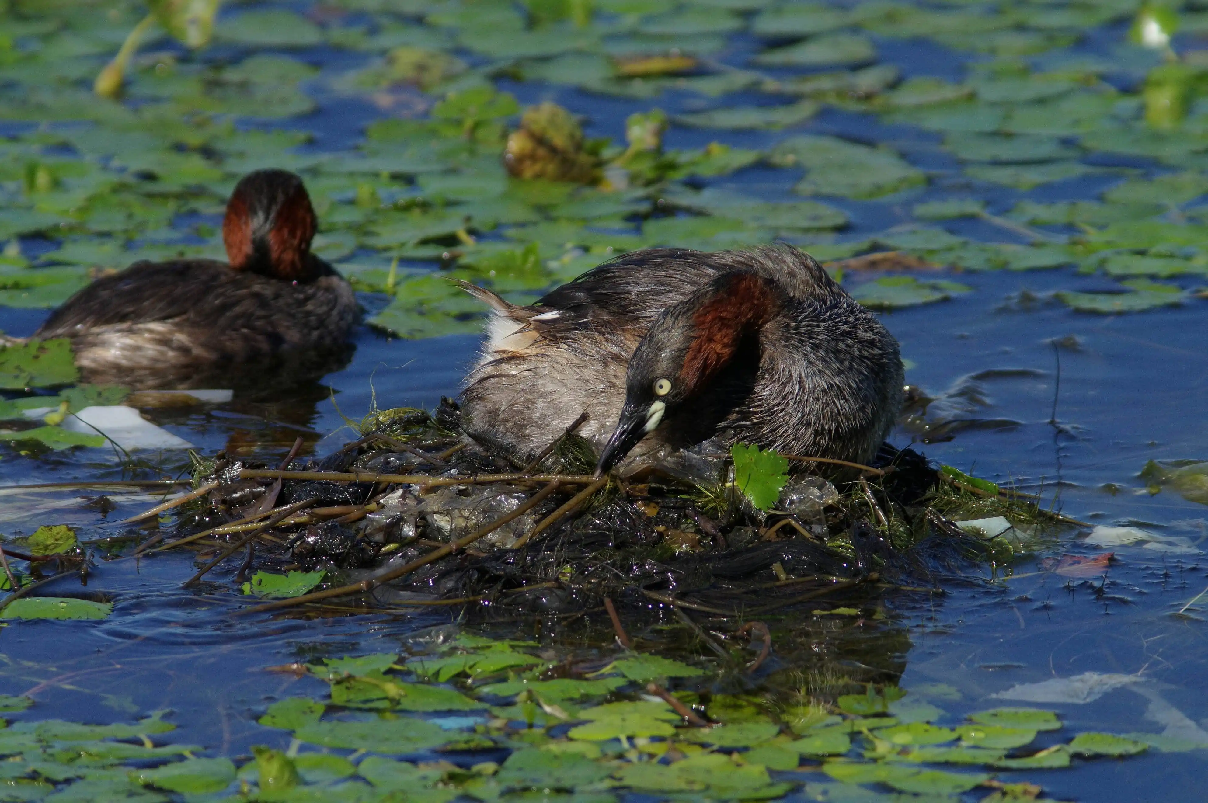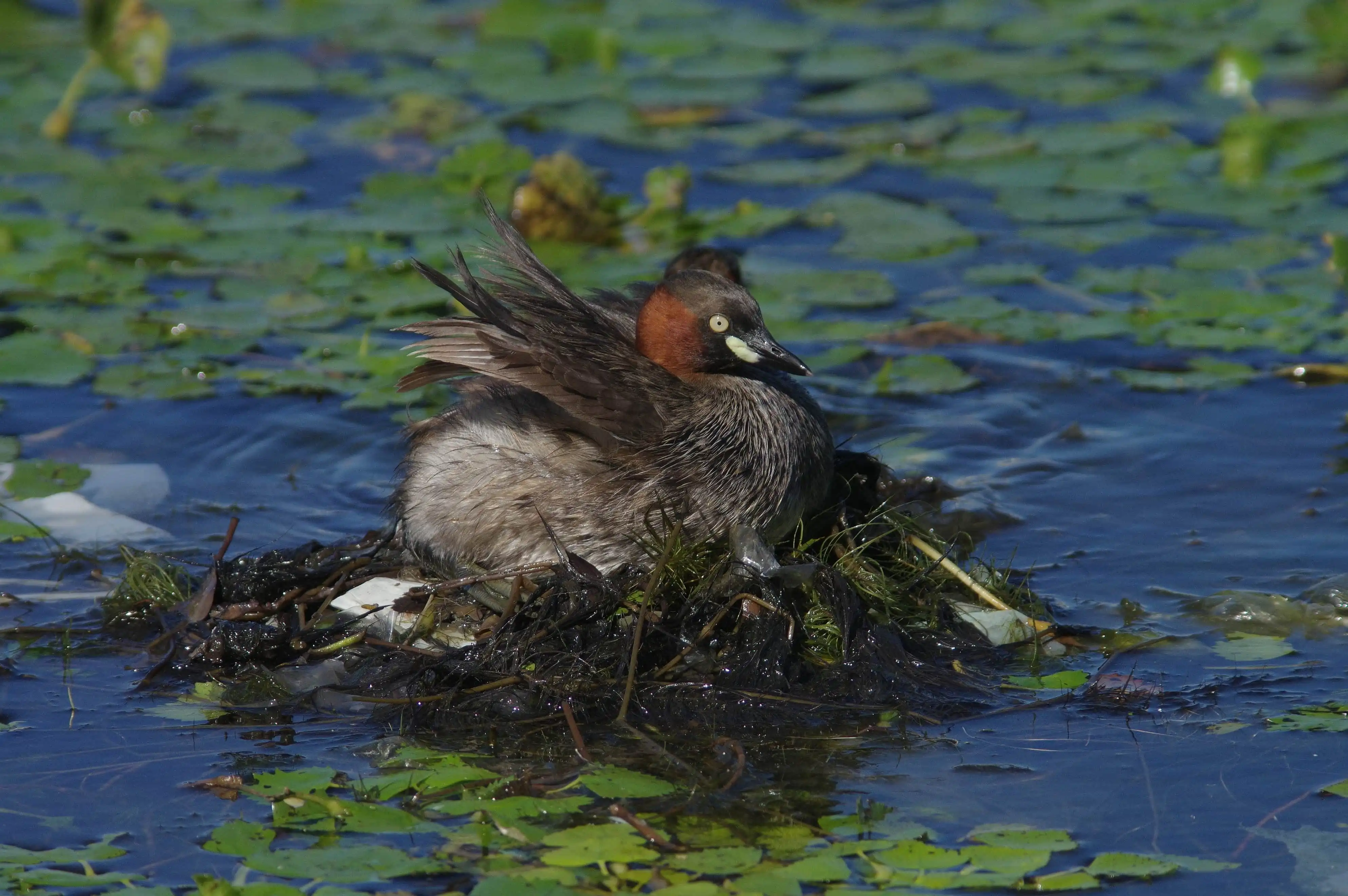 繁殖は早くて5月頃、池に水生植物が広がる頃になると、所々にカイツブリの浮巣が盛り上がって見えるようになります。 卵は、雄と雌が交代で抱卵し、初夏にはカイツブリの雛が、泳ぐ親鳥の背中にチョコンと乗っている姿は何とも可愛いものです。 毎年池に巣が見えると、いそいそとカイツブリの撮影に通います。