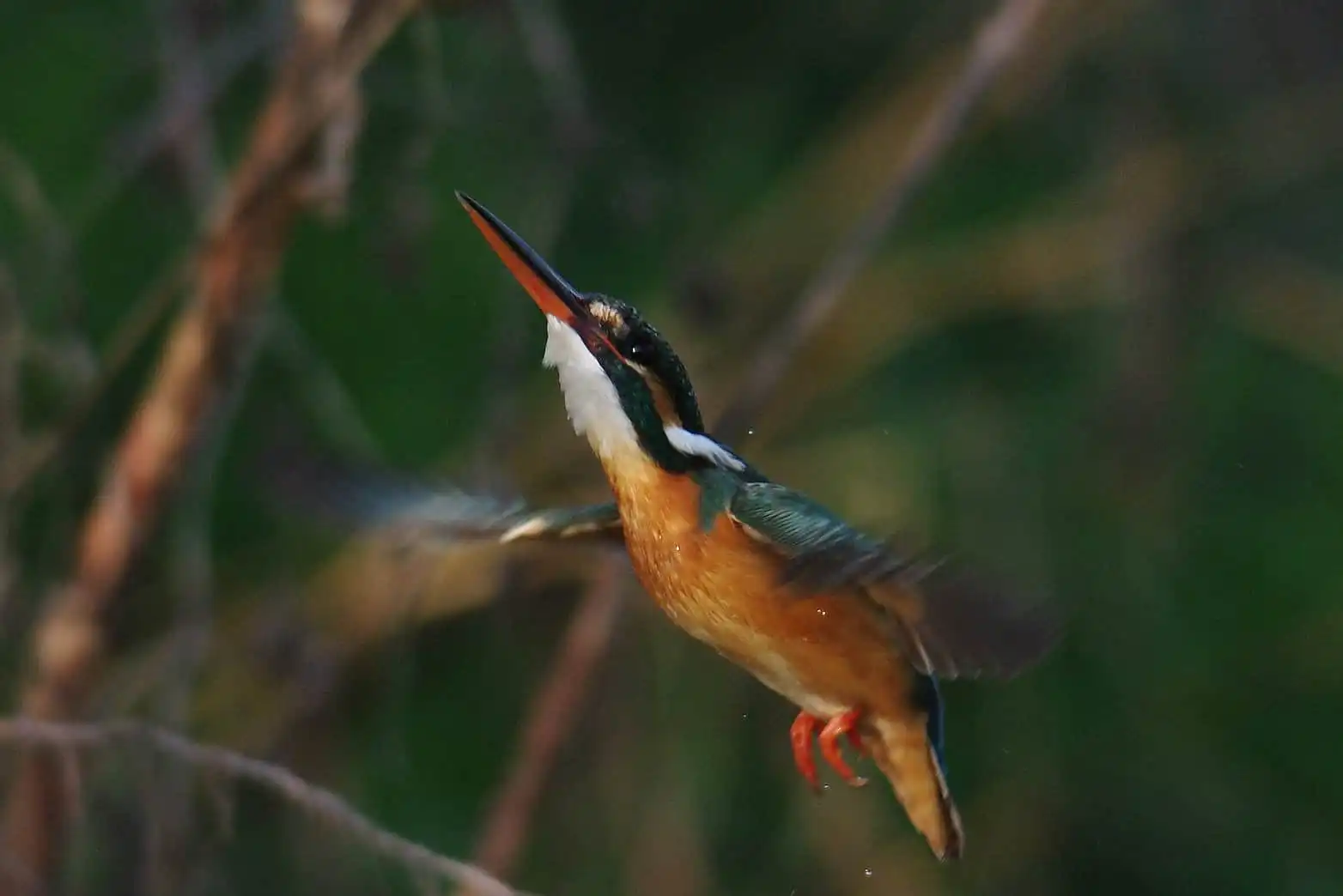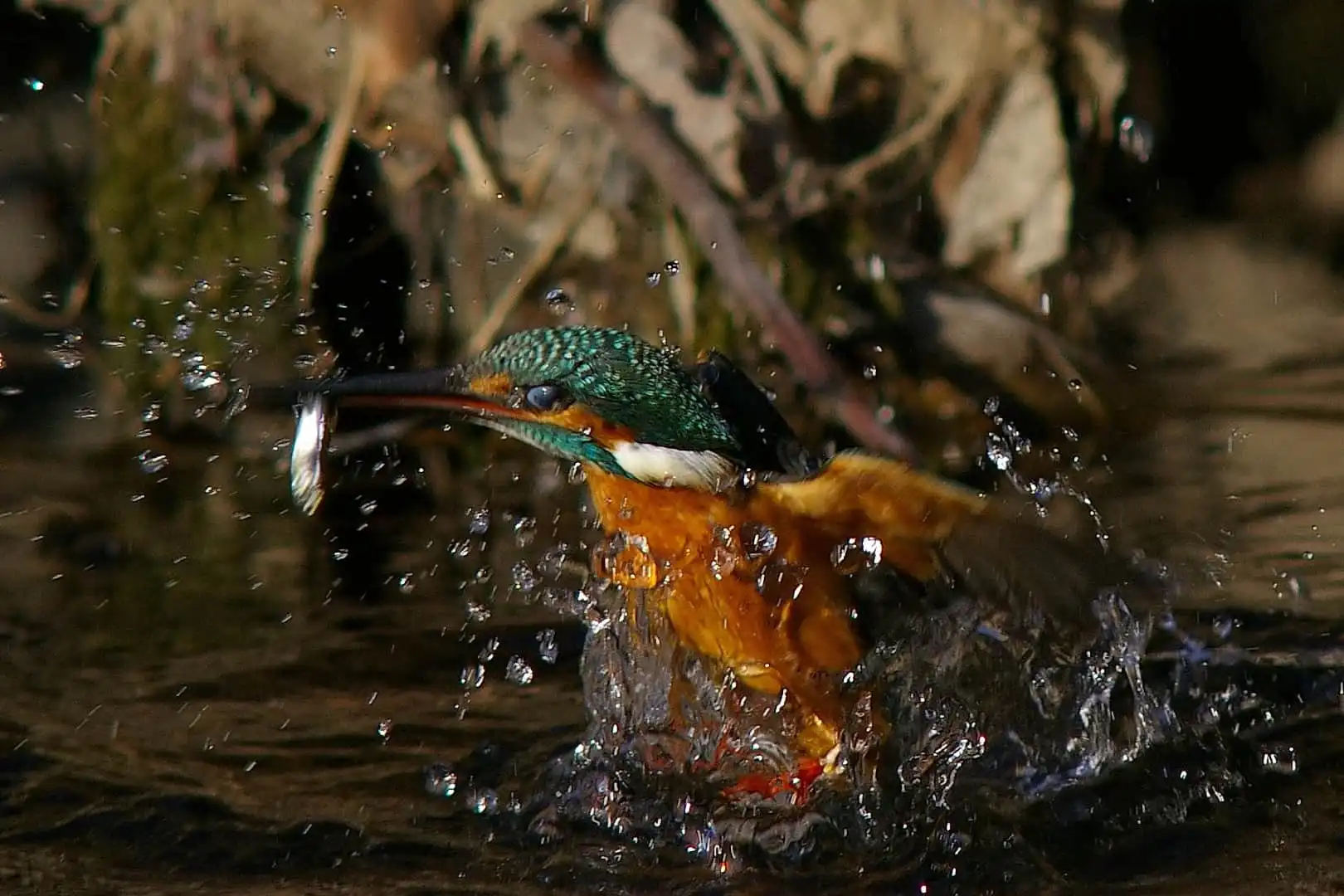 ダイブ画像、止まり木から飛び込んだカワセミが、獲物を捕獲して下の太い木の上で食事し、また、元の止まり木に戻る。この同じ行動パターンの繰り返しを狙った写真です。