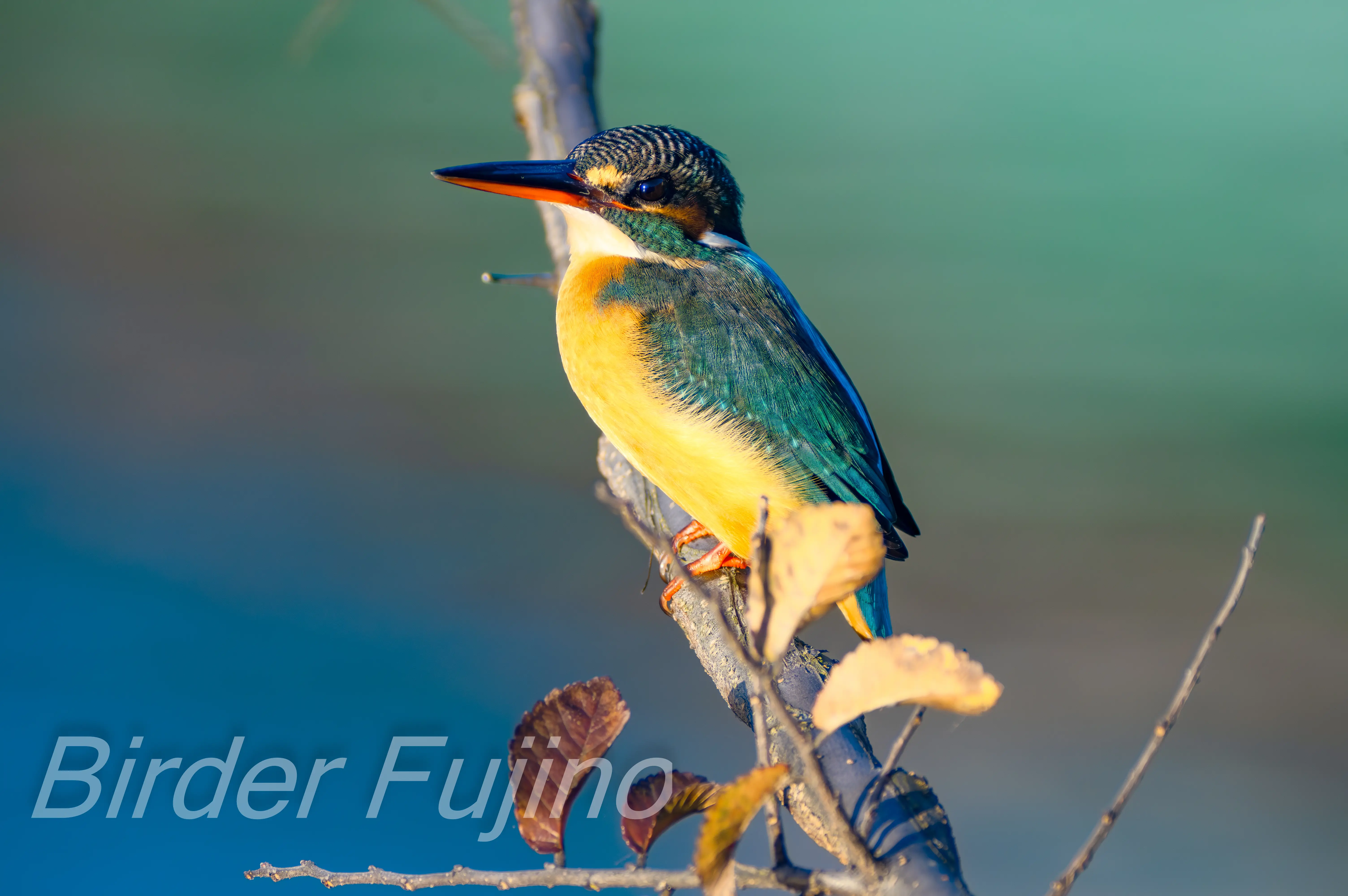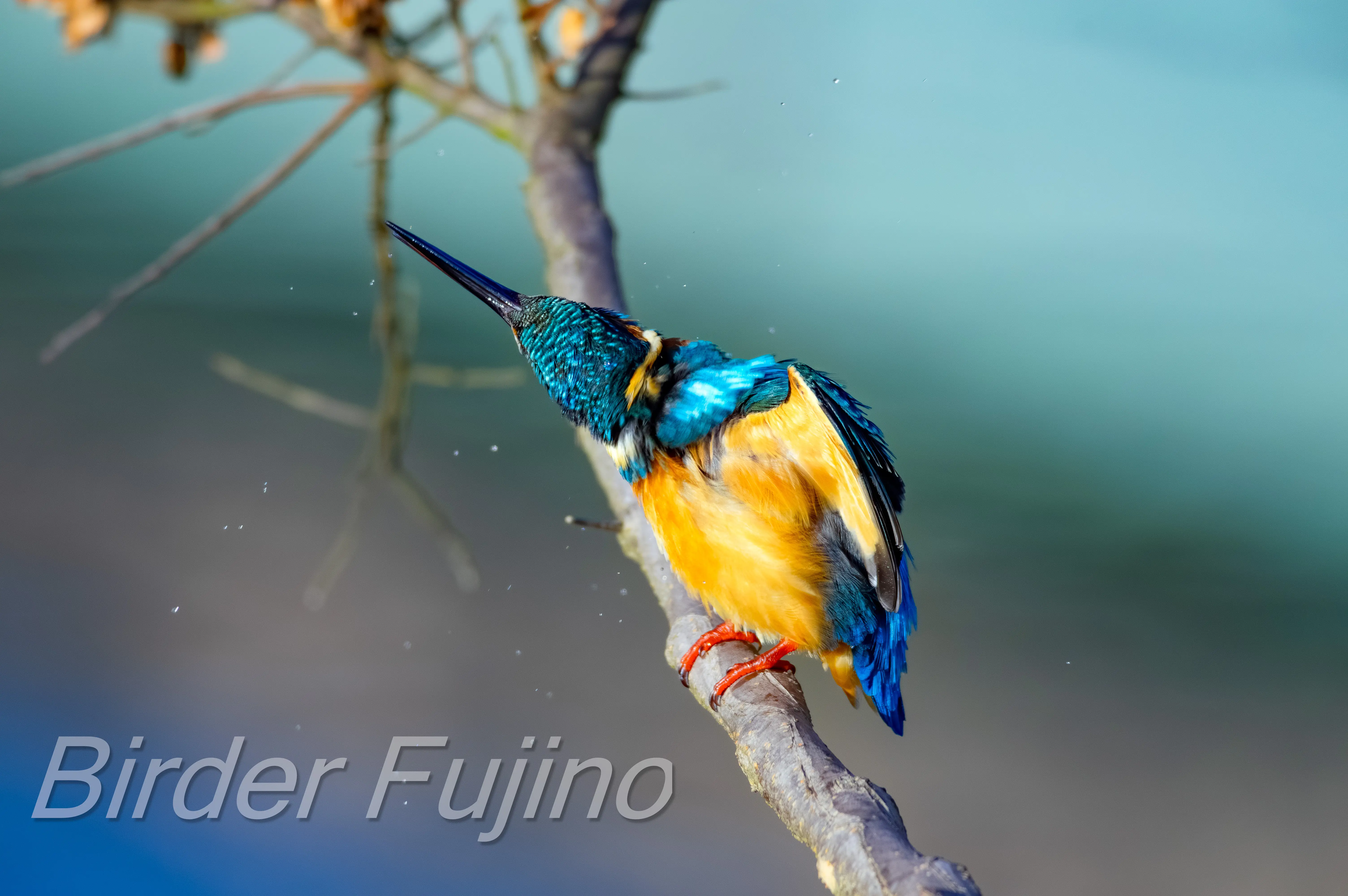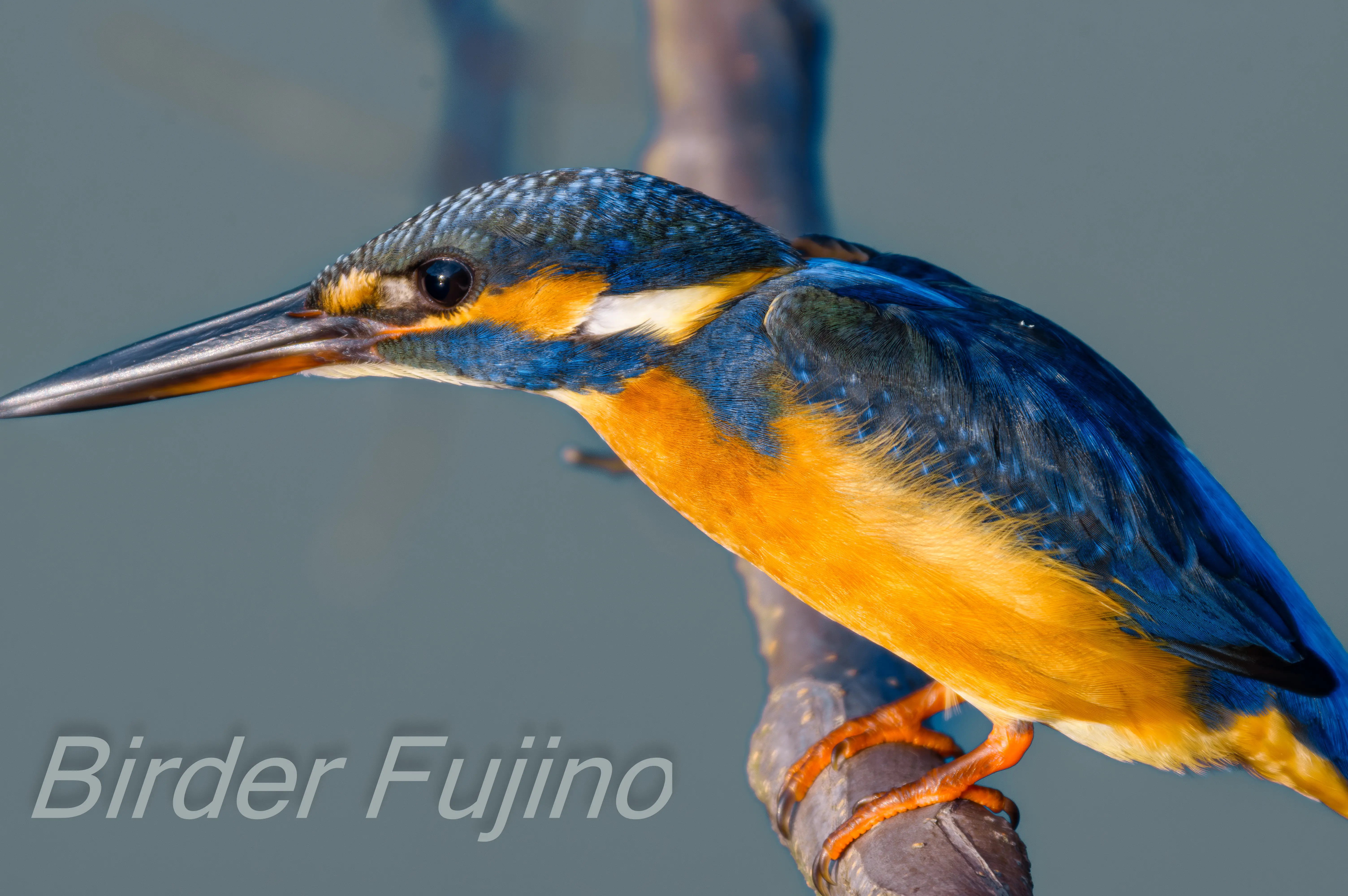 早朝のカワセミ。カワセミは光の加減で色が変わりますが、この個体は足も羽毛もまだくすんだ色をした幼鳥のようです。背景は水面ですが、背景が水面の場合は写り方が様々です。