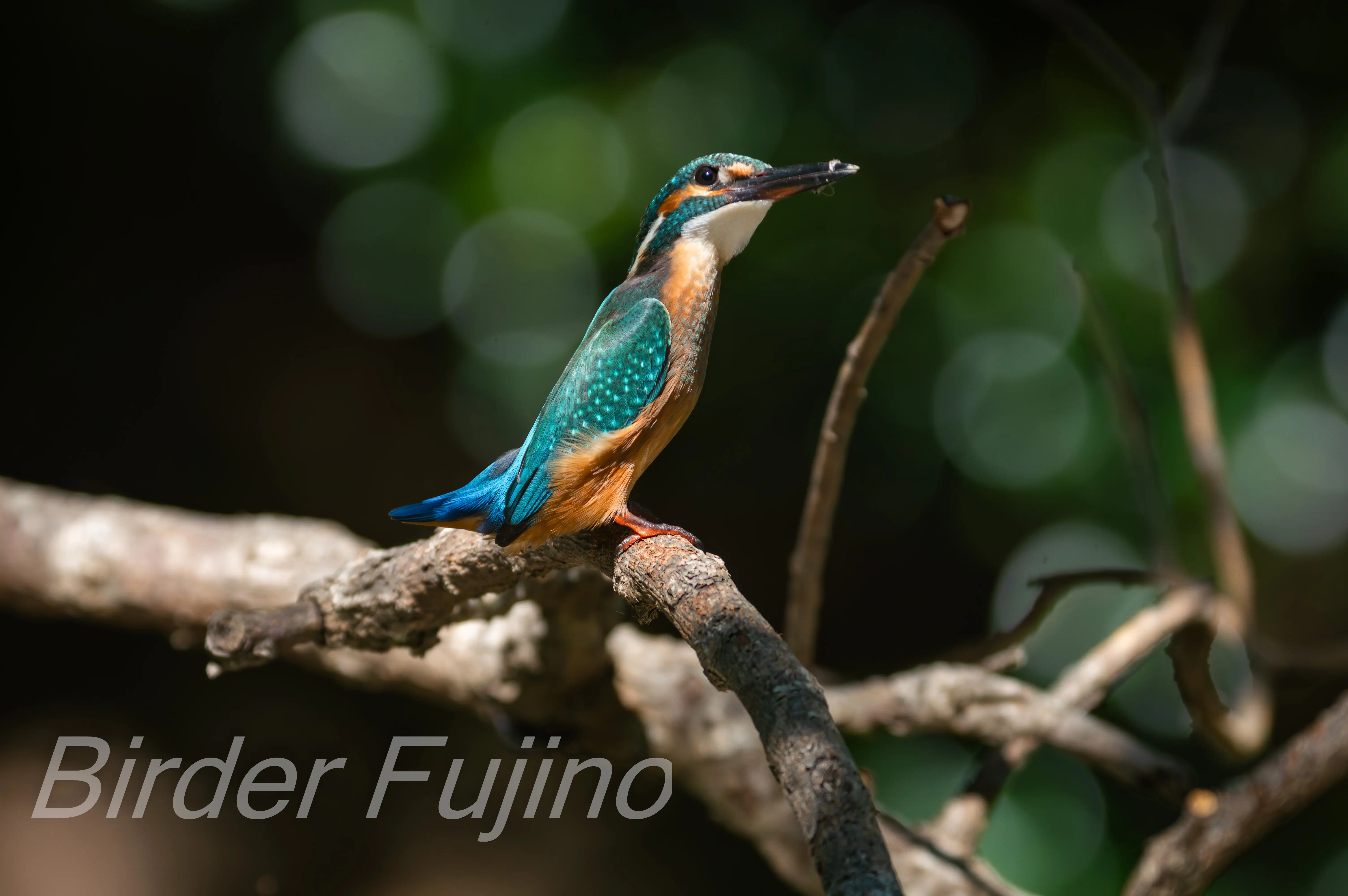 朝日を浴びたカワセミ BLANCA-70ED PENTAX K-3。カワセミの正面から出た朝日がスポットライトのようにカワセミを照らしています。