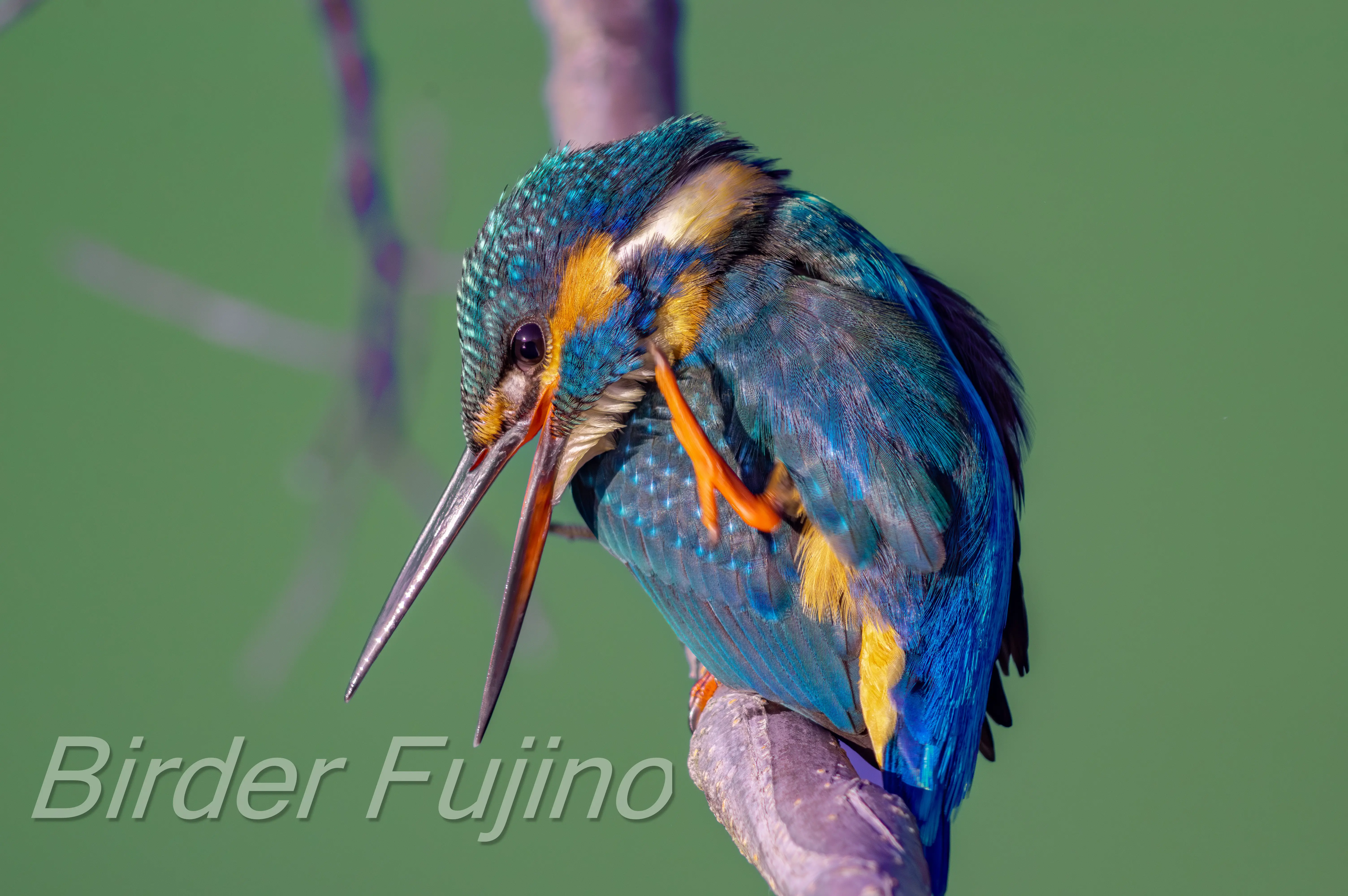 カワセミのバストアップの羽繕いシーン(ノートリ)です。カワセミが1センチ頭を動かすと肝心なところにピントが合わないのでヤマ勘で置きピンです。