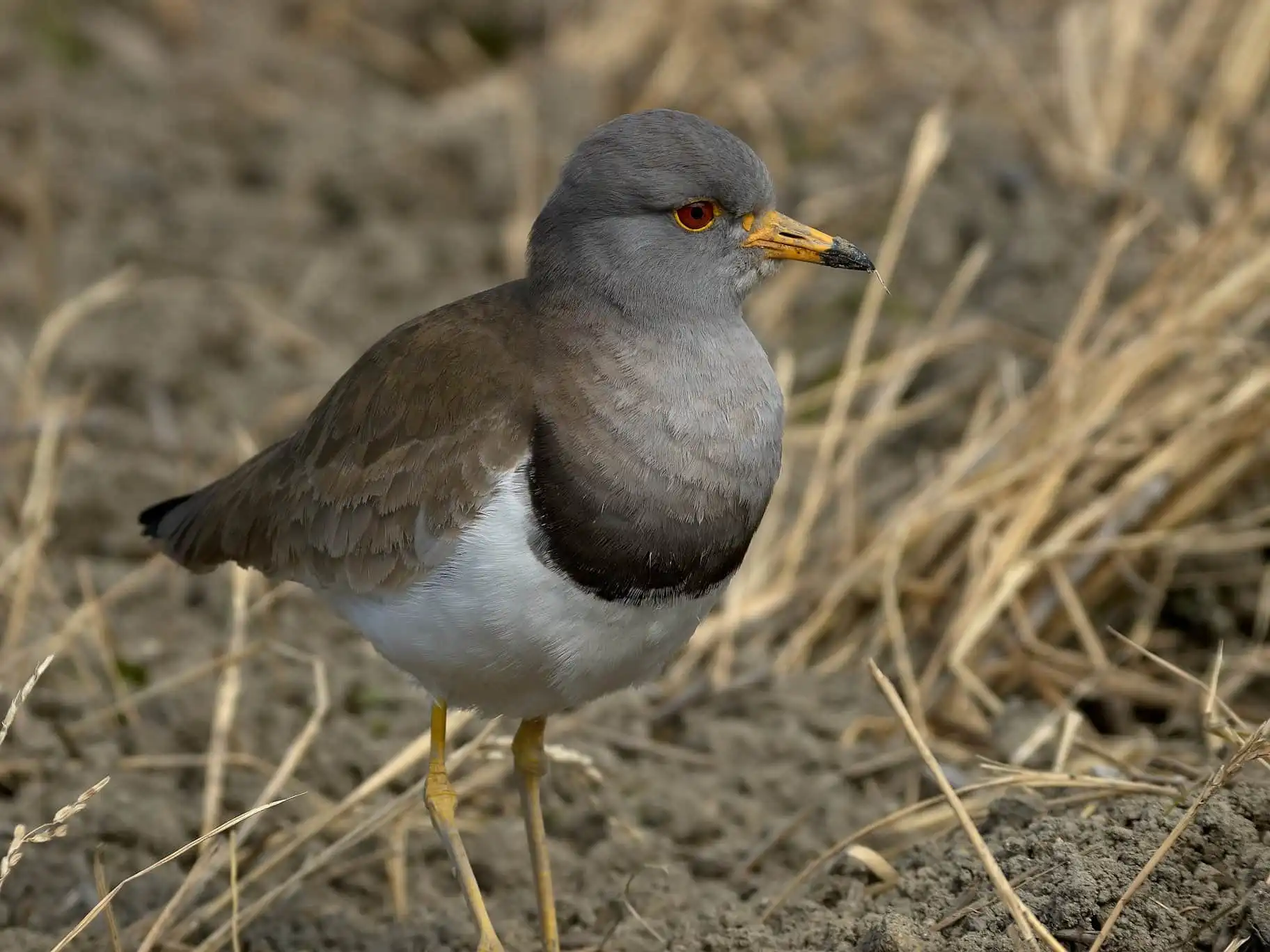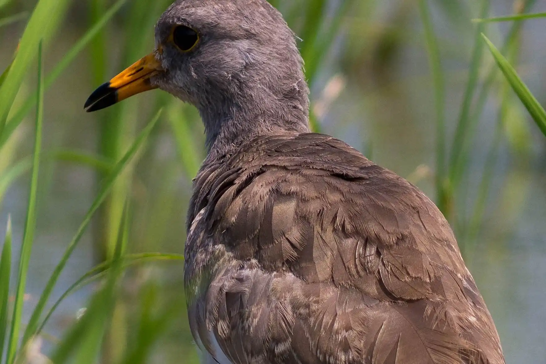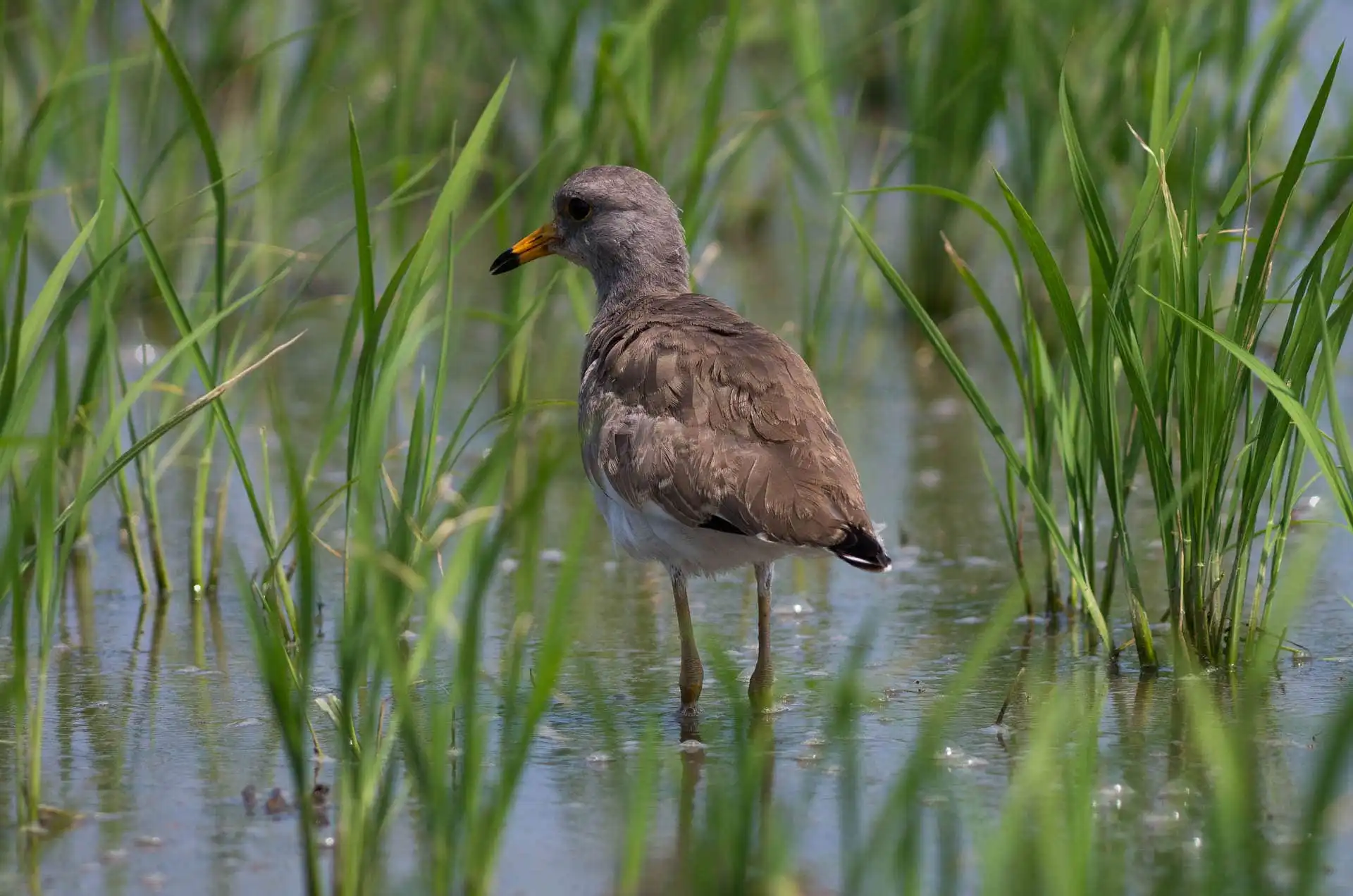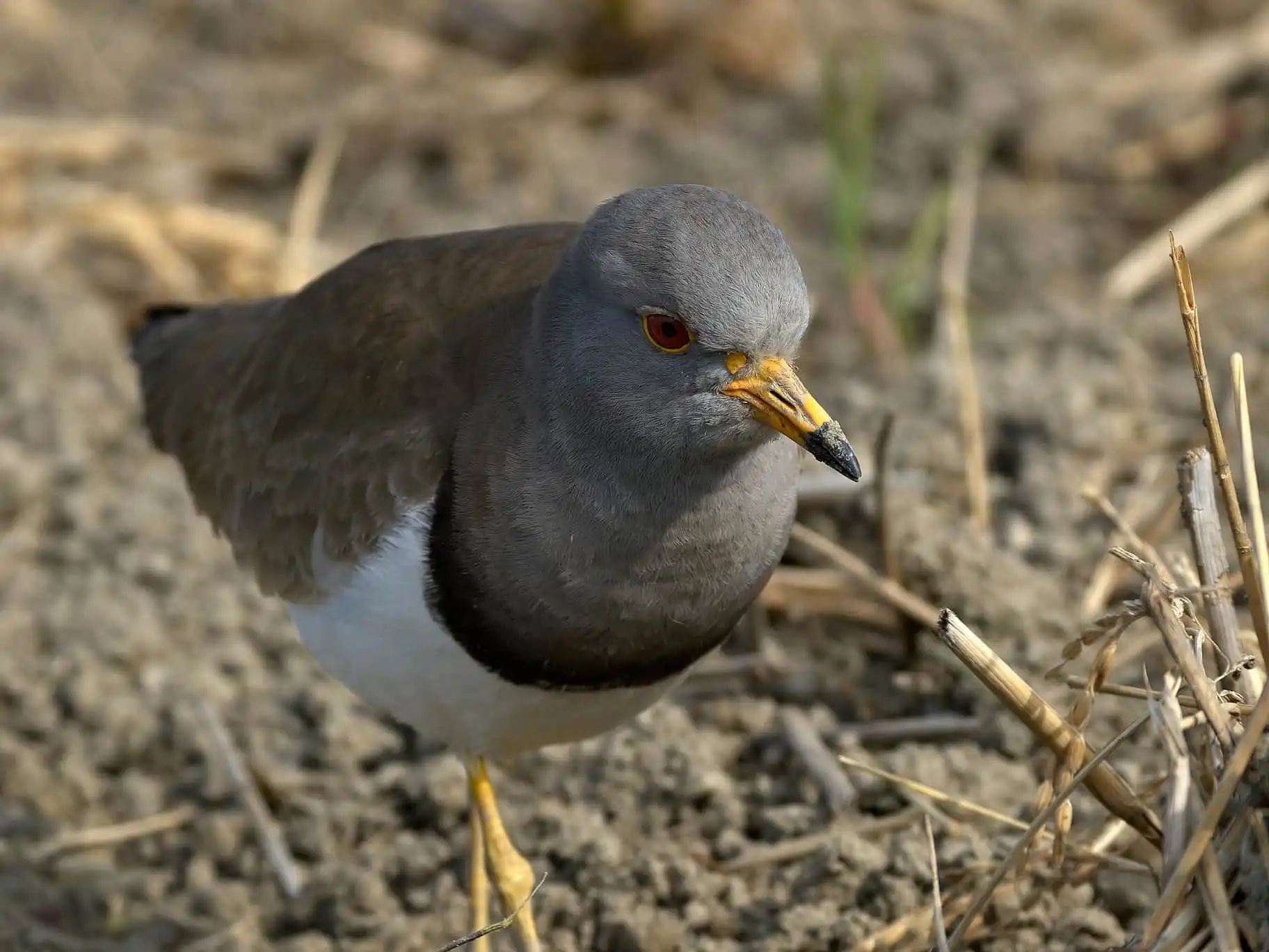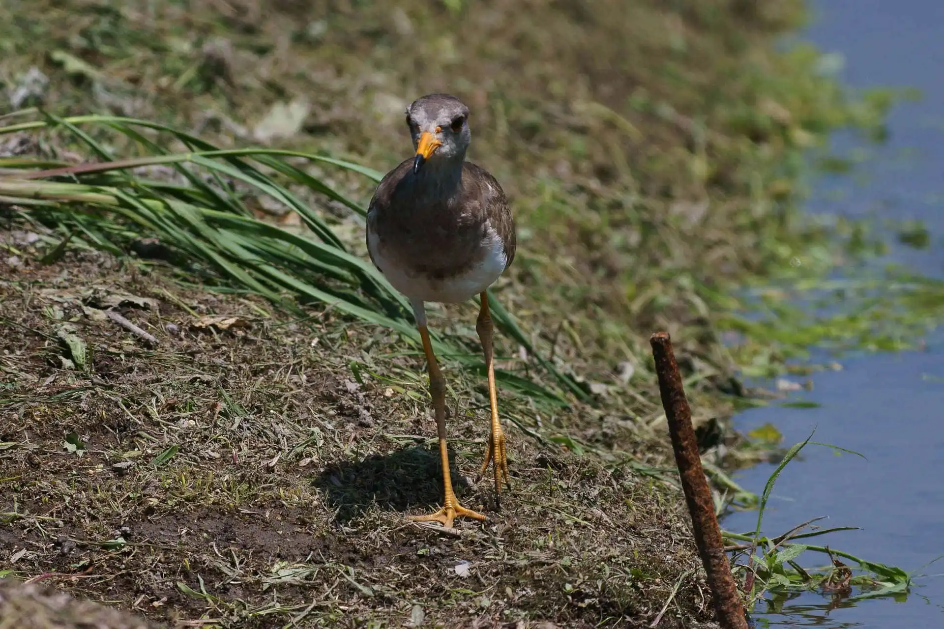 チドリの仲間らしい体型で背は茶色、頭部から胸はは灰色がかり、腹はきれいな白。胸と腹の境目と尾の先端は黒い。黄色い足とクチバシ、先端は黒い。