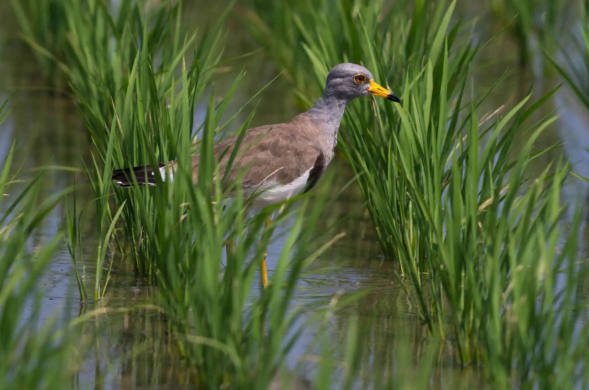 地面にいる鳥なので収穫の済んだ田畑ではケリの色だと背景と混ざってしまい、 また、背景もごちゃごちゃしてしまうので、田んぼに水がある季節の方が、緑とのコントラストも良く絵になりますね。