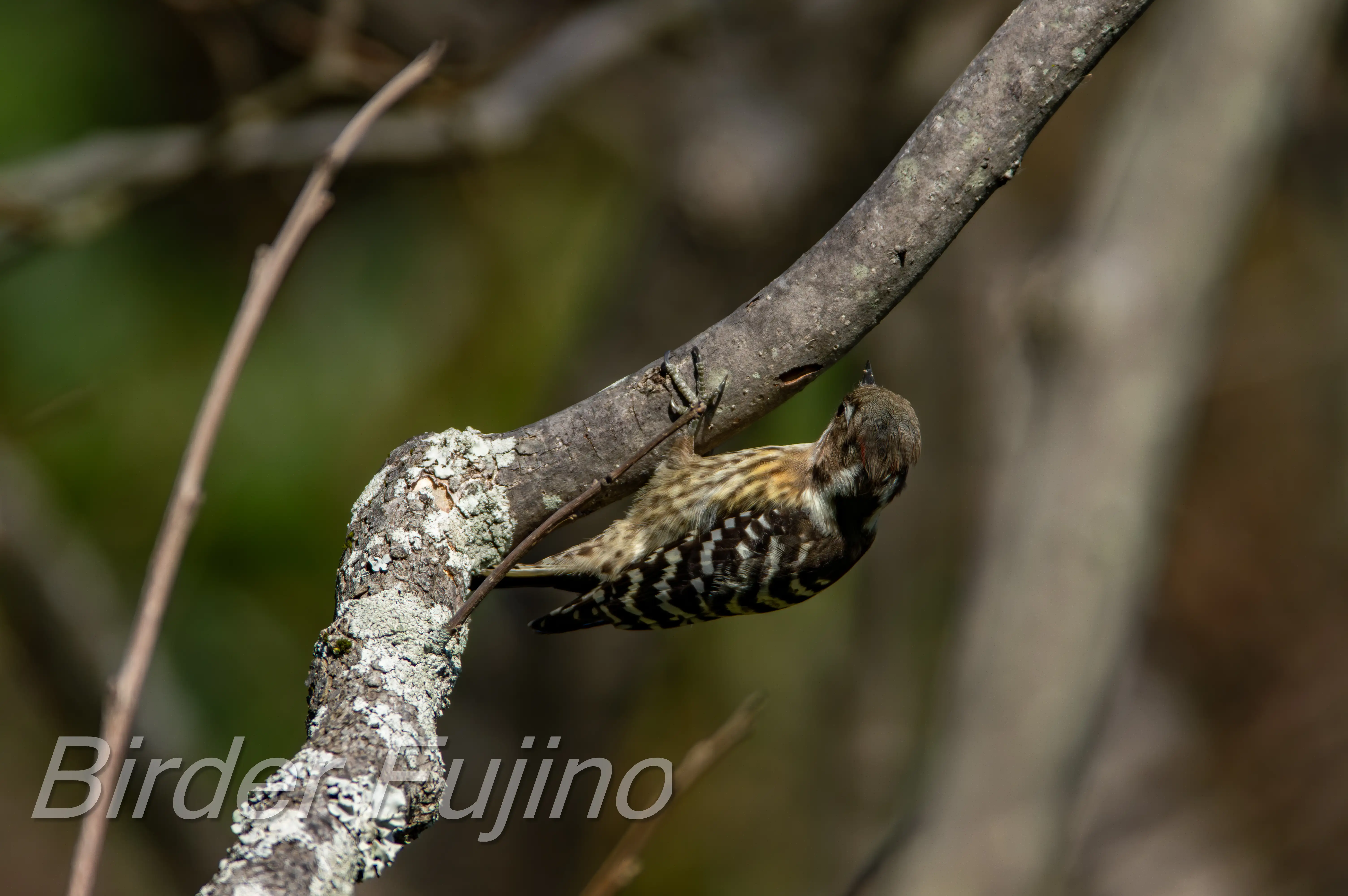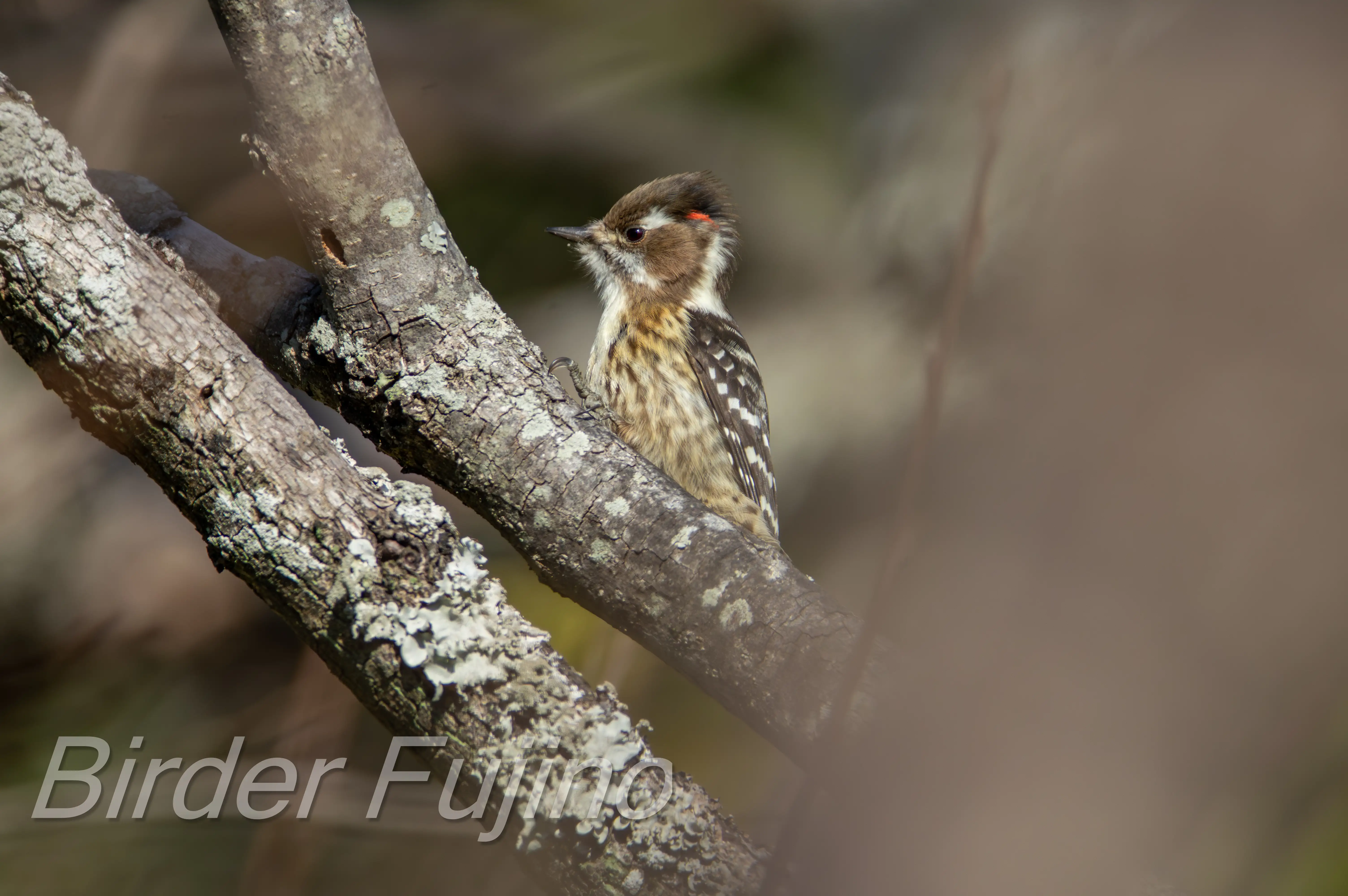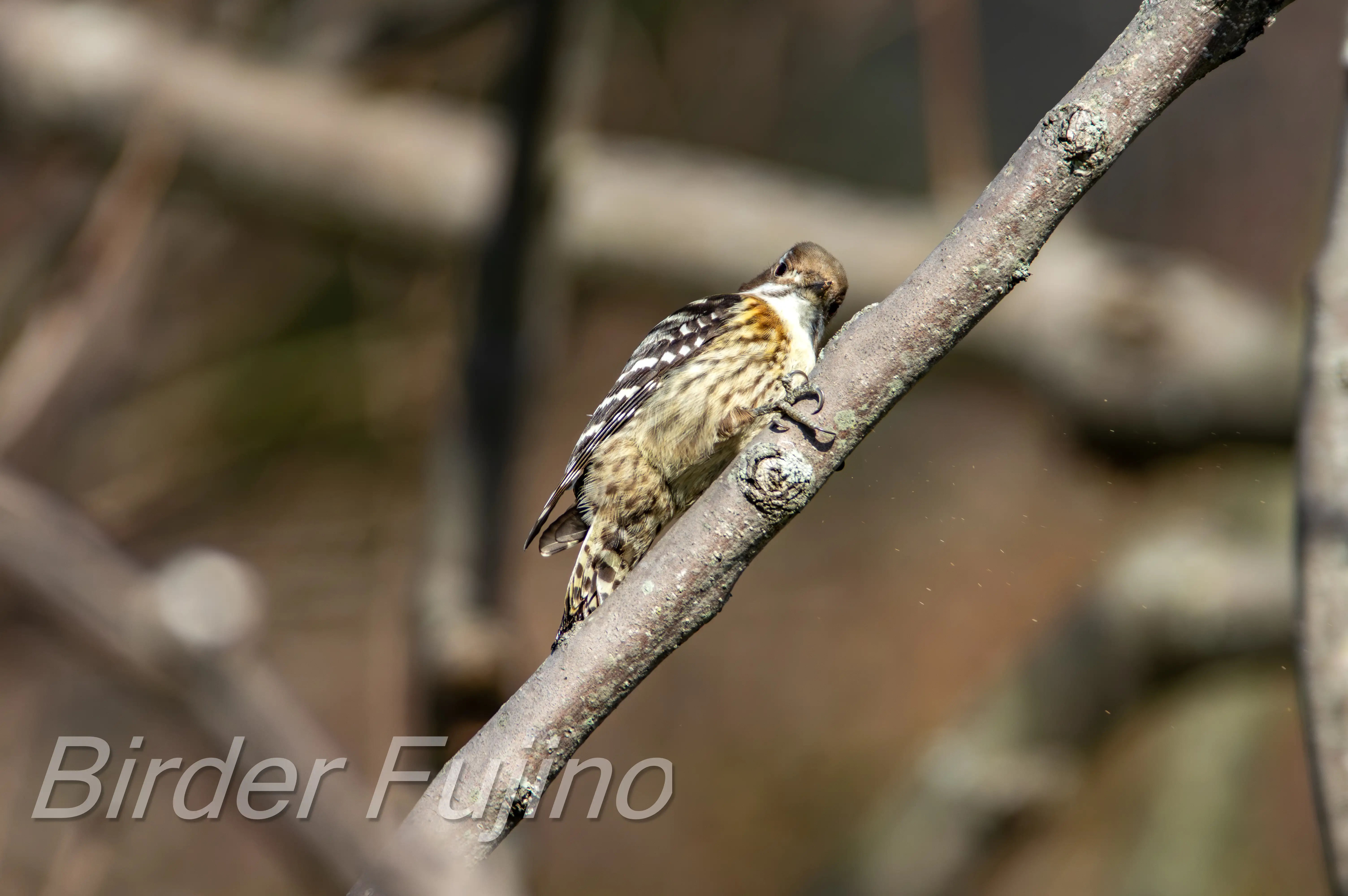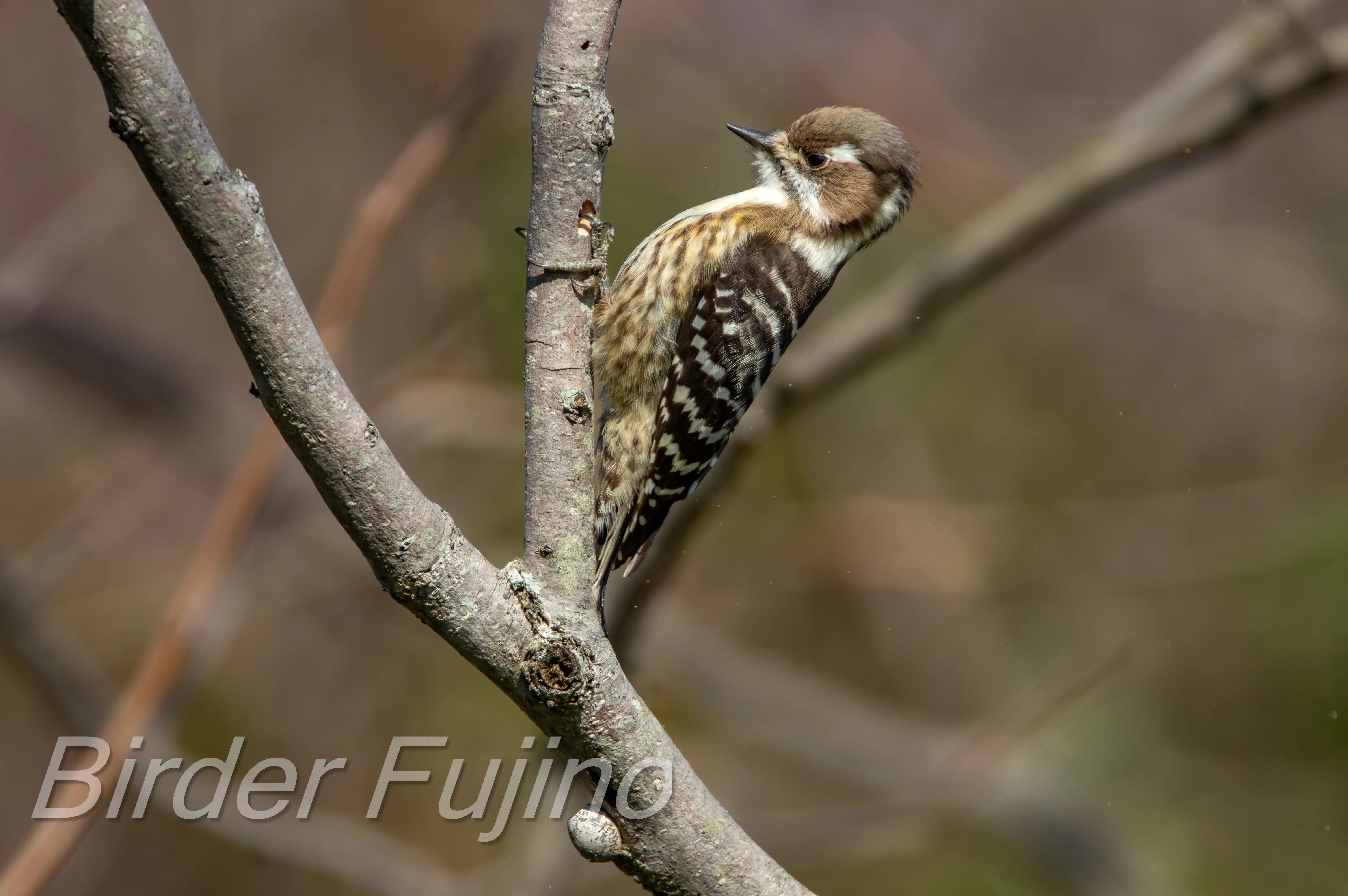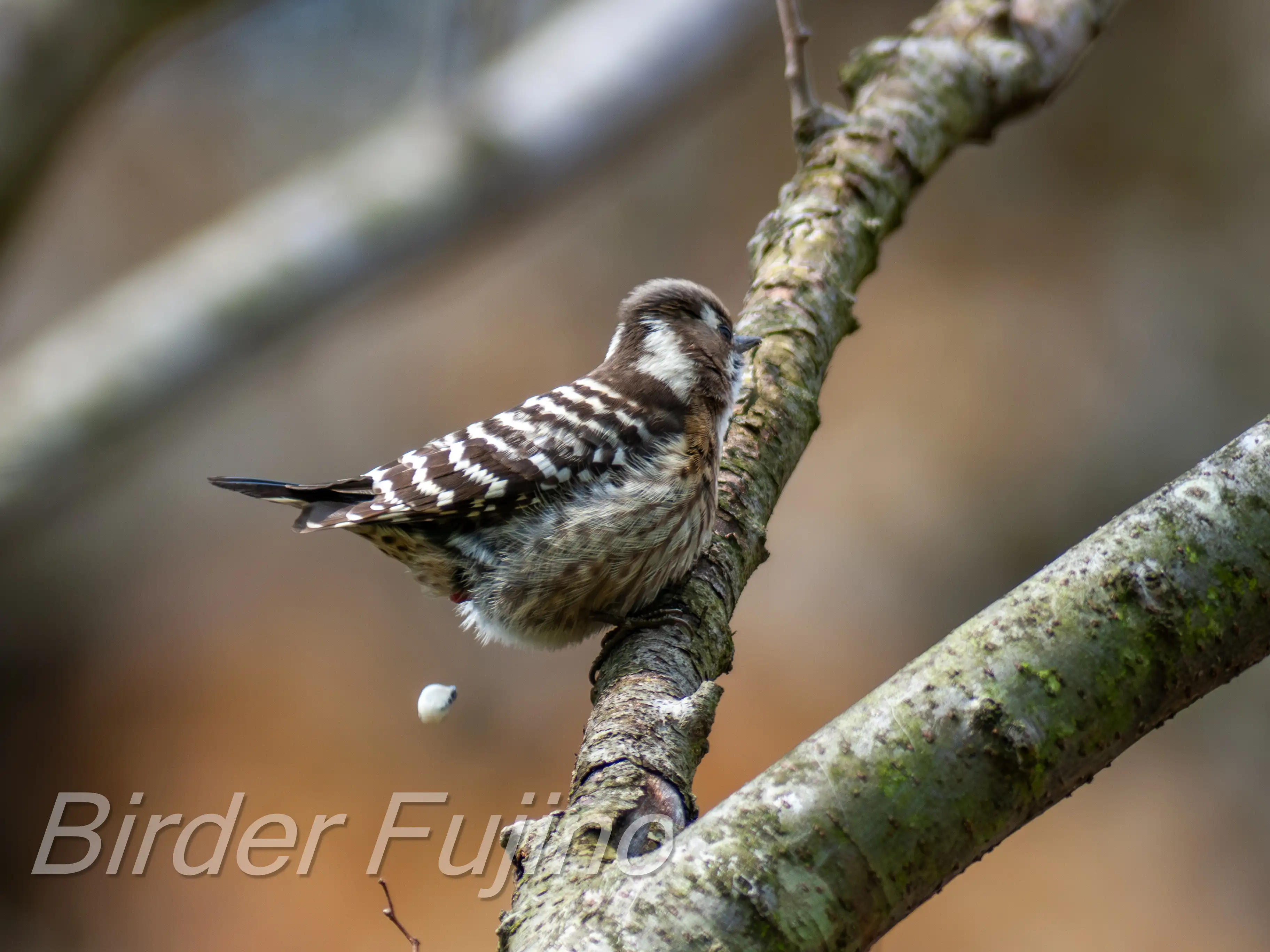 また、コゲラが枝に飛びついたら、少し先回りしてピントを合わせておいてコゲラがそこを通過するときに置きピンで連写しても結構撮れます。