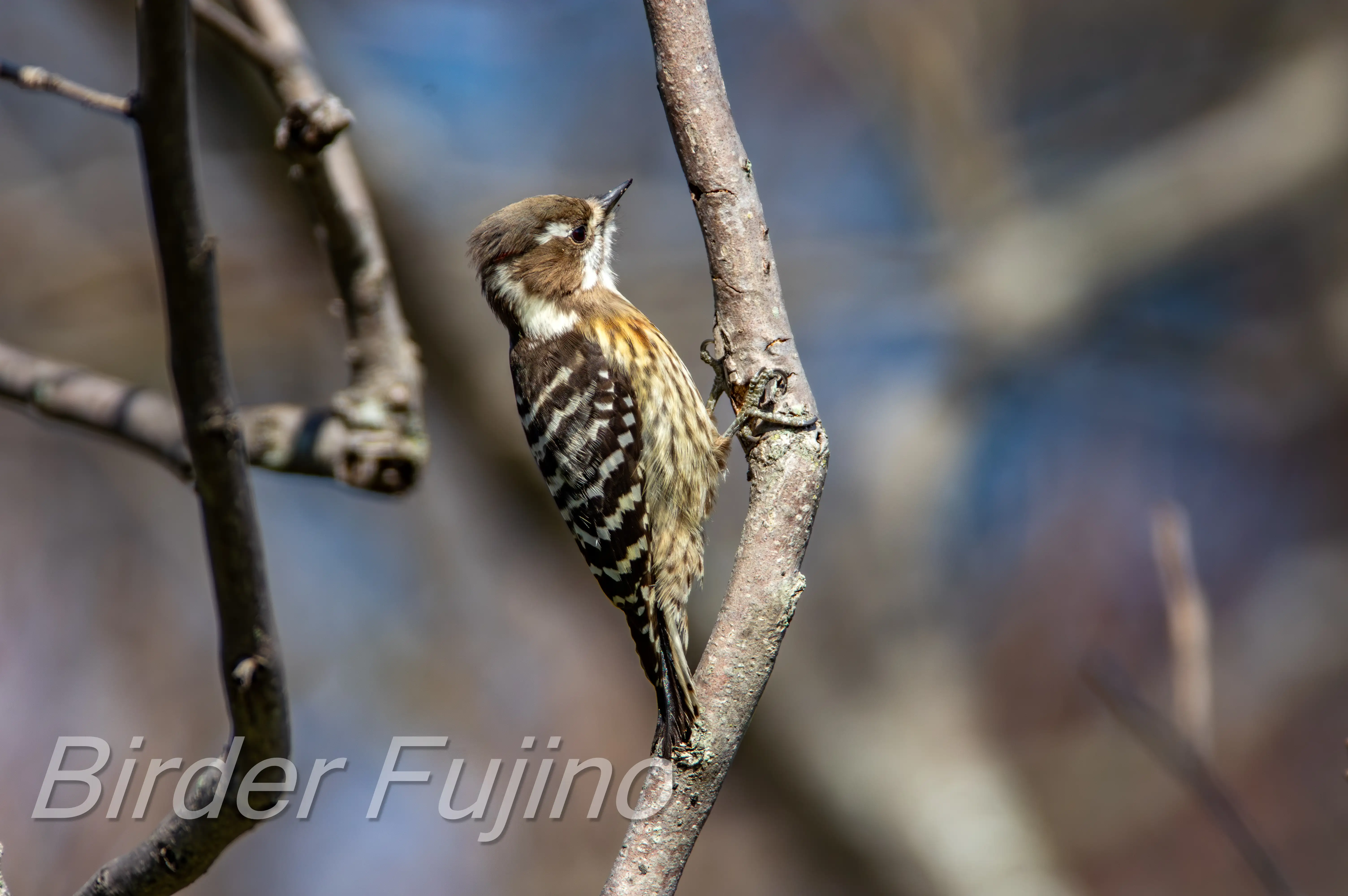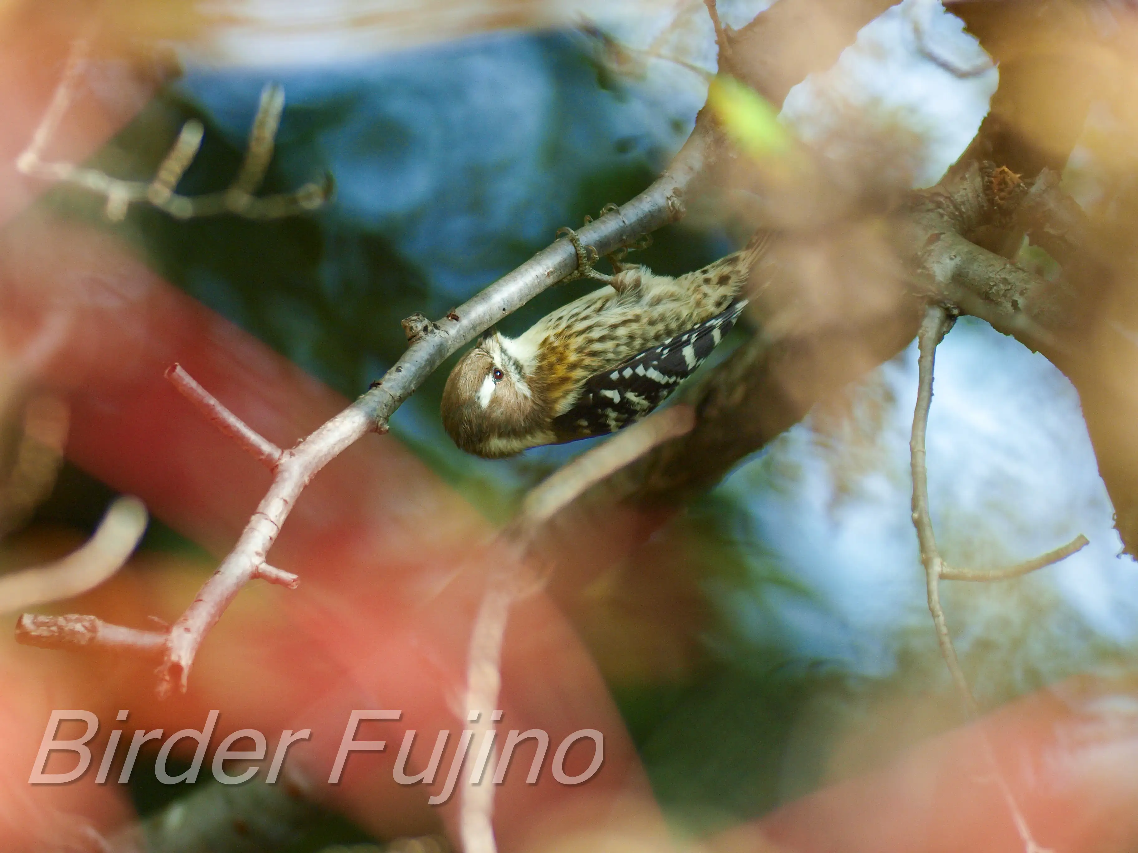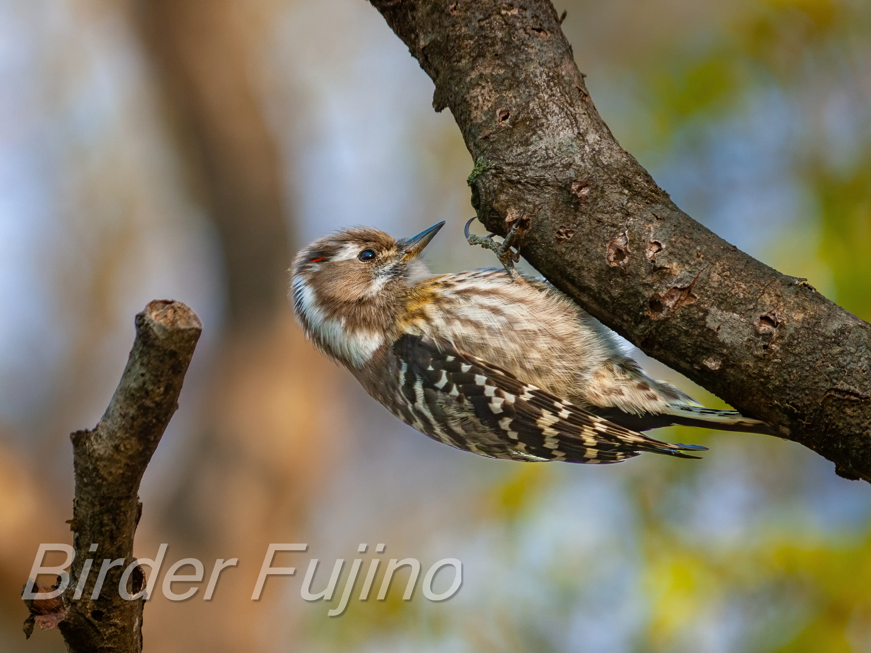 コゲラは少しもじっとしてない鳥で、フレーム入れたと思ったらちょこっと進んで、また入れたら進んでと撮影には苦労しますが、時々餌を見つけて深く掘るのかしばらく同じところで木をつつく時があり、そんな時が撮影のチャンスとなります。