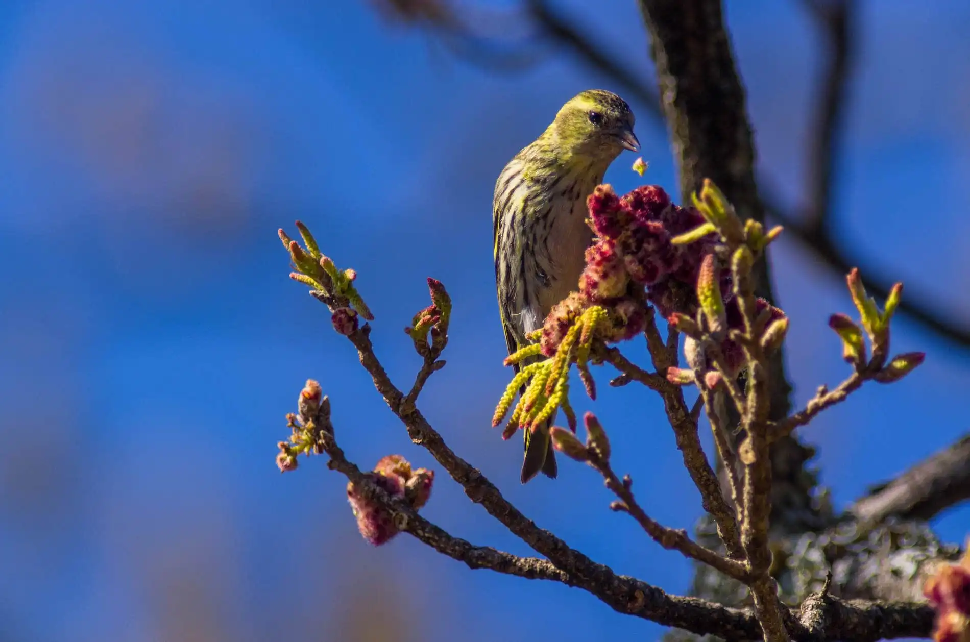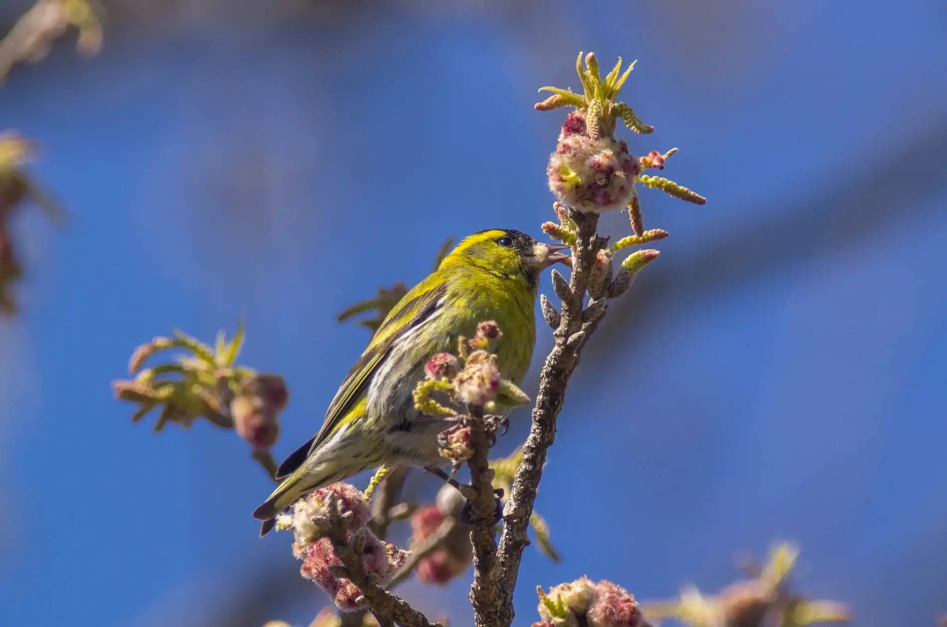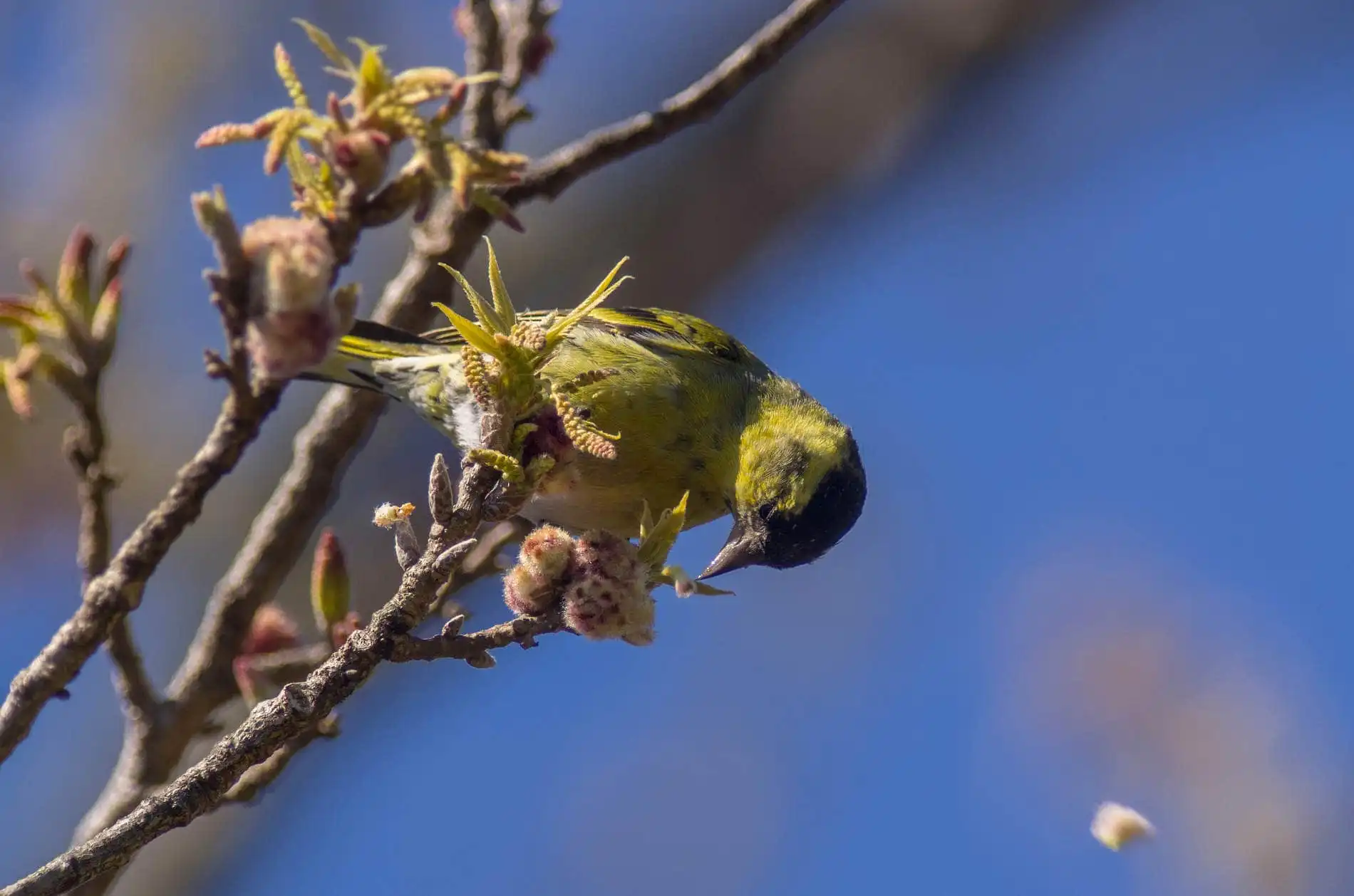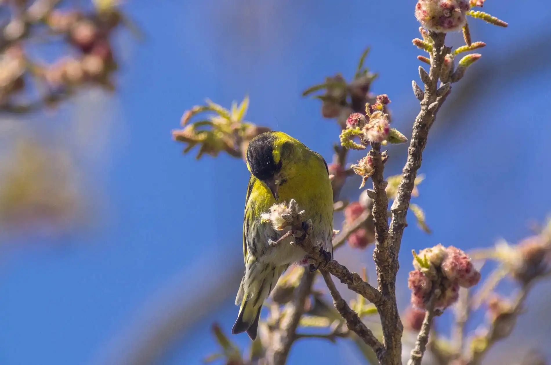 春先、和歌山県のわんぱく公園に野鳥を撮影に行った時、池のそばの大きな木にマヒワの群れが飛んで来て、木の枝に止まって、 木の芽や花を食べながら、