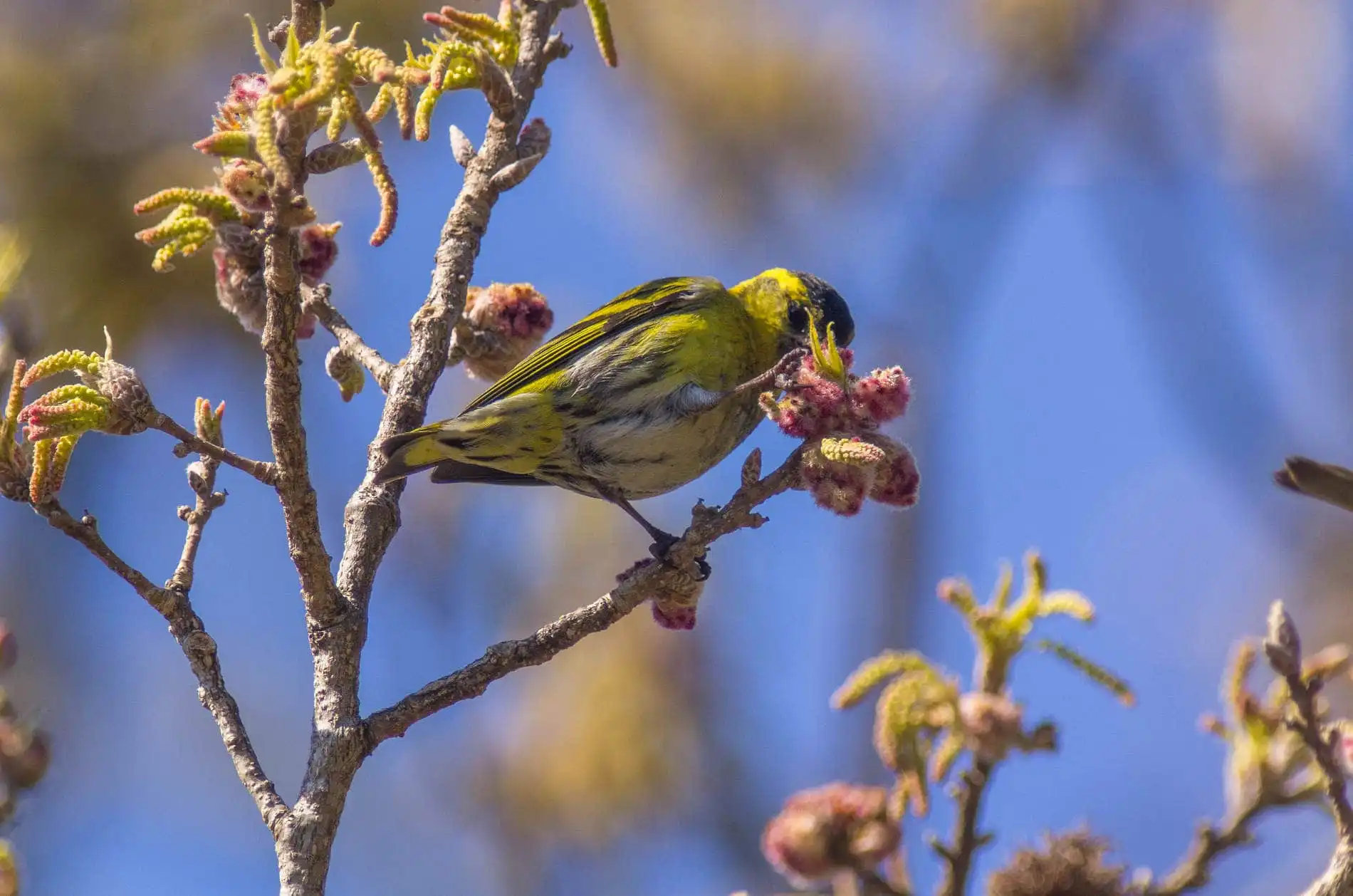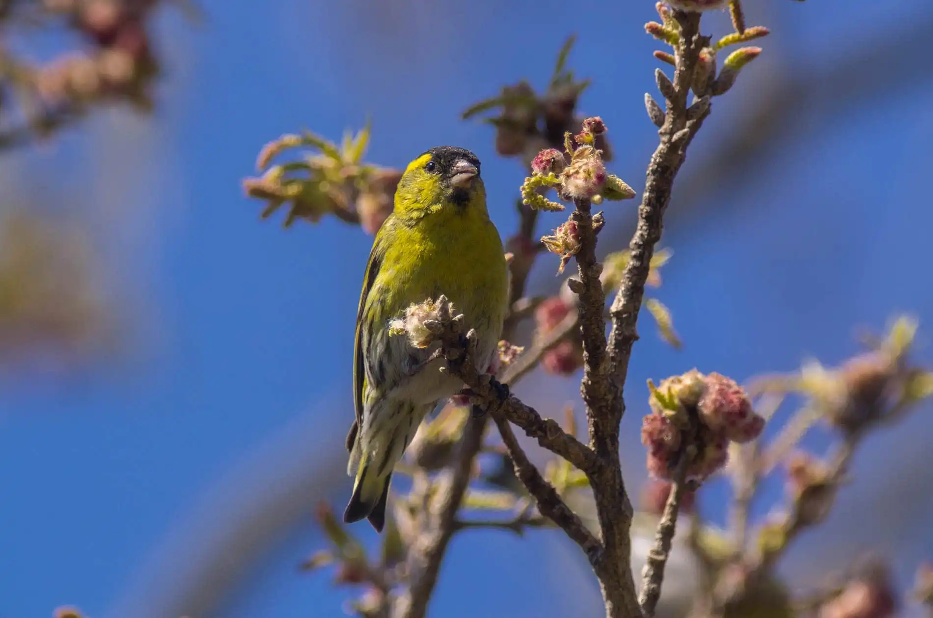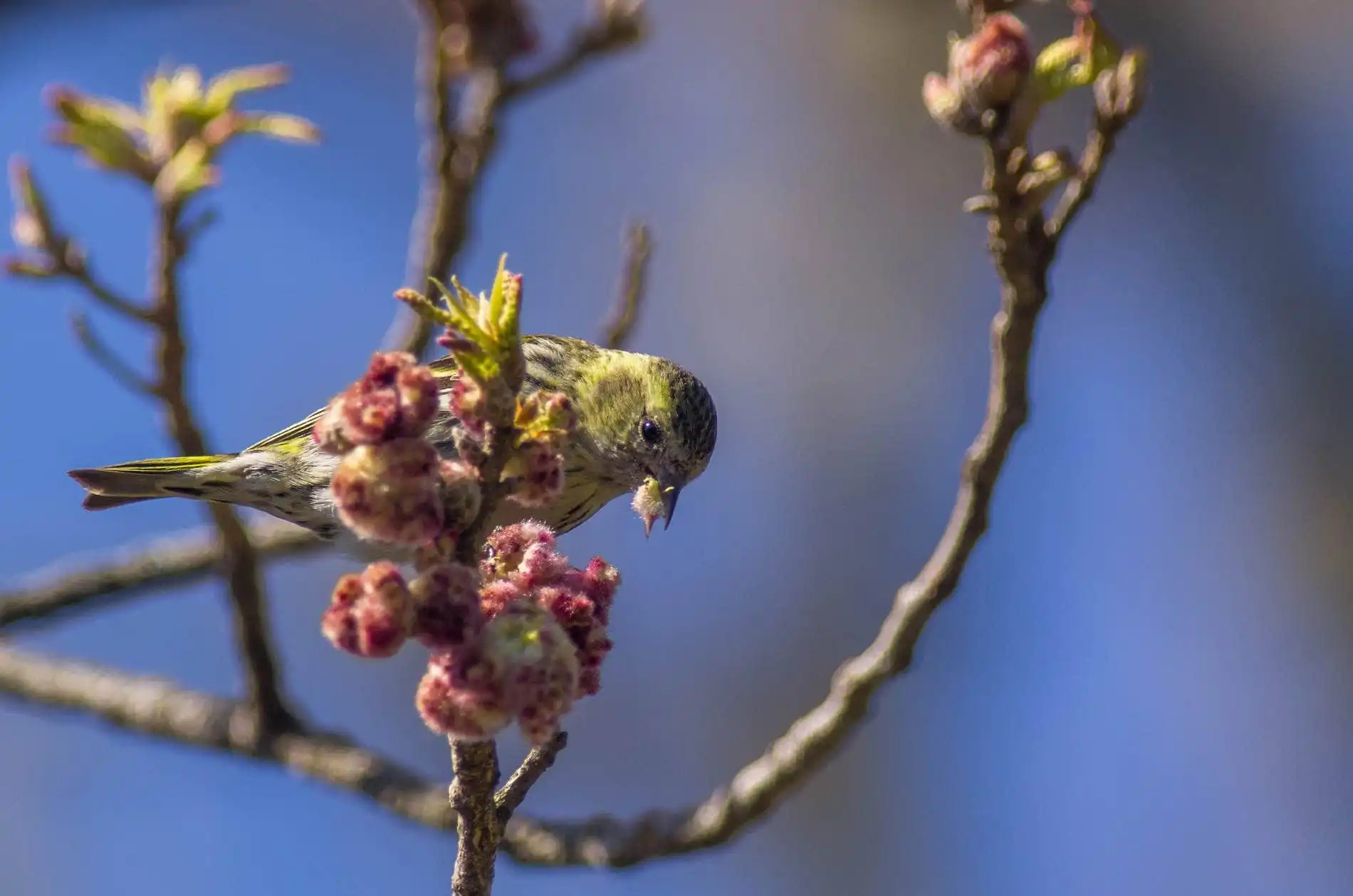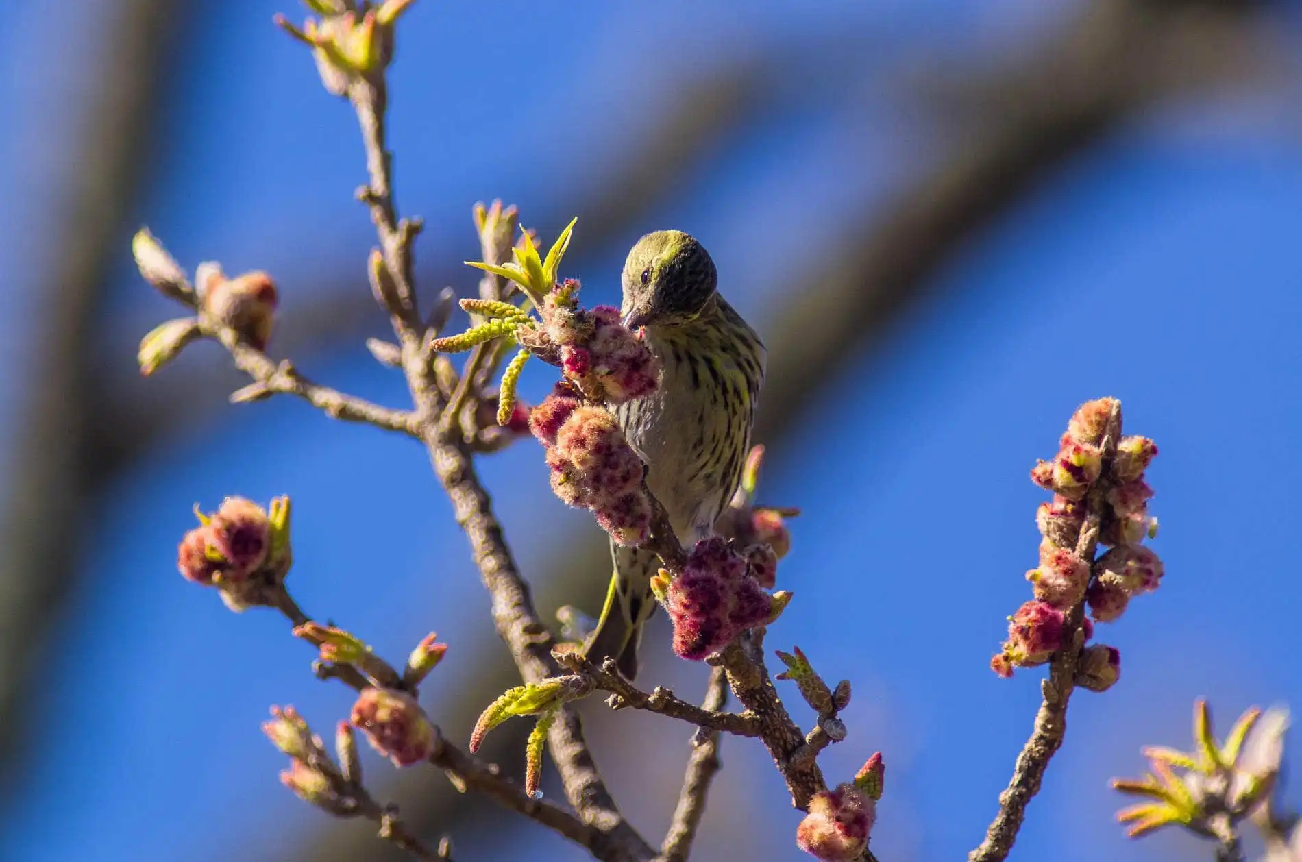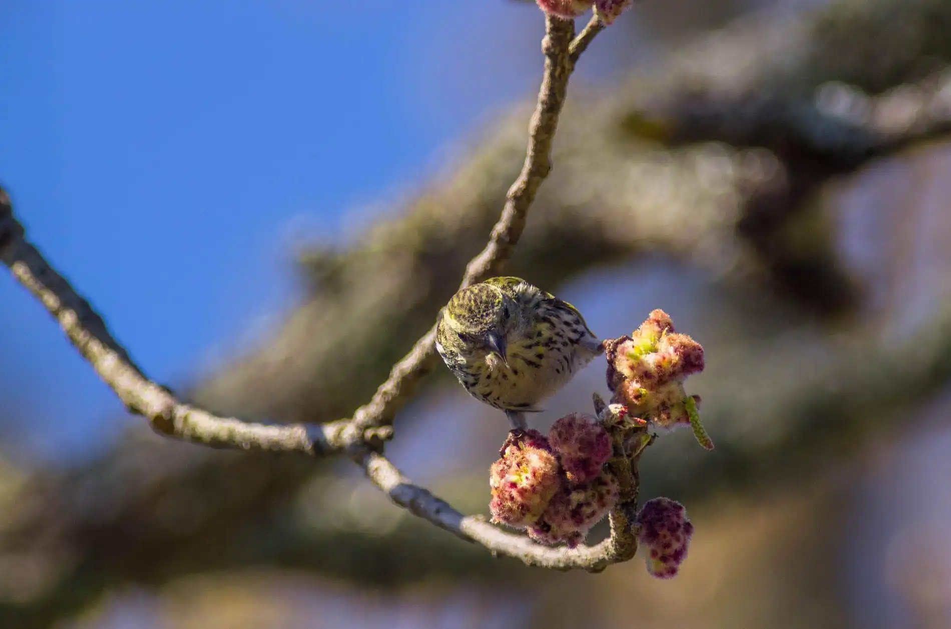 春先、和歌山県のわんぱく公園に野鳥を撮影に行った時、池のそばの大きな木にマヒワの群れが飛んで来て、木の枝に止まって、 木の芽や花を食べながら、