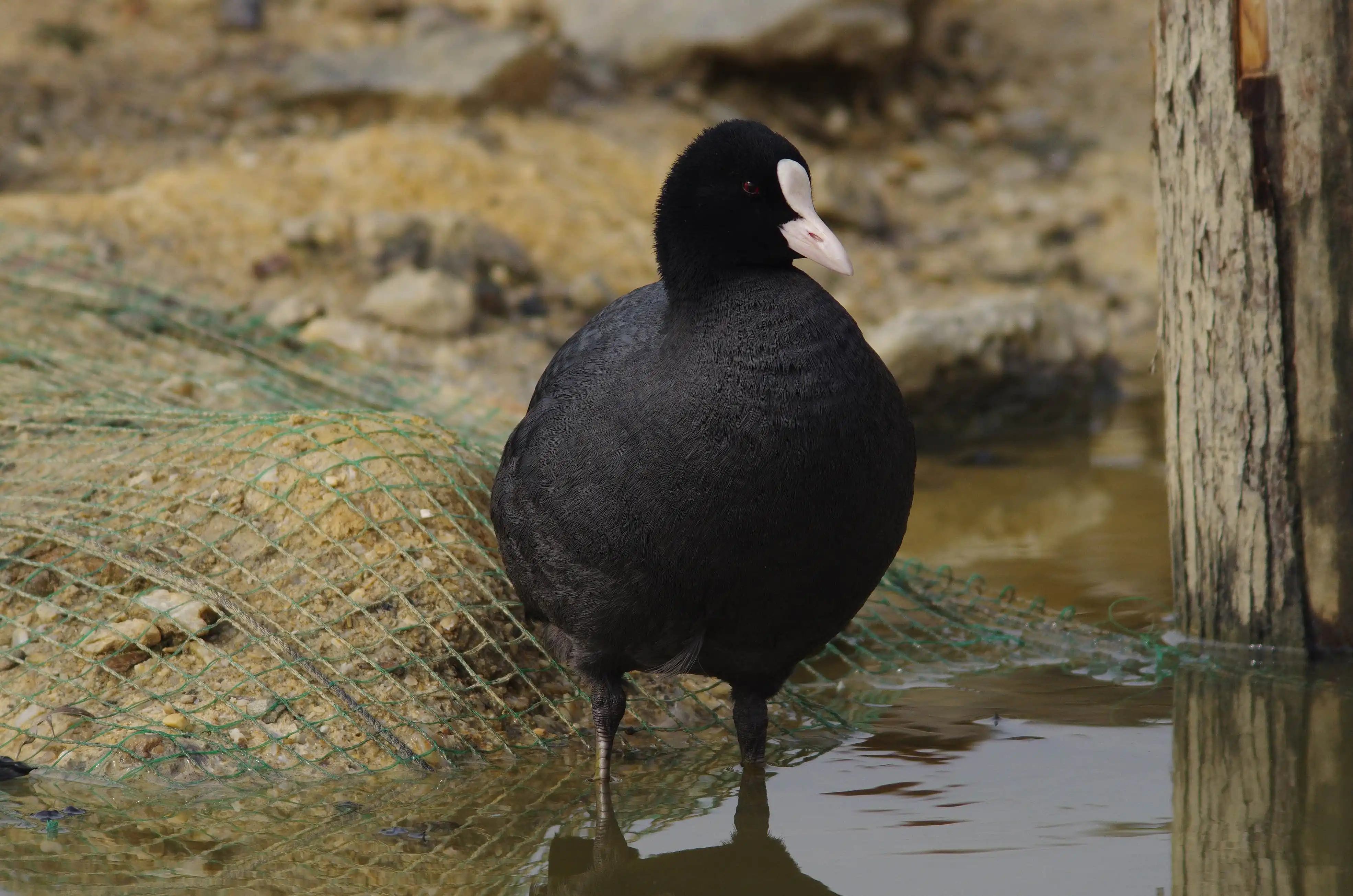 全体が黒くて前頭部からクチバシが白い。 カモのような形で嘴が短く尖っている。