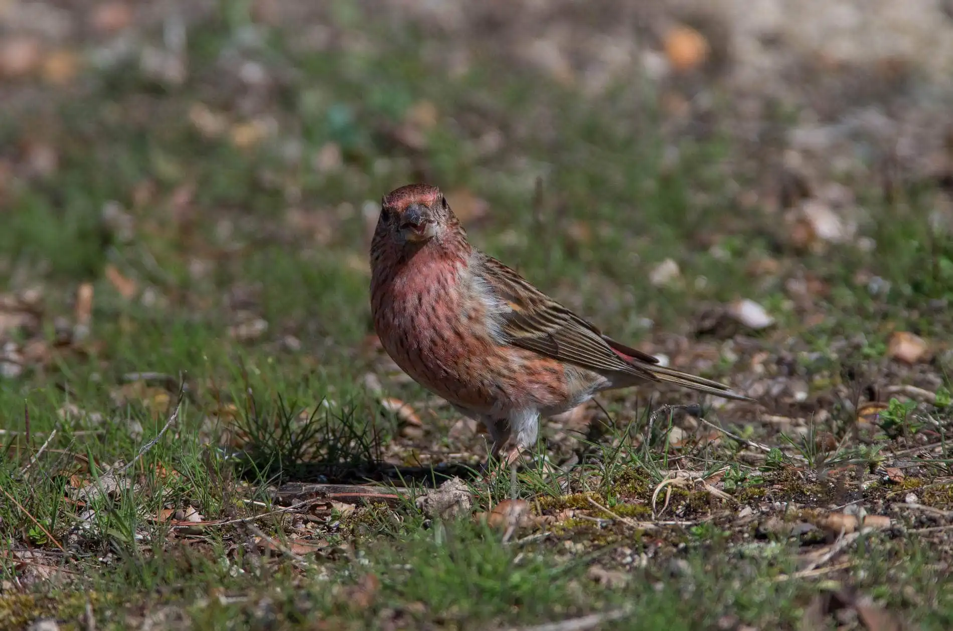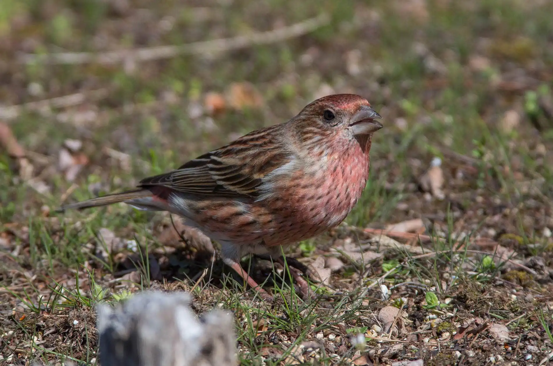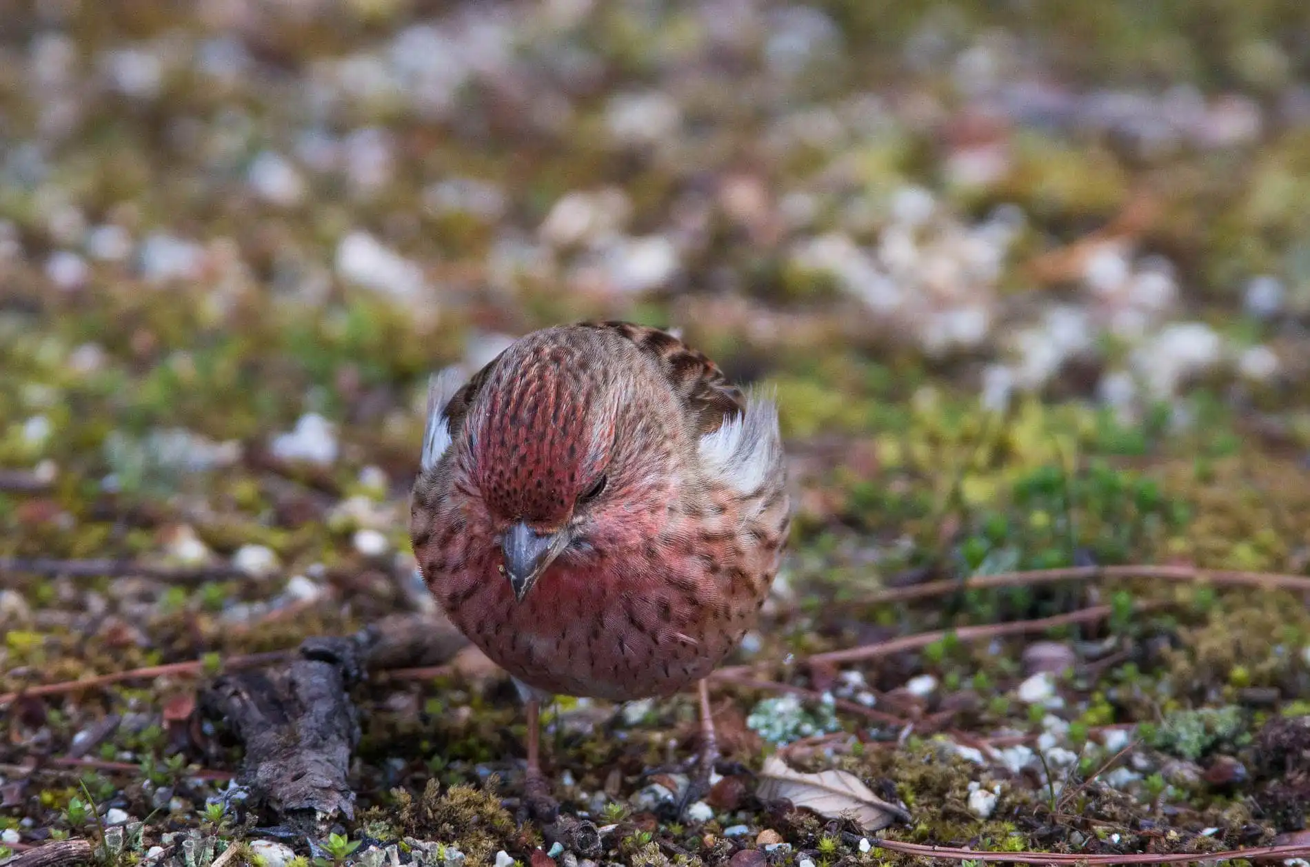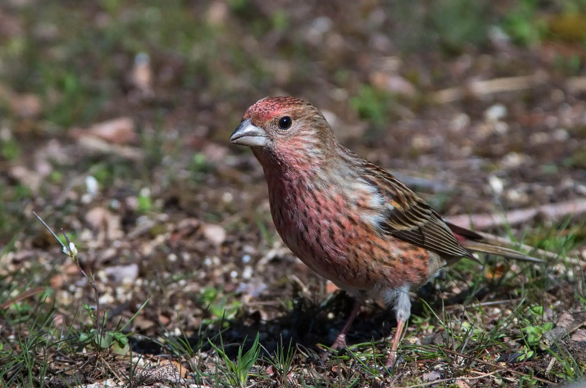 初冬から春にかけて、野鳥を撮影したくて足繁く近くの公園に通っていた春先、アオジやジョウビタキに混じって 少し大きめの変わった野鳥を見つけました。 何とそれはオオマシコではありませんか! 驚きと嬉しさで焦りながらピントを合わせて、夢中でシャッターを切りました。 幸いオオマシコは、のんびりと地面の餌を啄ばんでいて、撮影に成功しました。 どこかへ渡る途中で、羽を休めに立ち寄ったのでしょうね。