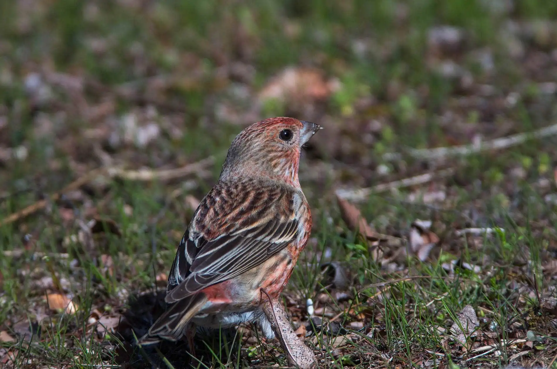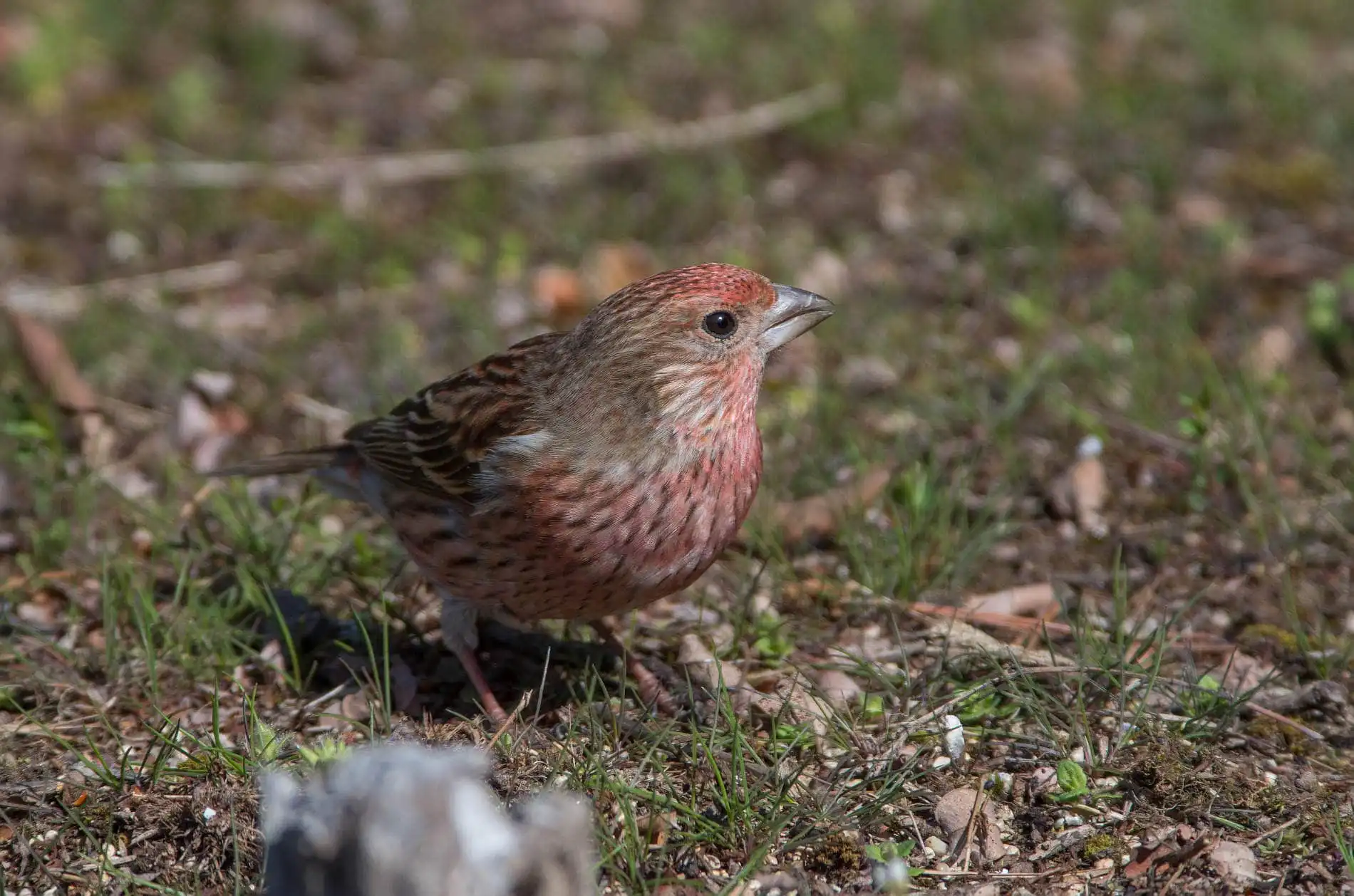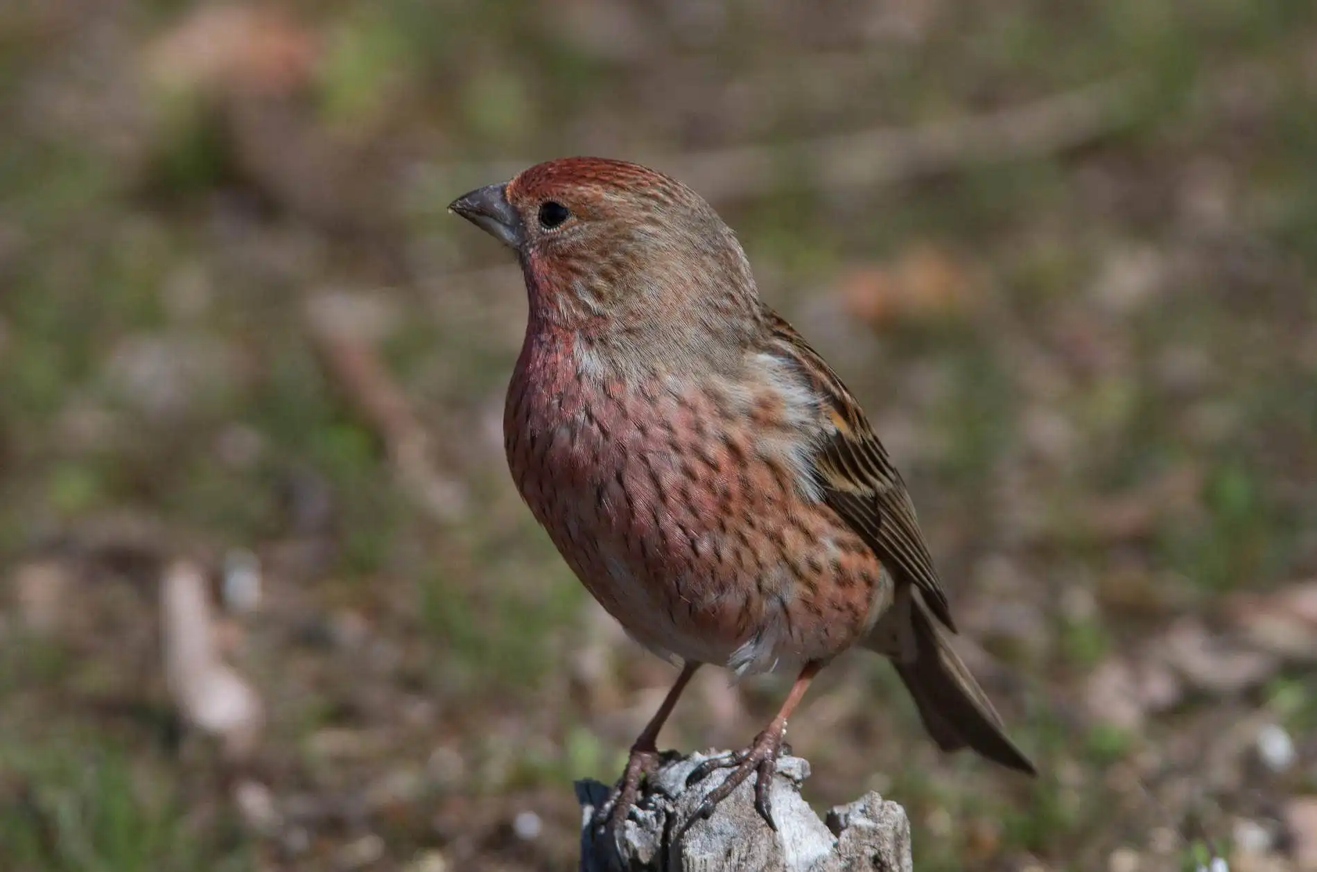 初冬から春にかけて、野鳥を撮影したくて足繁く近くの公園に通っていた春先、アオジやジョウビタキに混じって 少し大きめの変わった野鳥を見つけました。 何とそれはオオマシコではありませんか! 驚きと嬉しさで焦りながらピントを合わせて、夢中でシャッターを切りました。 幸いオオマシコは、のんびりと地面の餌を啄ばんでいて、撮影に成功しました。 どこかへ渡る途中で、羽を休めに立ち寄ったのでしょうね。