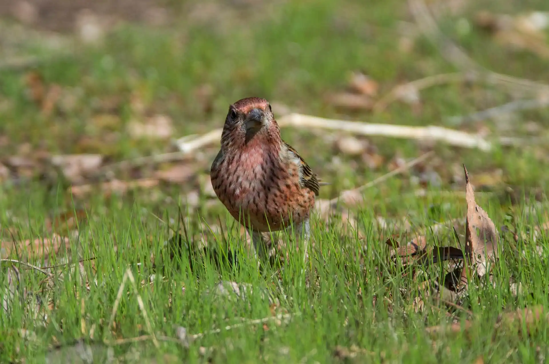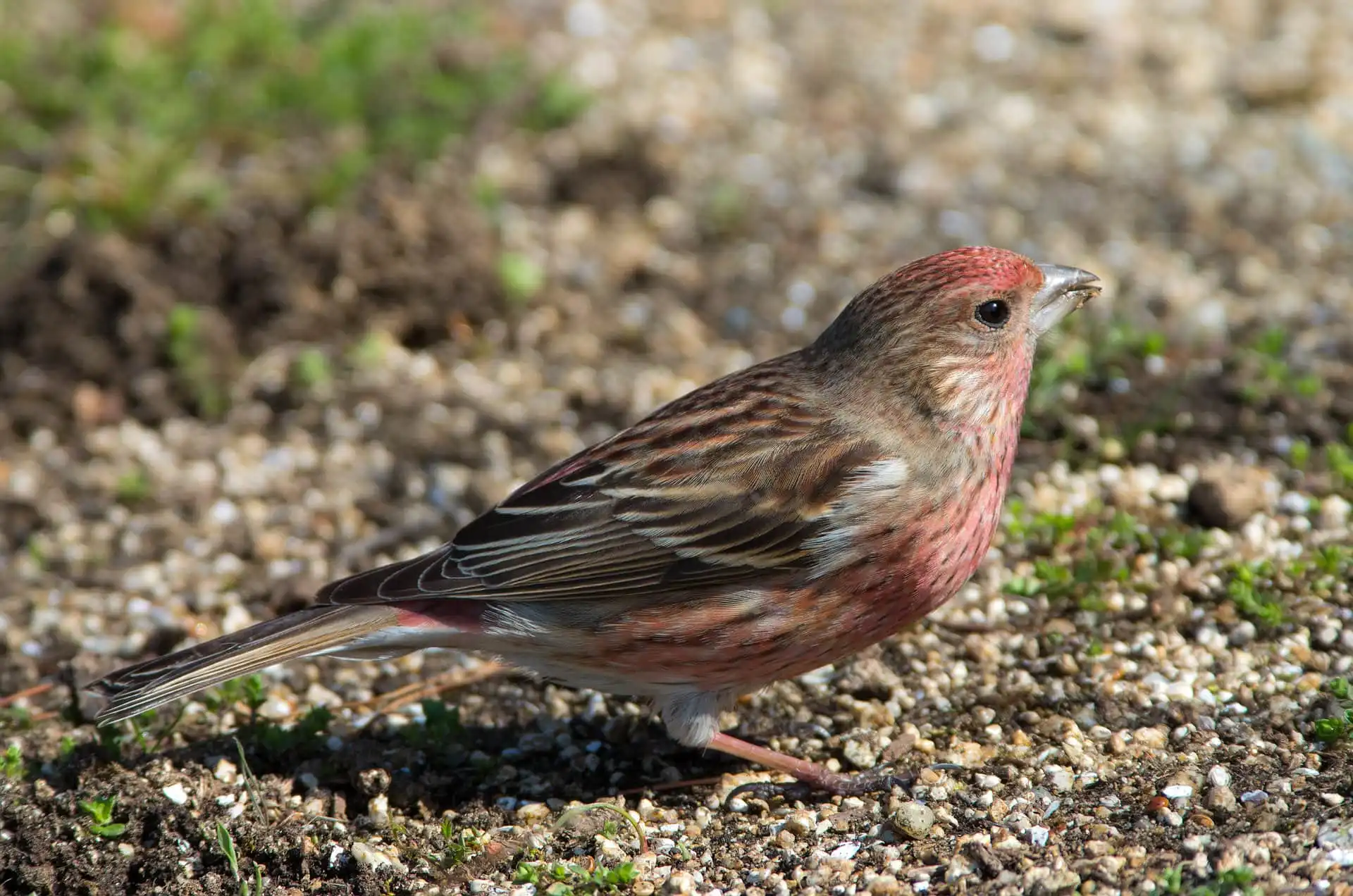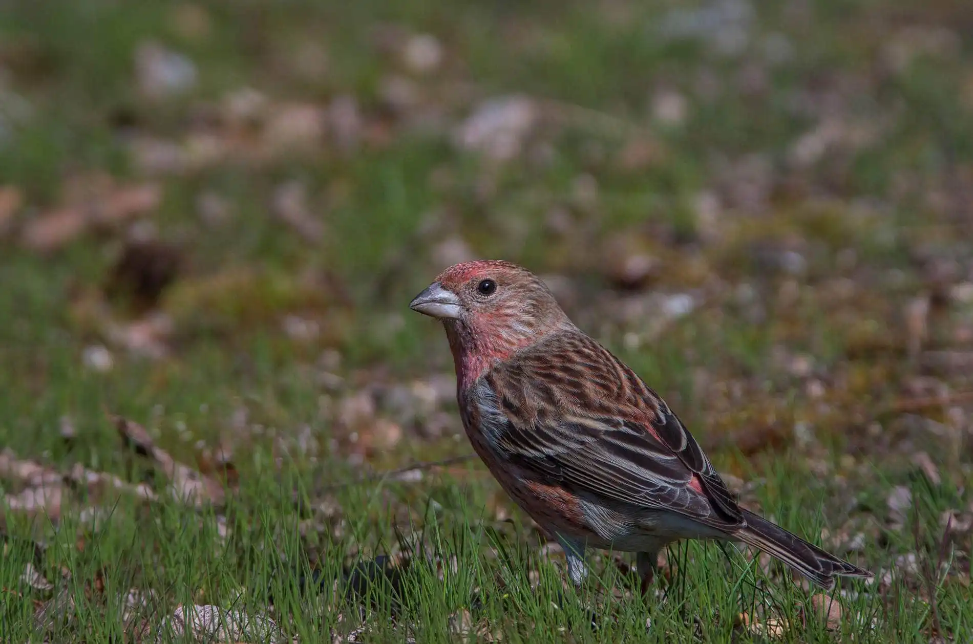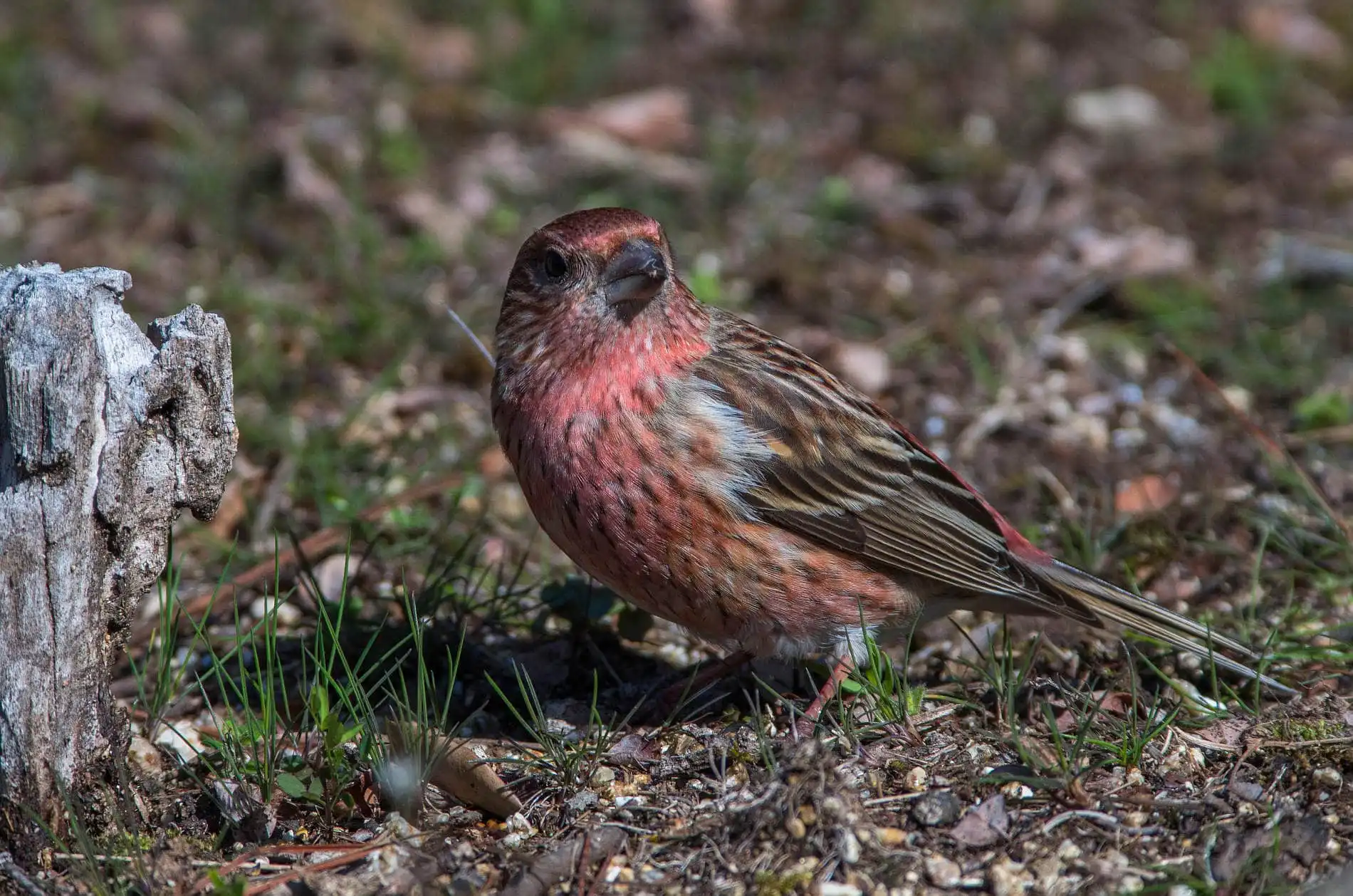 初冬から春にかけて、野鳥を撮影したくて足繁く近くの公園に通っていた春先、アオジやジョウビタキに混じって 少し大きめの変わった野鳥を見つけました。 何とそれはオオマシコではありませんか! 驚きと嬉しさで焦りながらピントを合わせて、夢中でシャッターを切りました。 幸いオオマシコは、のんびりと地面の餌を啄ばんでいて、撮影に成功しました。 どこかへ渡る途中で、羽を休めに立ち寄ったのでしょうね。