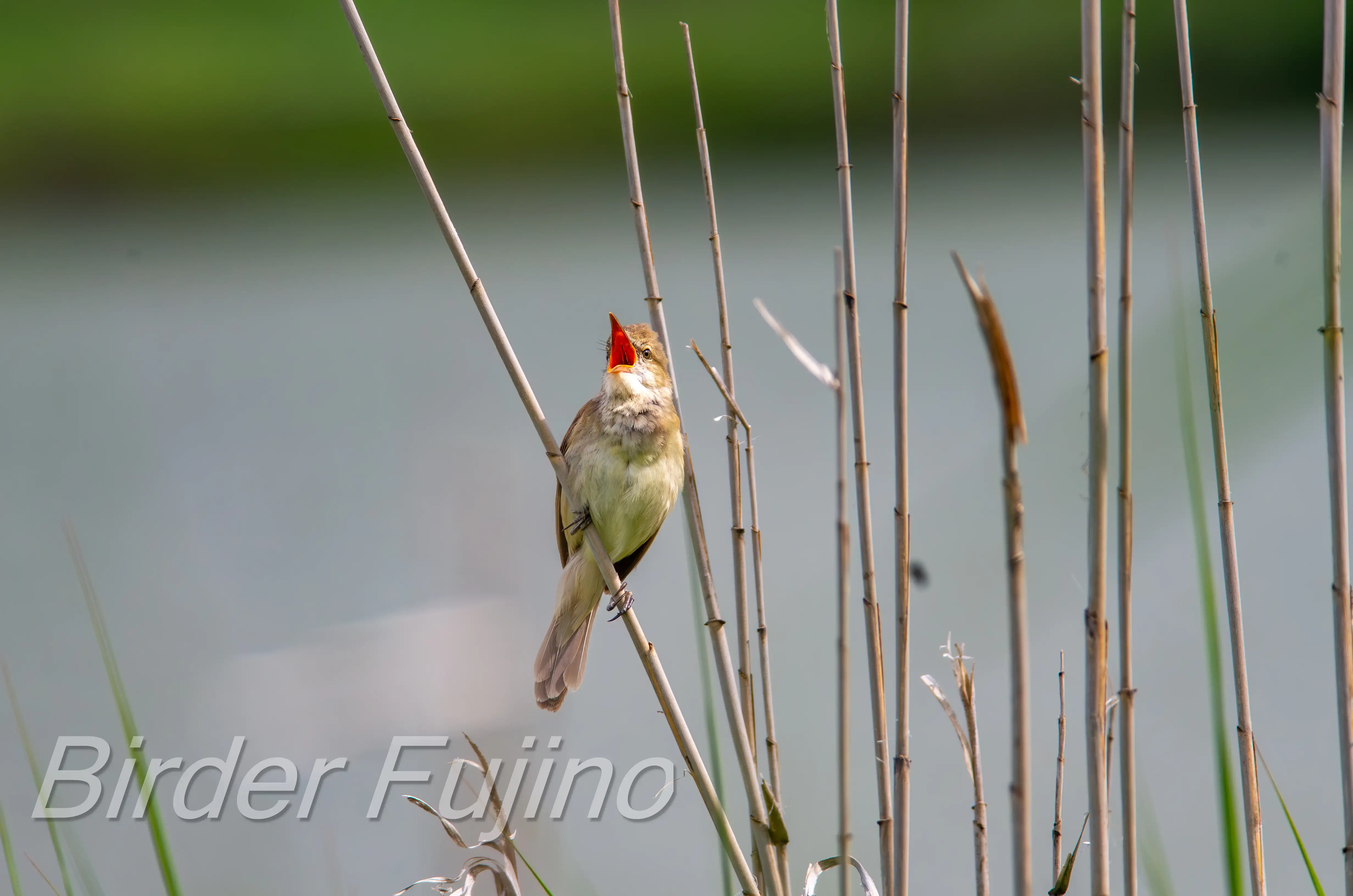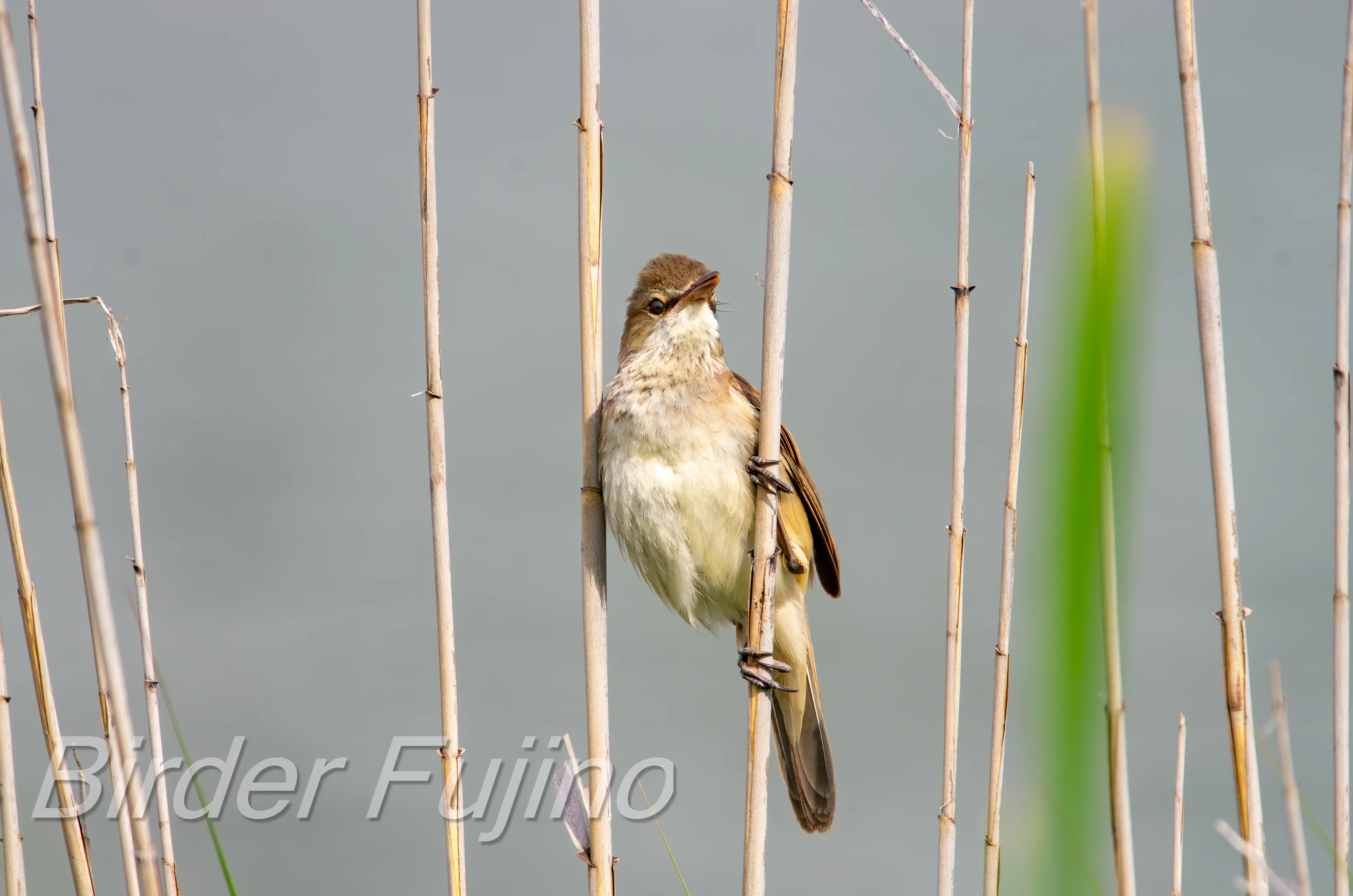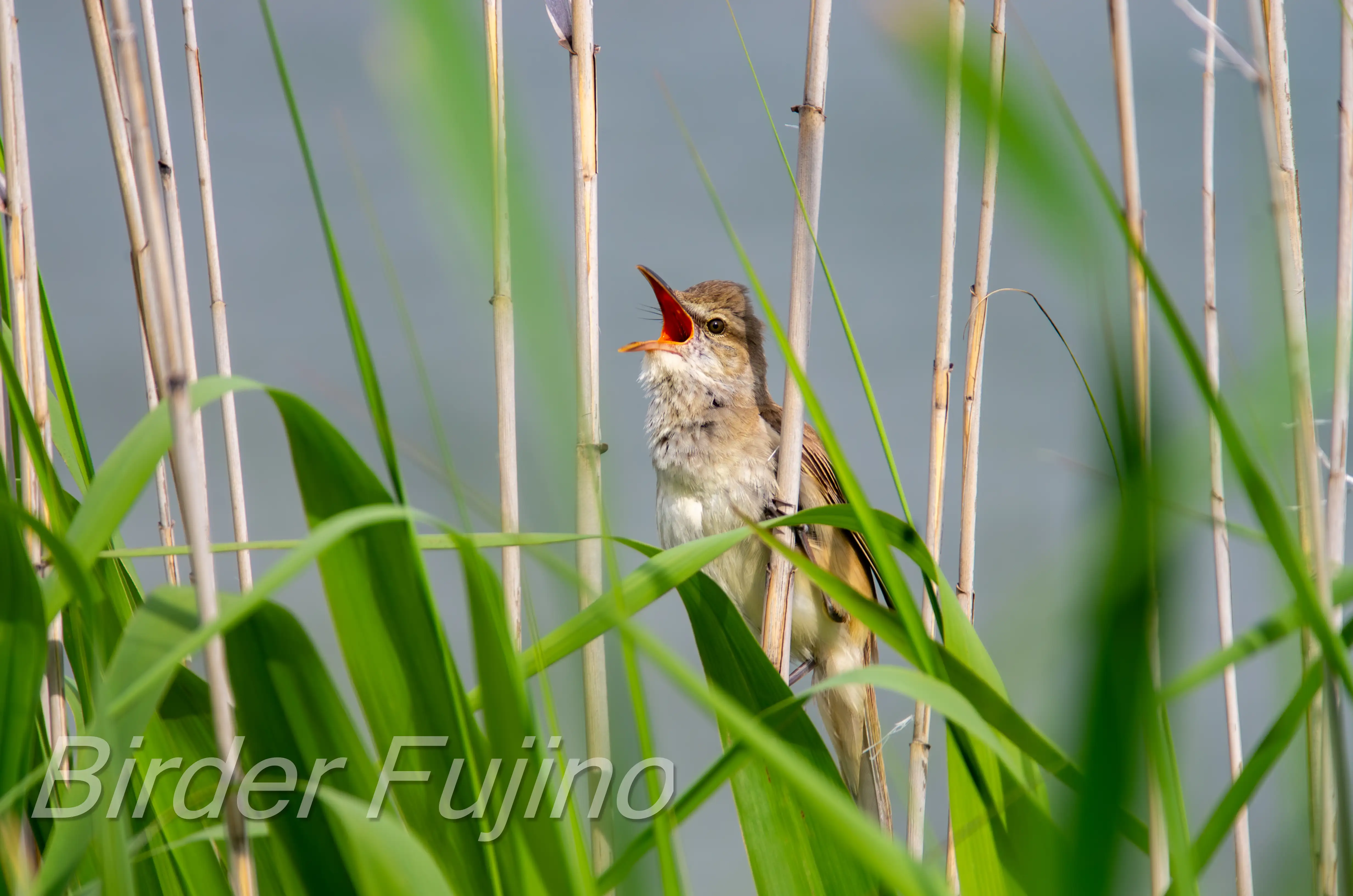 オオヨシキリの写真は何と言ってもヨシにつかまって大きく口を開けて赤い口の中を見せて鳴いている姿ですので、チャンスを逃さず撮影しましょう。