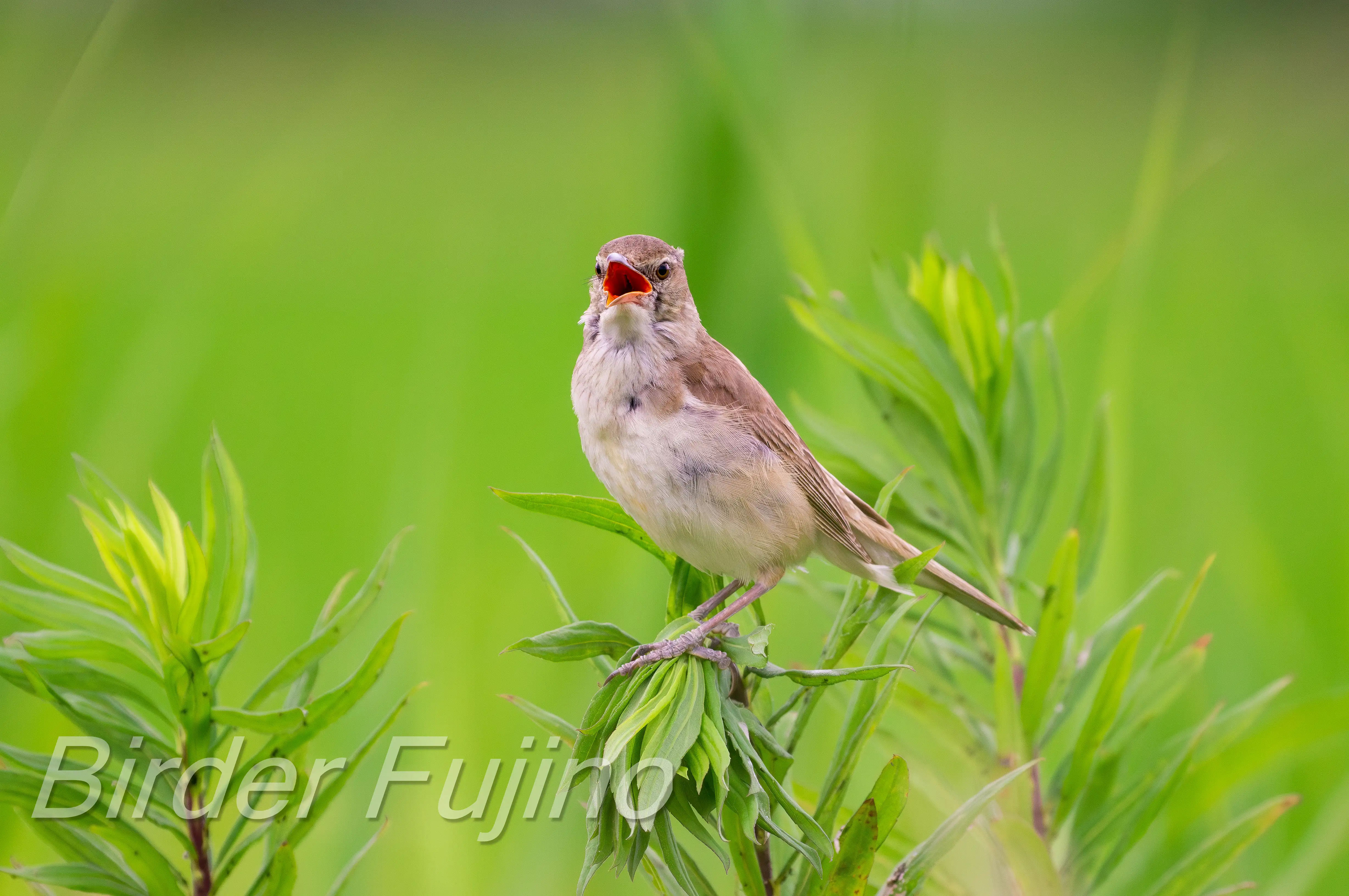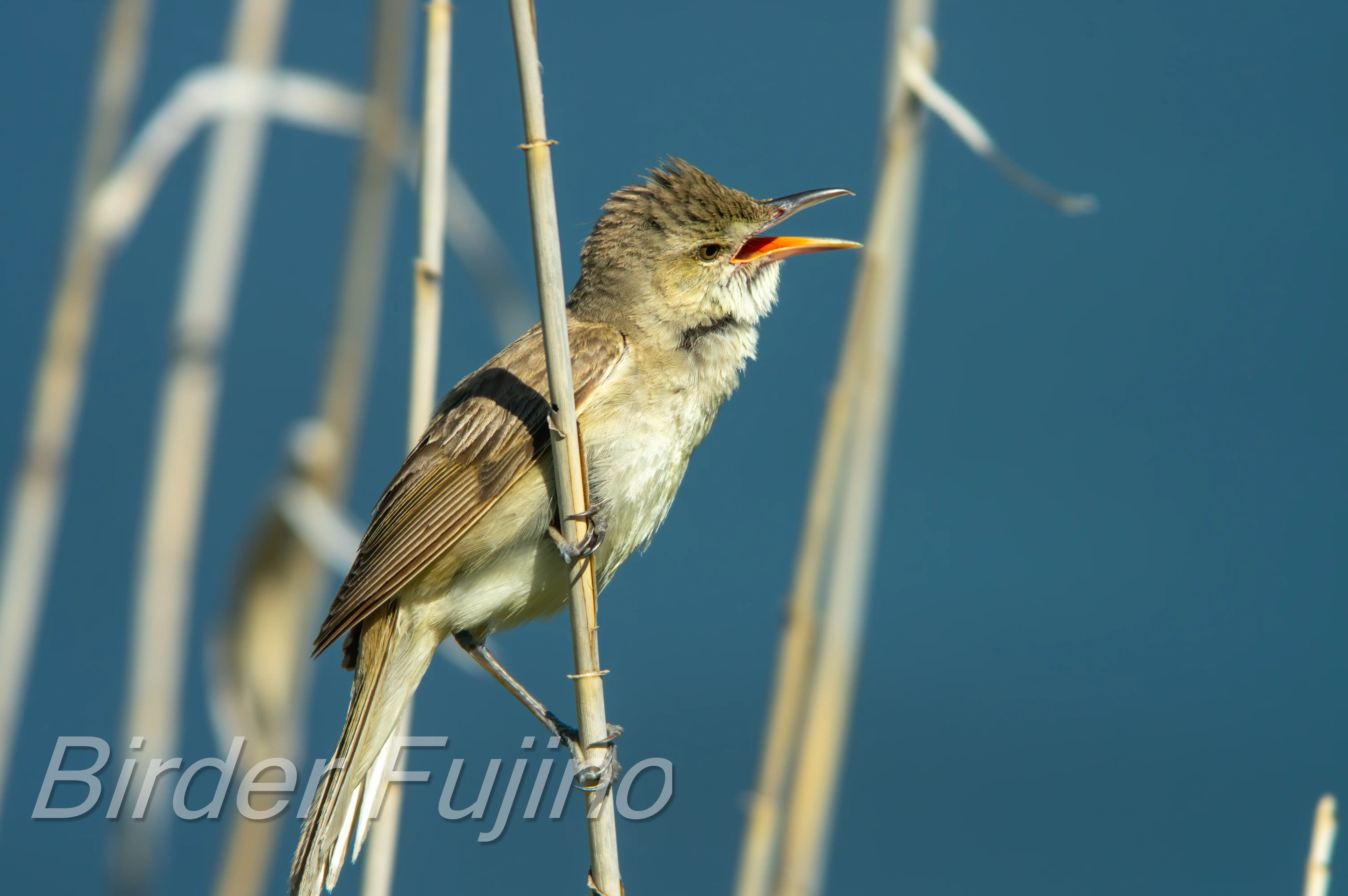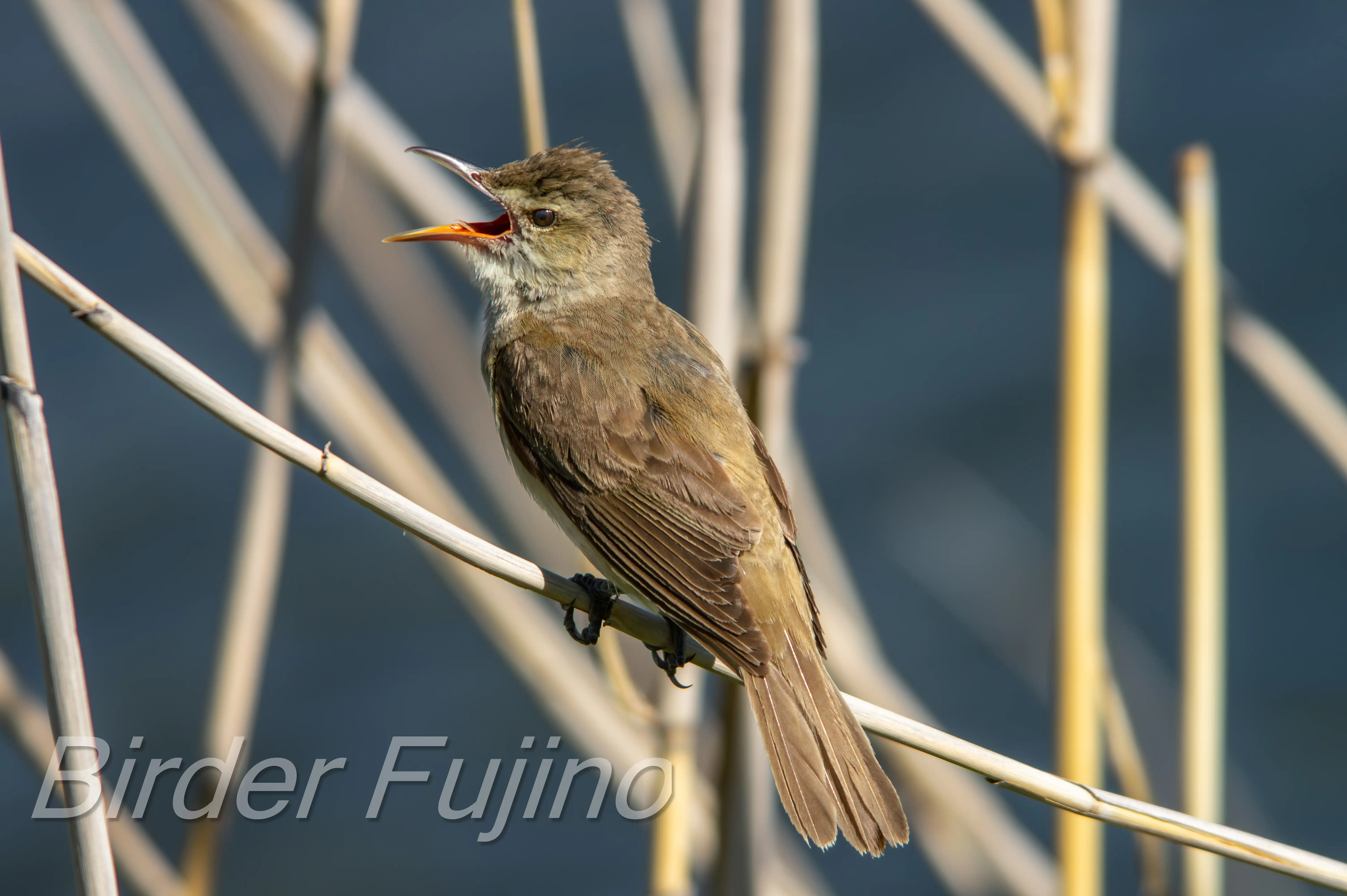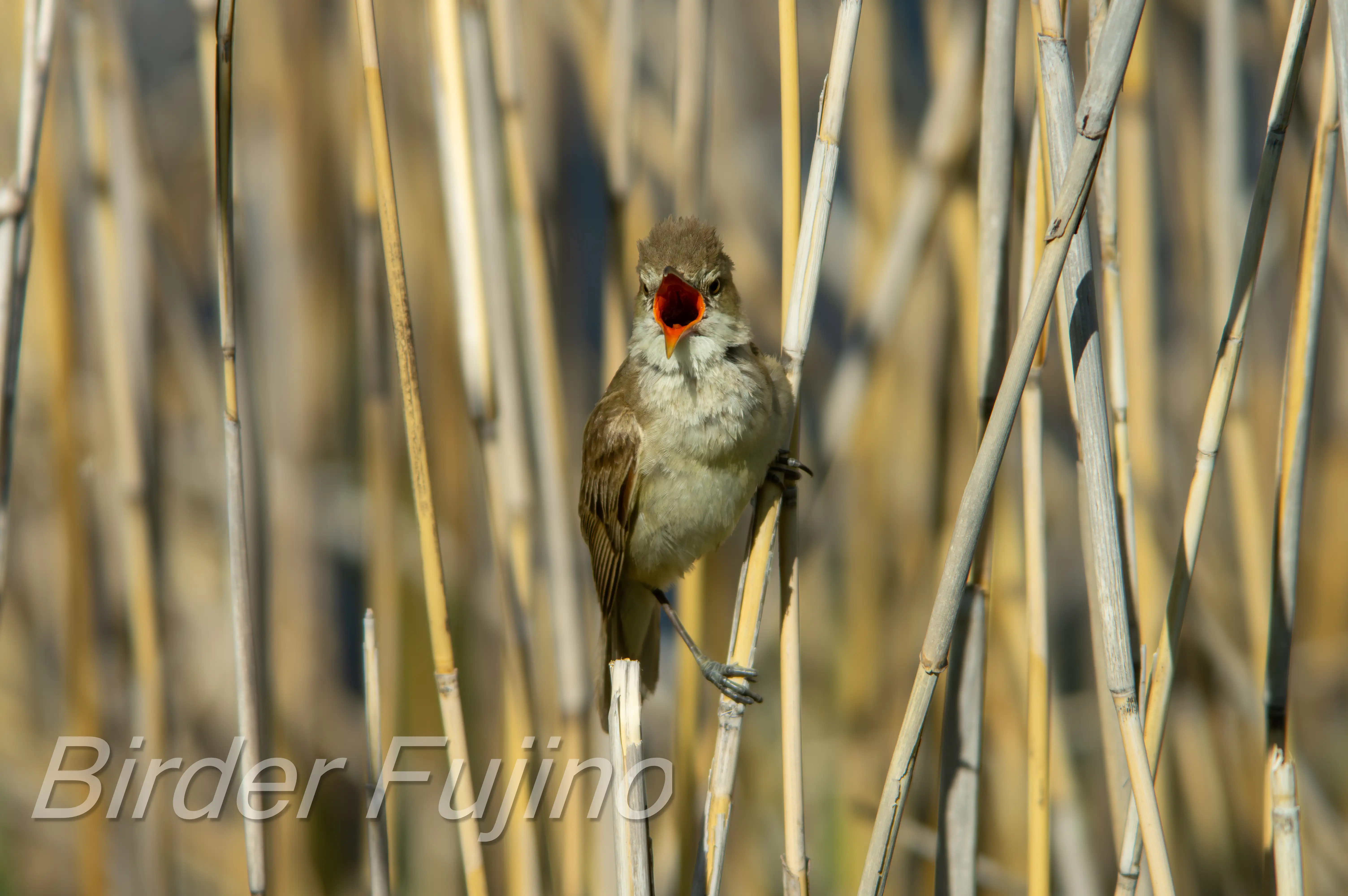 オオヨシキリの写真は何と言ってもヨシにつかまって大きく口を開けて赤い口の中を見せて鳴いている姿ですので、チャンスを逃さず撮影しましょう。