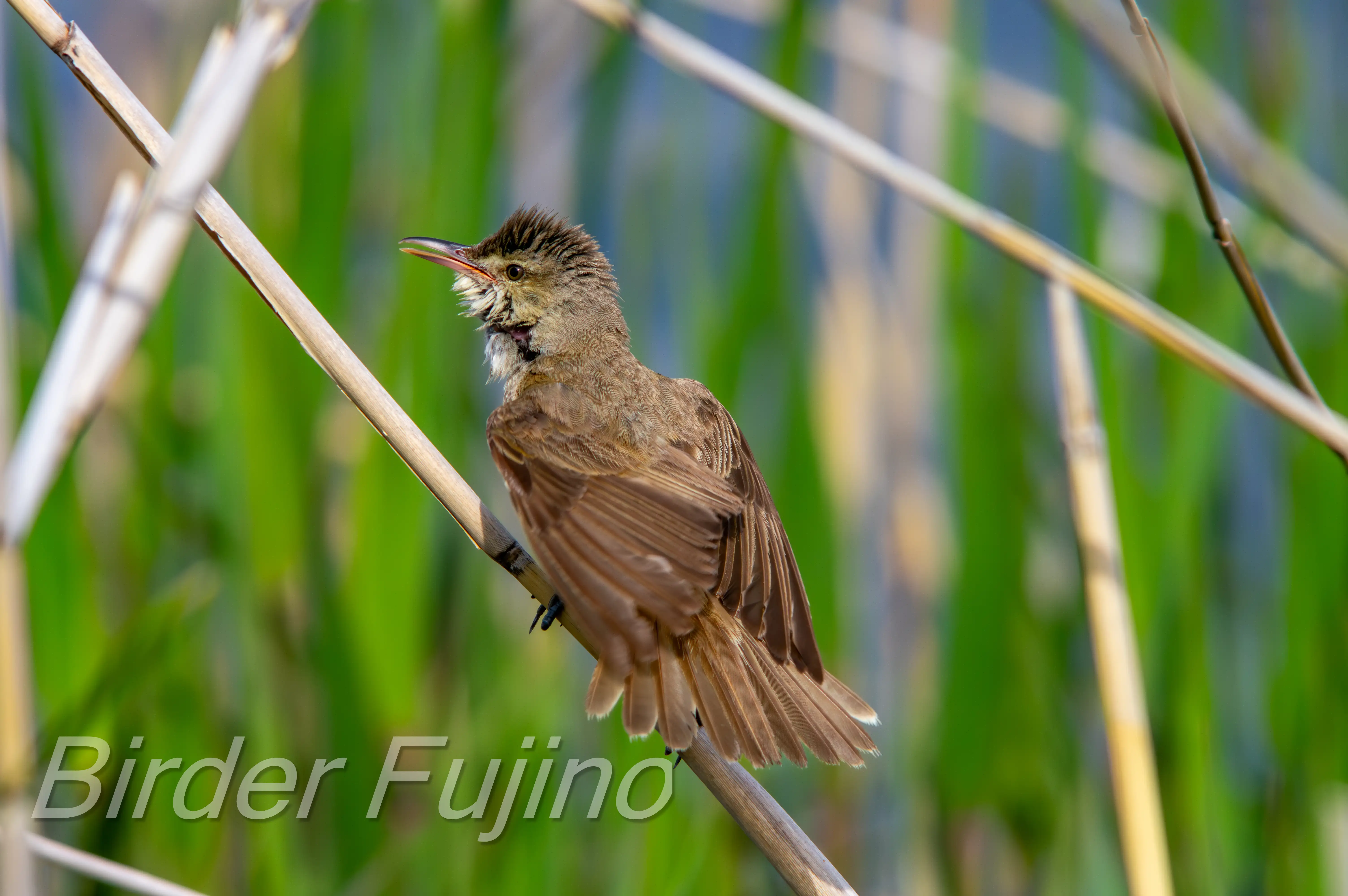 運良く近くで大きく写した写真を見ると、鳴いているオオヨシキリの開けた口の中能力赤さにびっくり! 羽の色は地味なのに、見えないところに派手な赤い色なんておしゃれな鳥です。