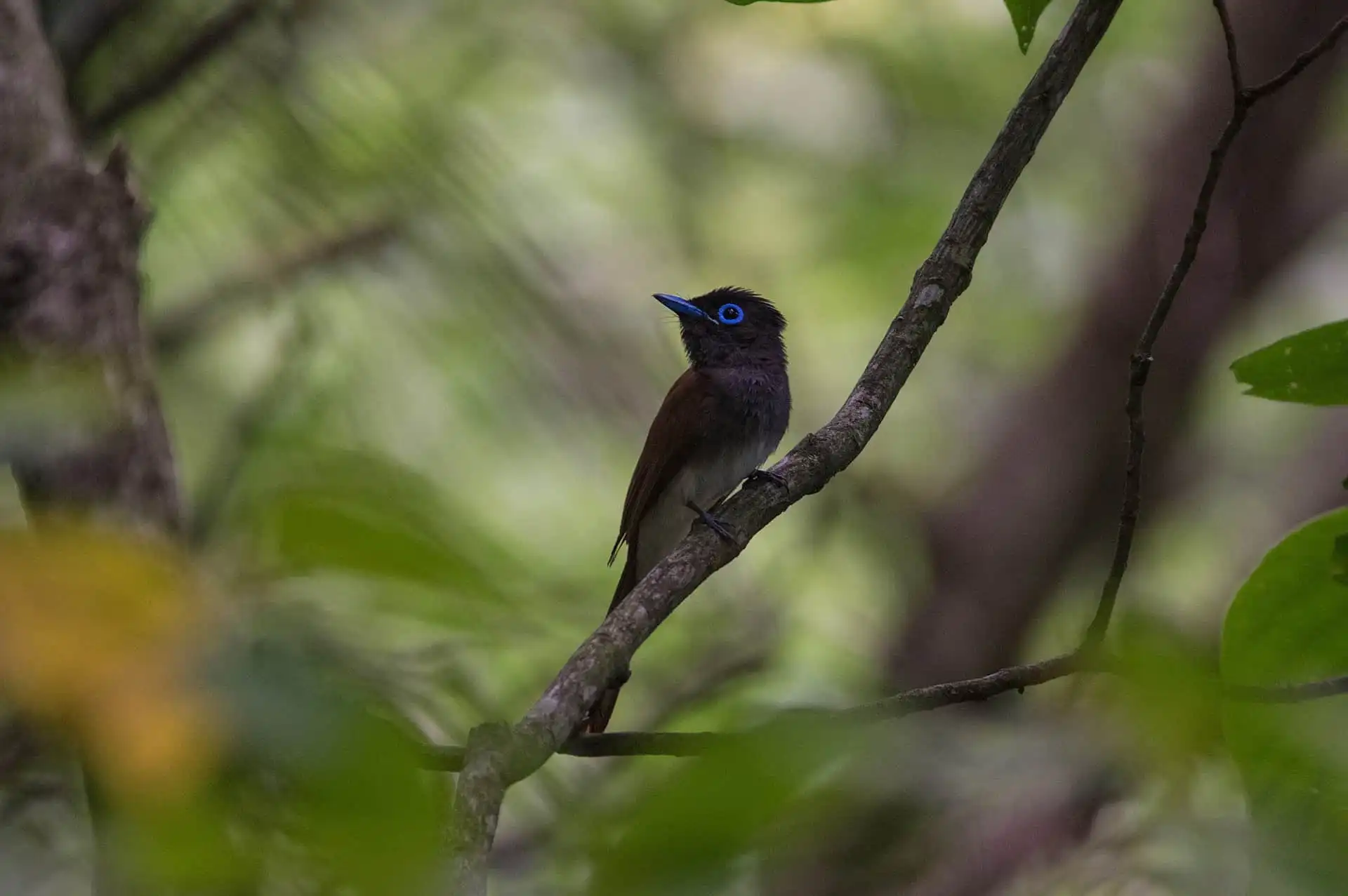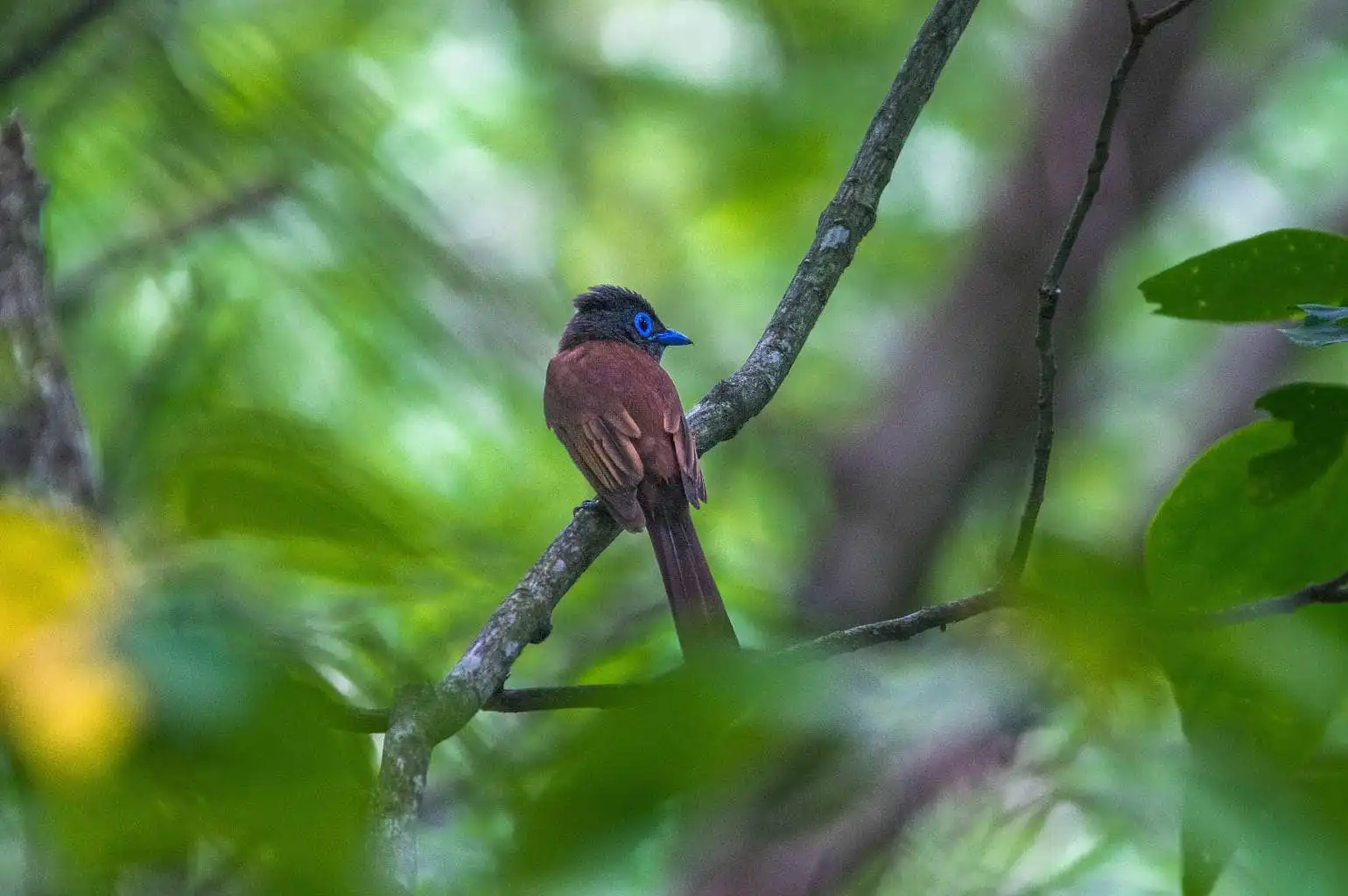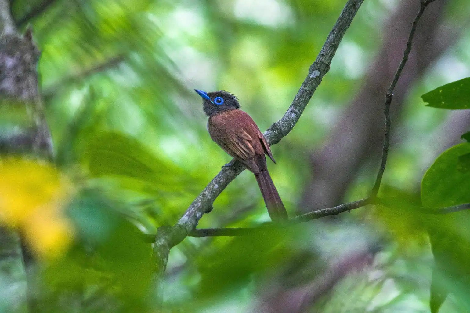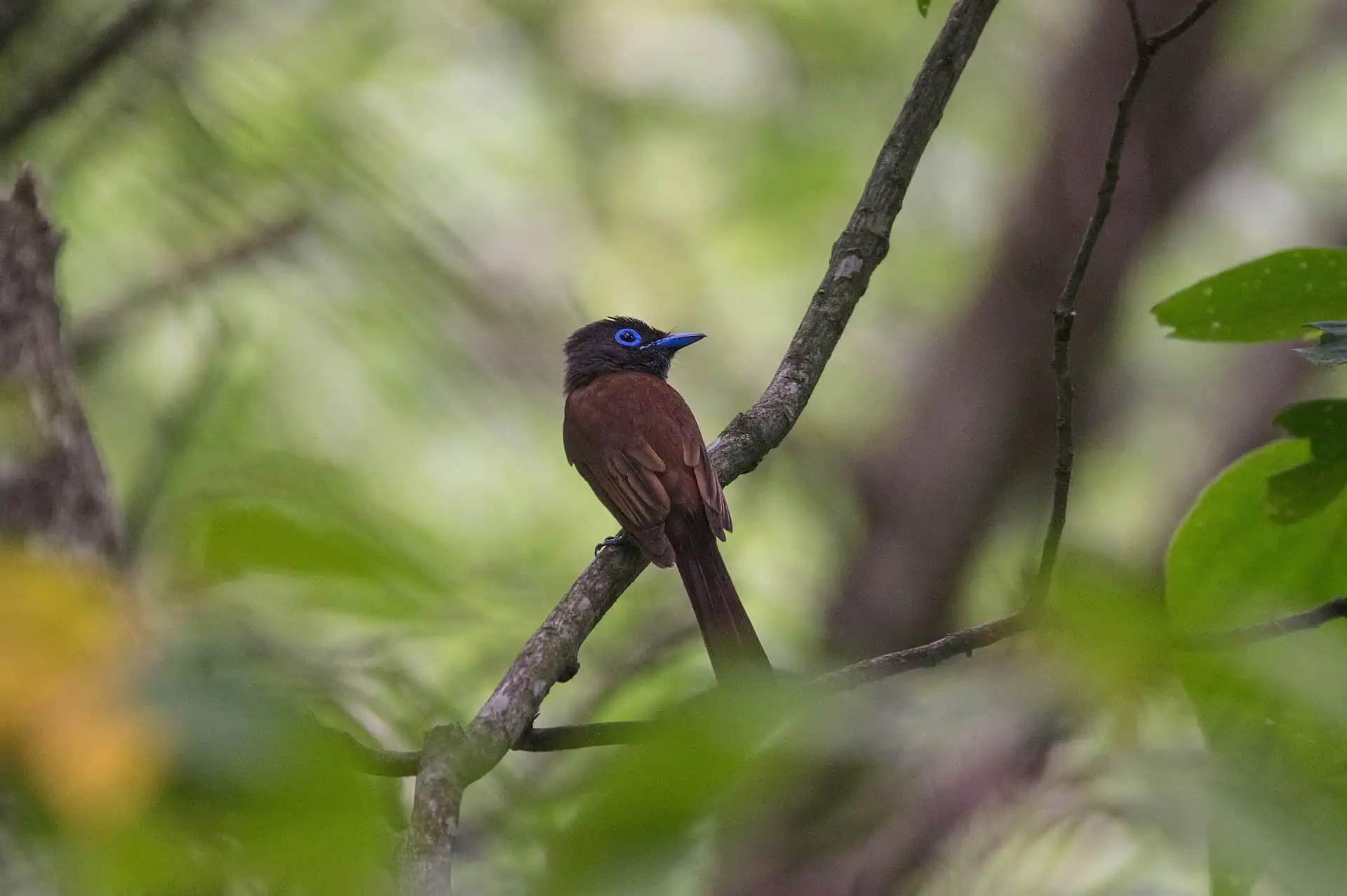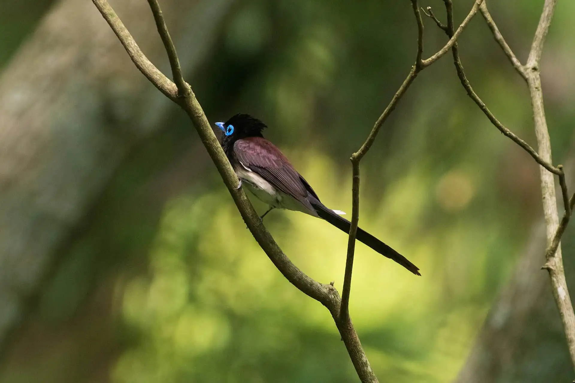 目を凝らして姿を探すと、暗い林の木の枝に止まったサンコウチョウが目に留まった。何と尾羽の長いことでしょうか。