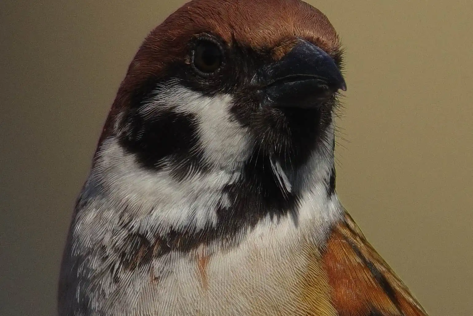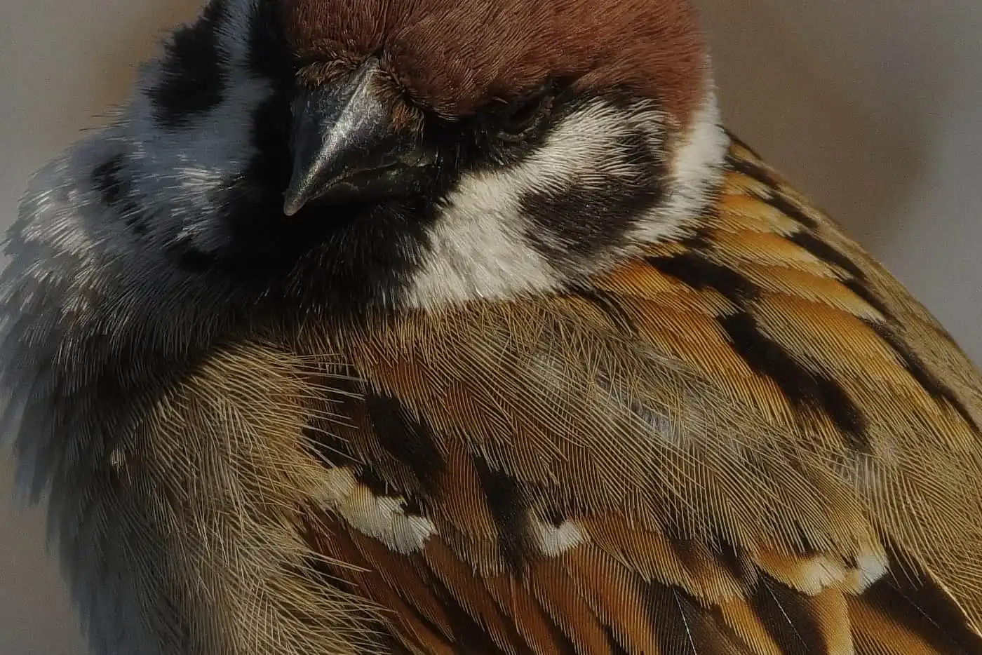 スズメは地味な野鳥と思っていましたが、写真を撮って良く見たら、むっくりした全身にほほの白い中に、黒いポイント、背側の茶色も結構色があって可愛い野鳥です。