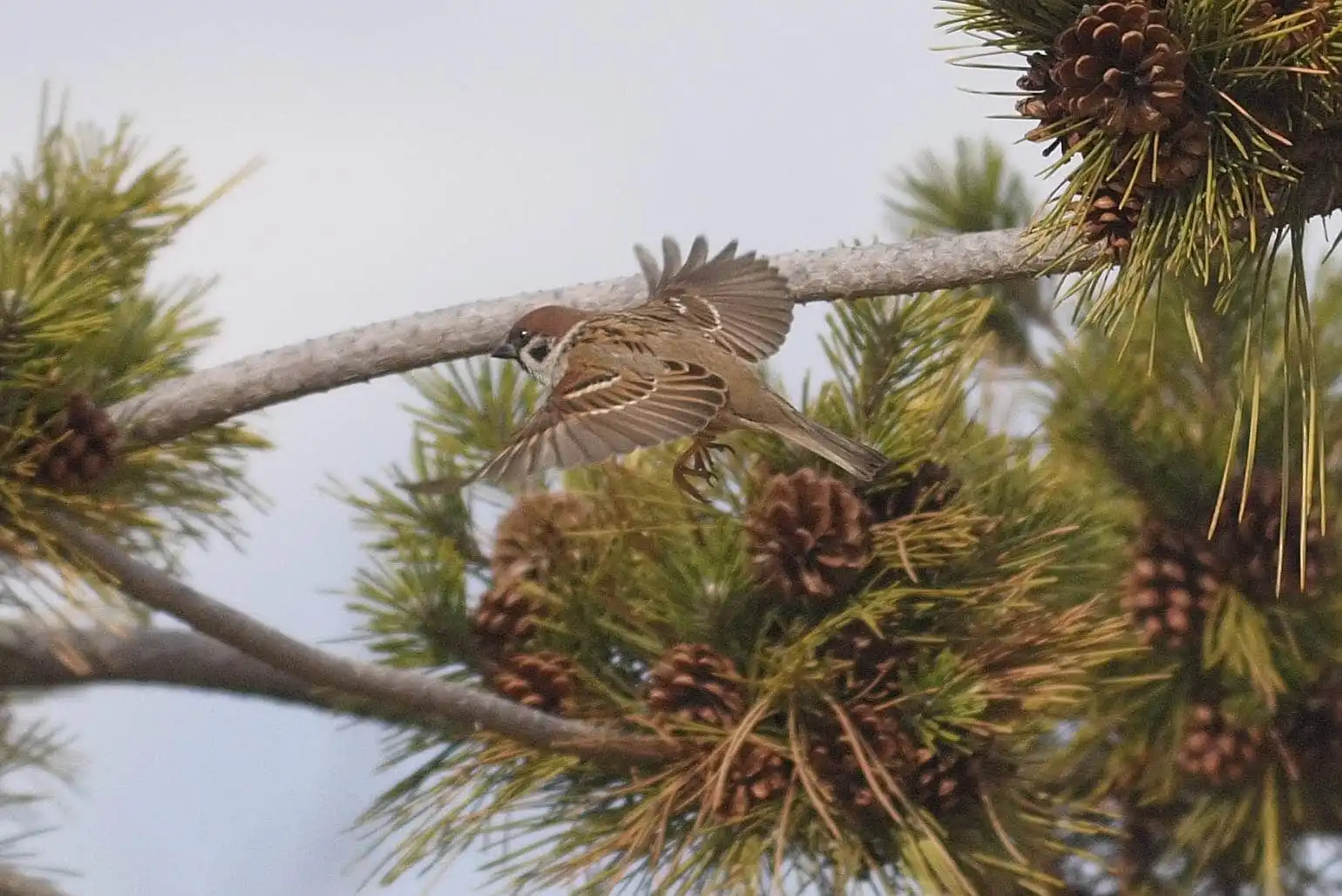 沢山のスズメが木に生っているように止まっているシーンや、地面で採餌していたスズメの群れが一斉に飛び立つシーンなどの撮影も良いと思います。