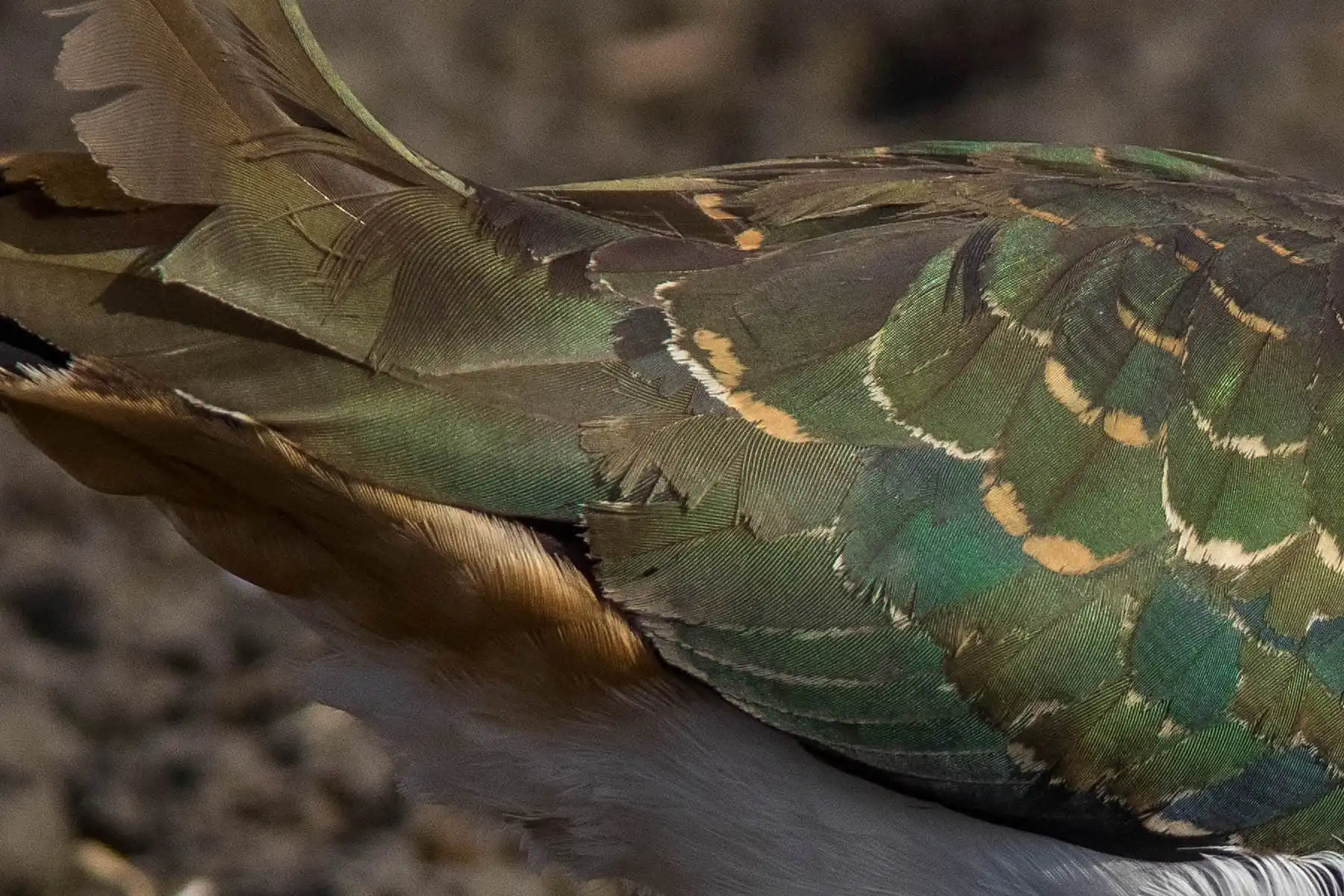 頭部の黒い冠羽が特徴。頸に黒い首輪状の斑紋。背面の光沢のある緑が美しい。腹はきれいな白。