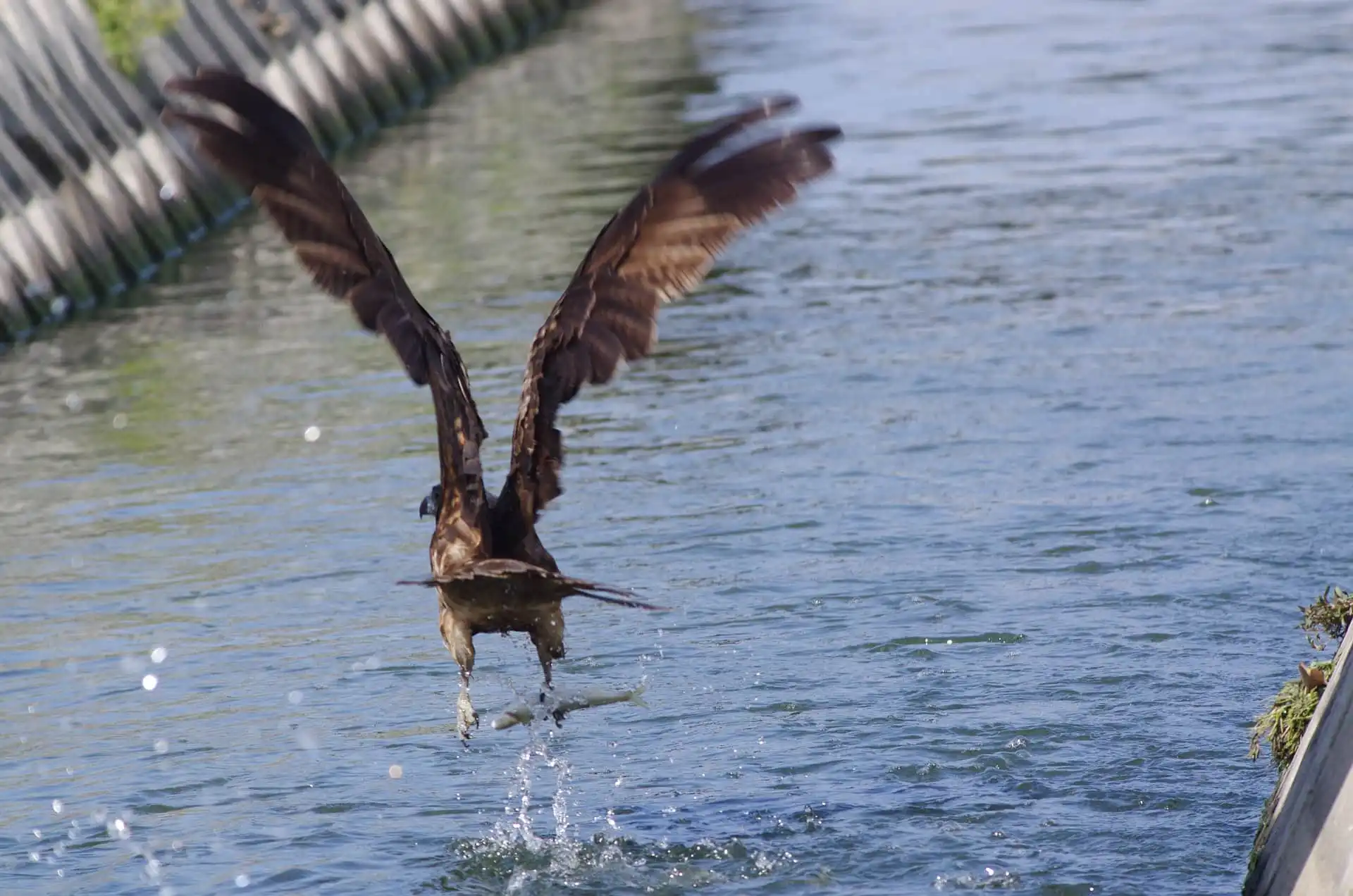 和歌山県紀ノ川沿いの田んぼの一角に、鮎の養魚場があって、朝大体決まった時間に、弱ったり死んだ鮎などを放流していて、それを目当てに トンビが舞い、アオサギ、シラサギが、用水路の縁にずらっと並んで、魚が流れて来るのを待っているのです。鮎をゲットしたトビが撮れました。