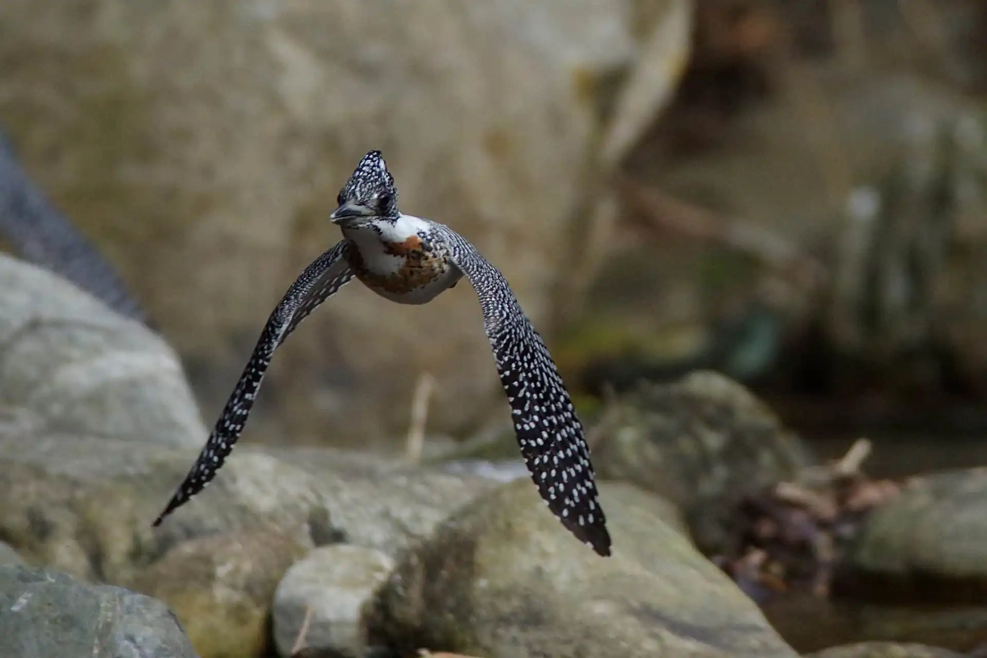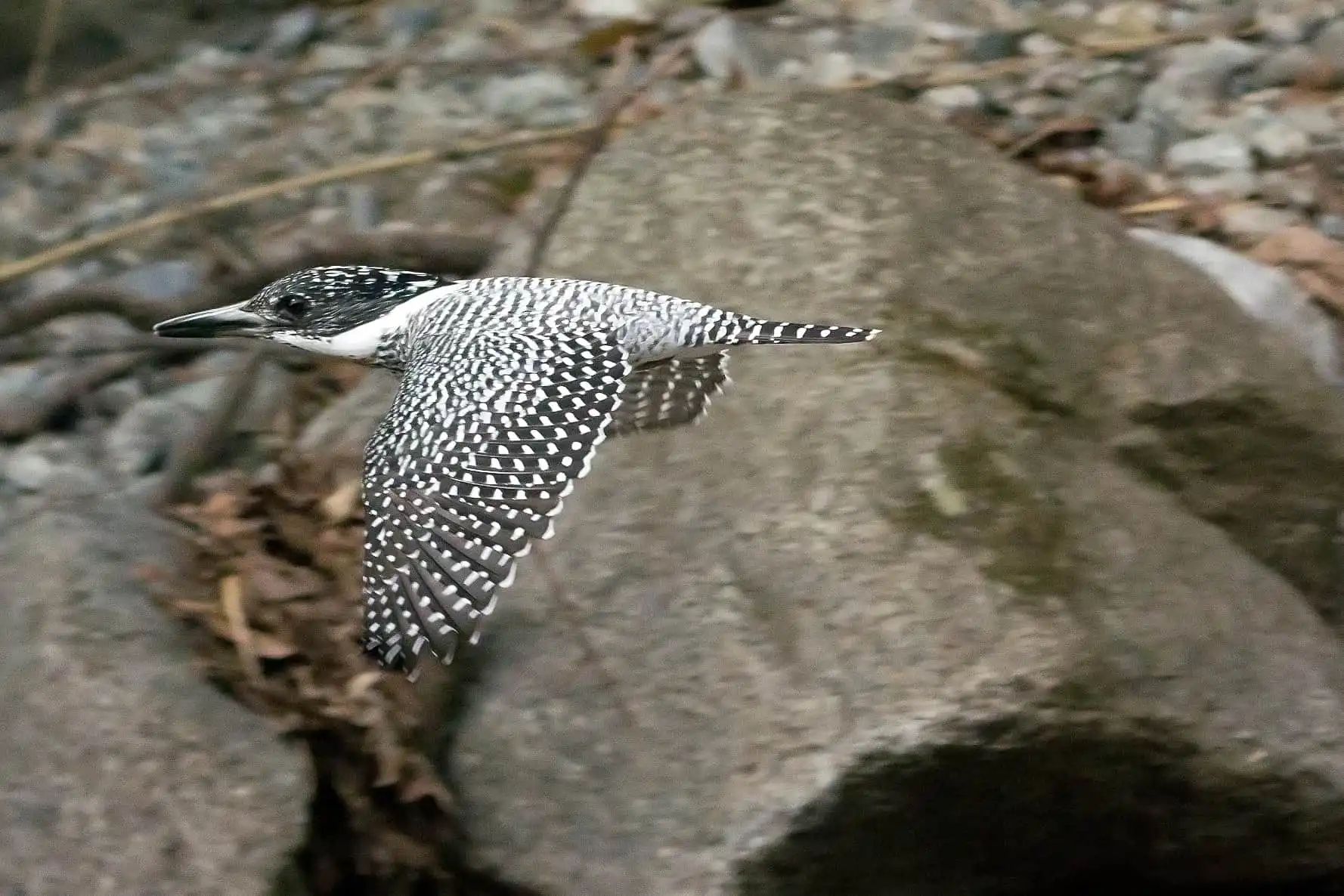 ヤマセミ飛翔写真 BORG 71FL PENTAX K-3。 観察していると概ね川のどのコースを飛ぶか行動パターンが分かってきますので、予想をして置きピンでヤマセミの横飛びを撮影できます。