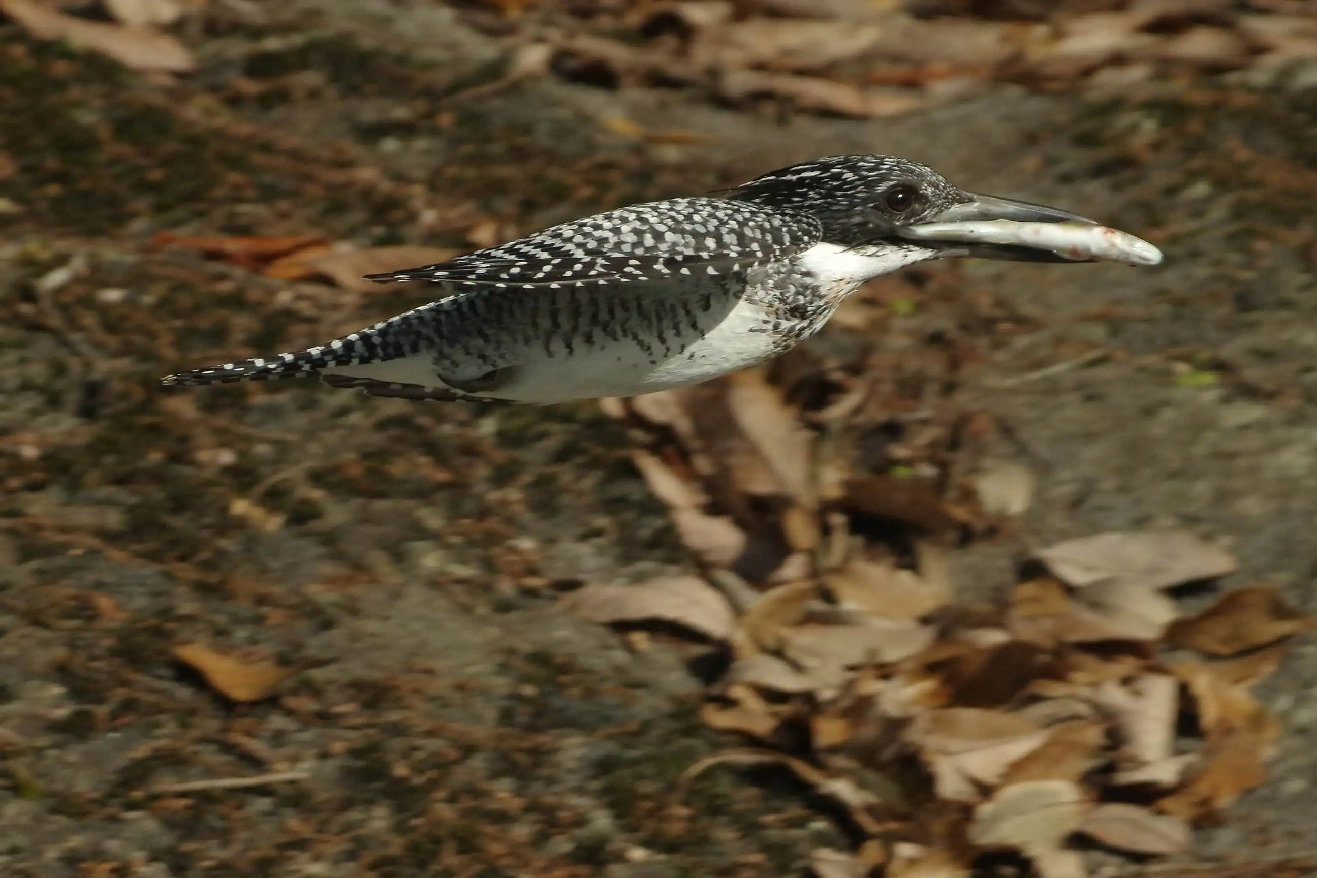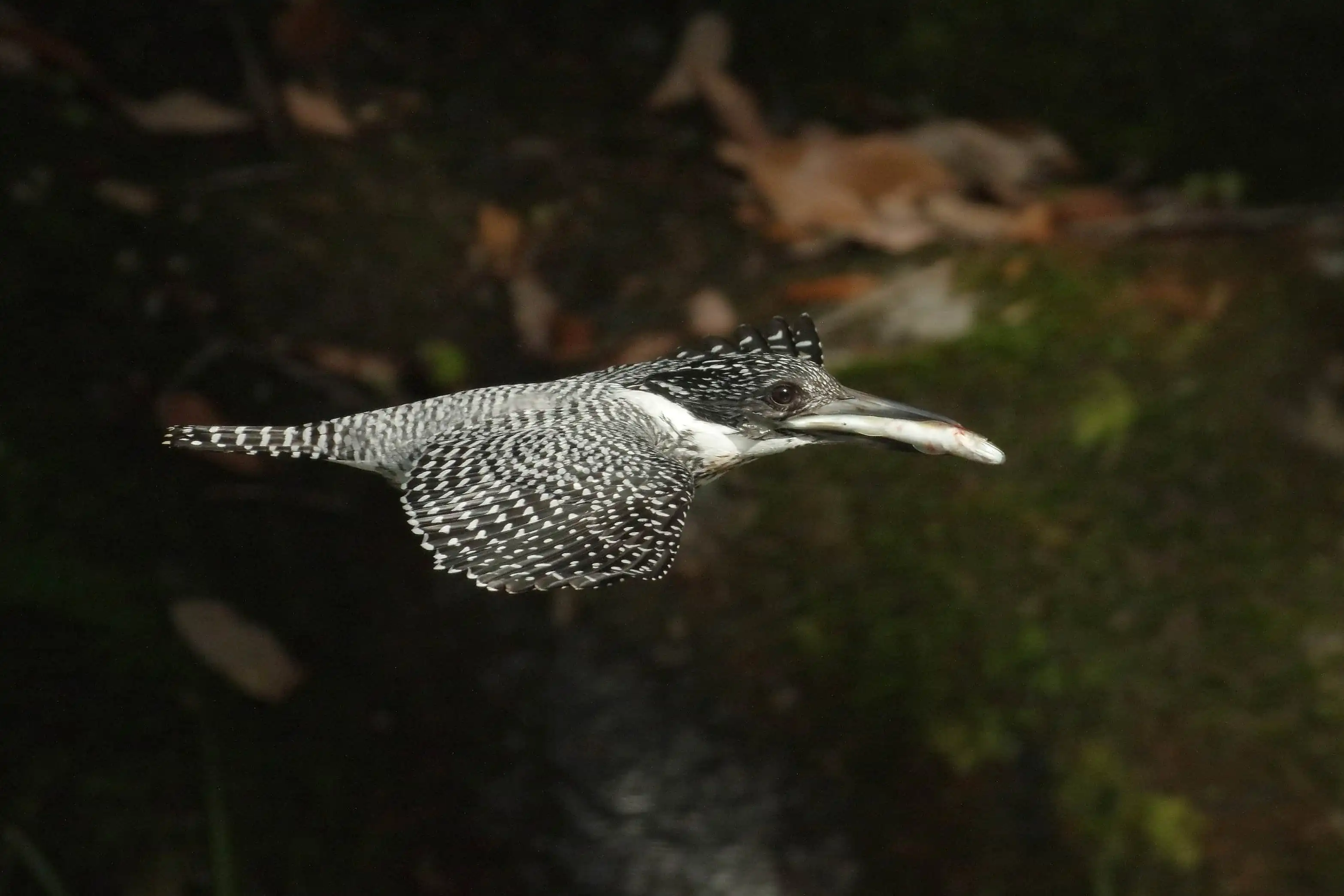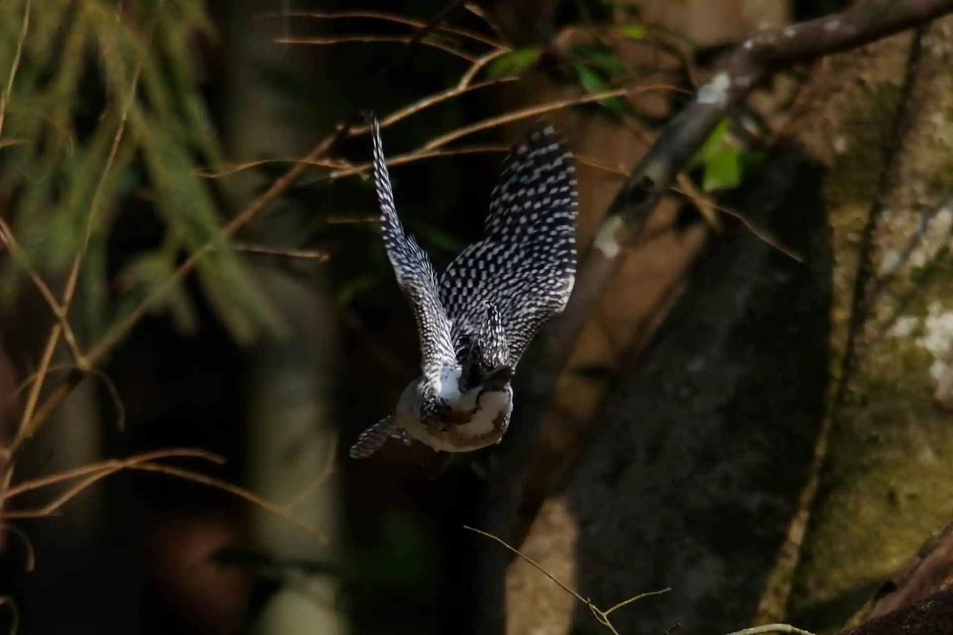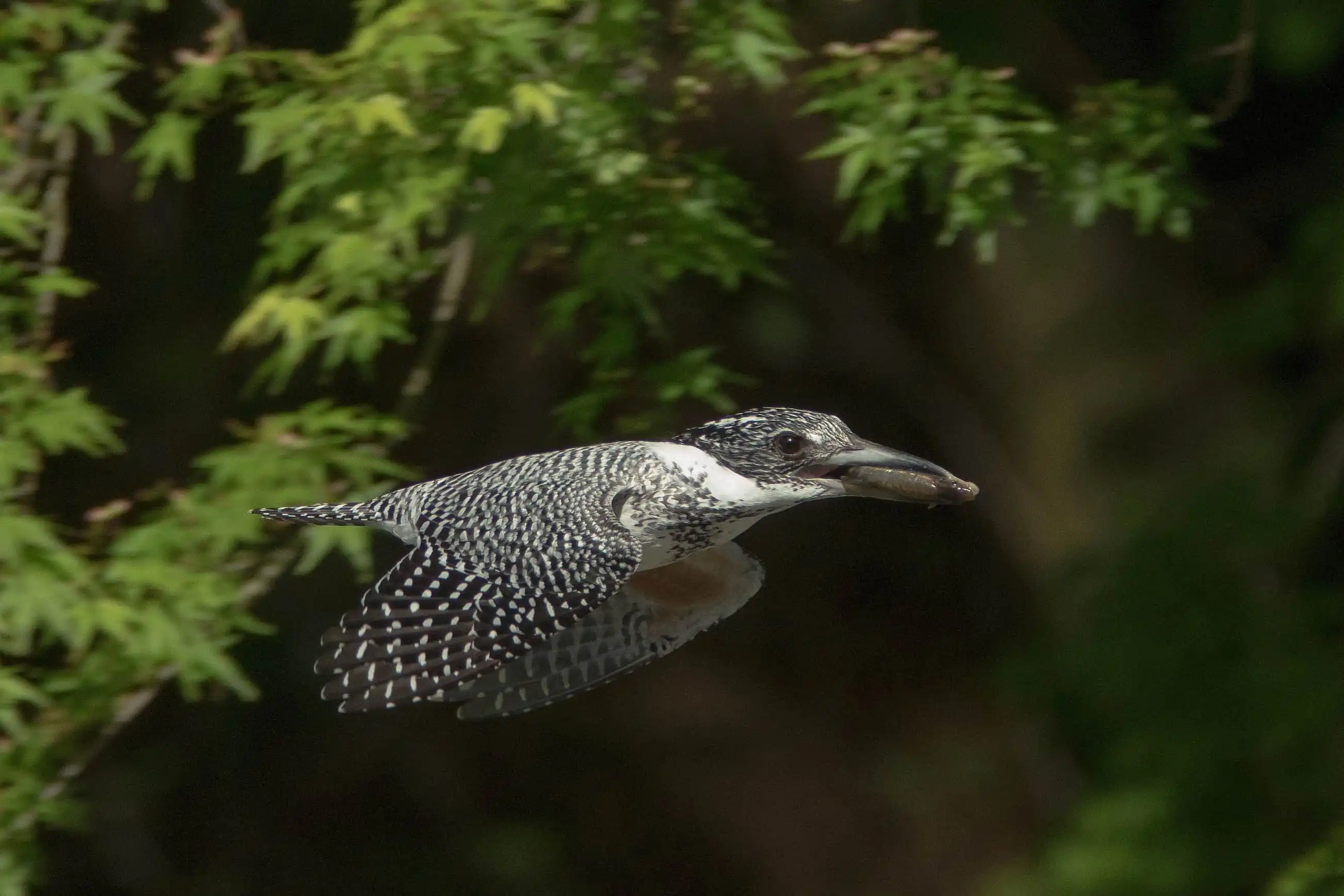 ヤマセミ飛翔写真 BORG 71FL PENTAX K-3。メスに給餌するために獲物の頭を前に咥え直して飛んで行きます。